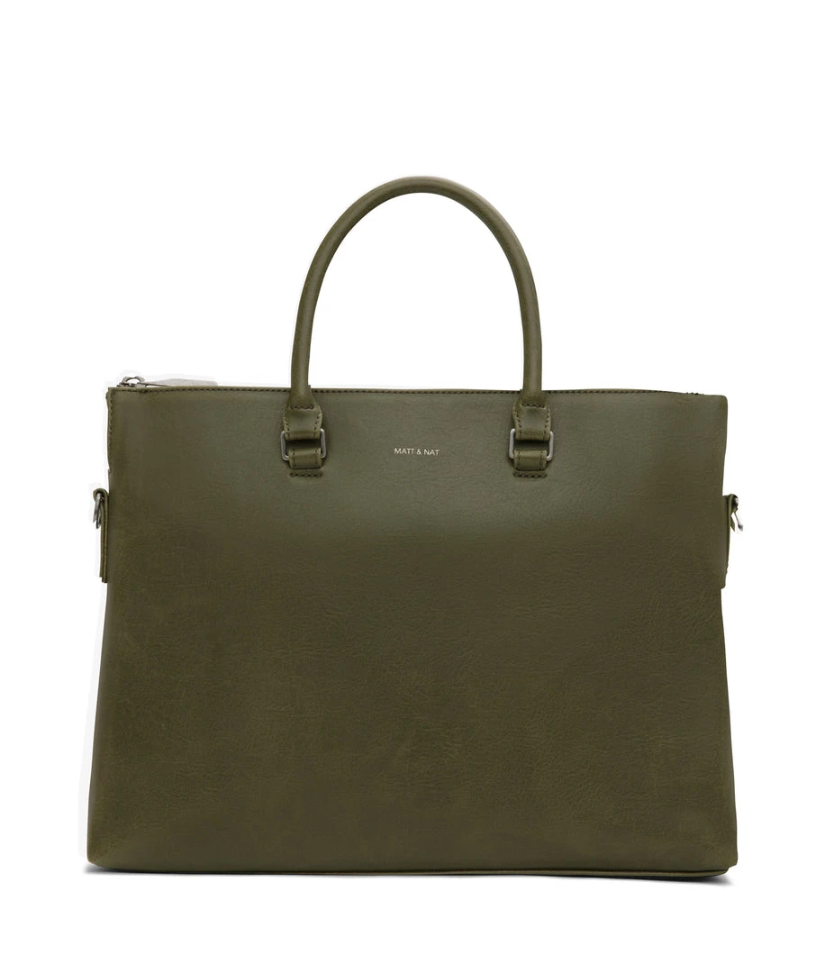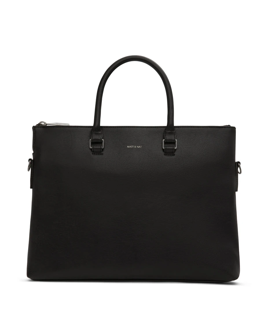 Briefcase with metal zip closure at top. Front slip compartment with magnetic snap closure. Tubular handles with square rings. Comes with a removable and adjustable crossbody strap with a standard shoulder patch. Fits a 13” laptop.