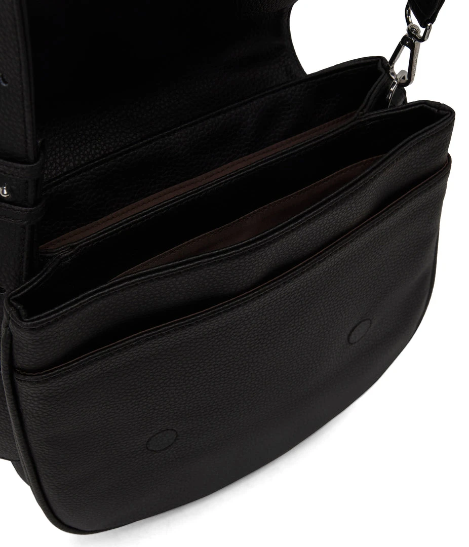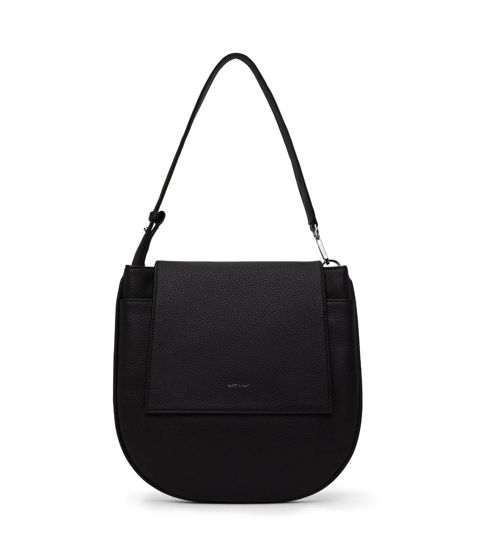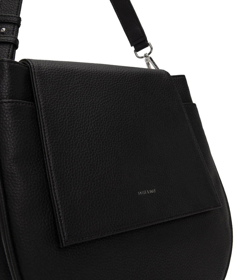 Slim shoulder bag with adjustable strap, flap closure with double compartment and a front slip pocket. Comes with an extra adjustable crossbody strap.