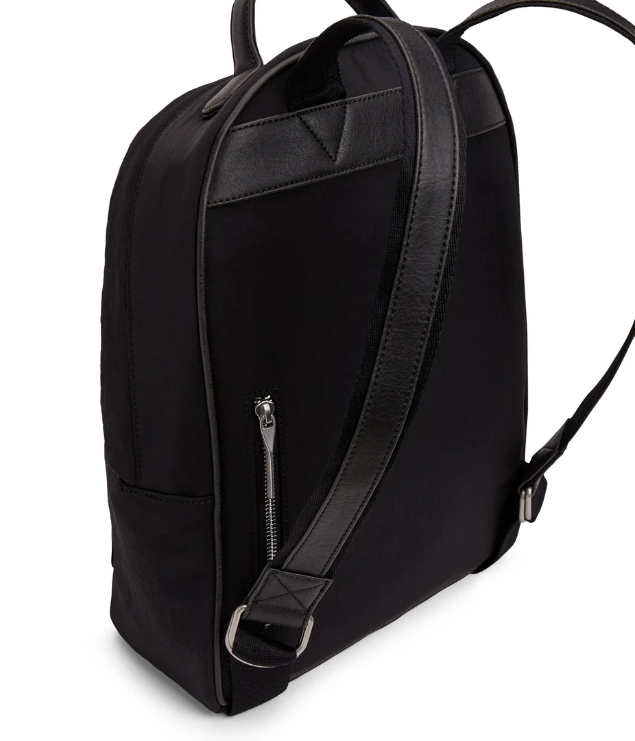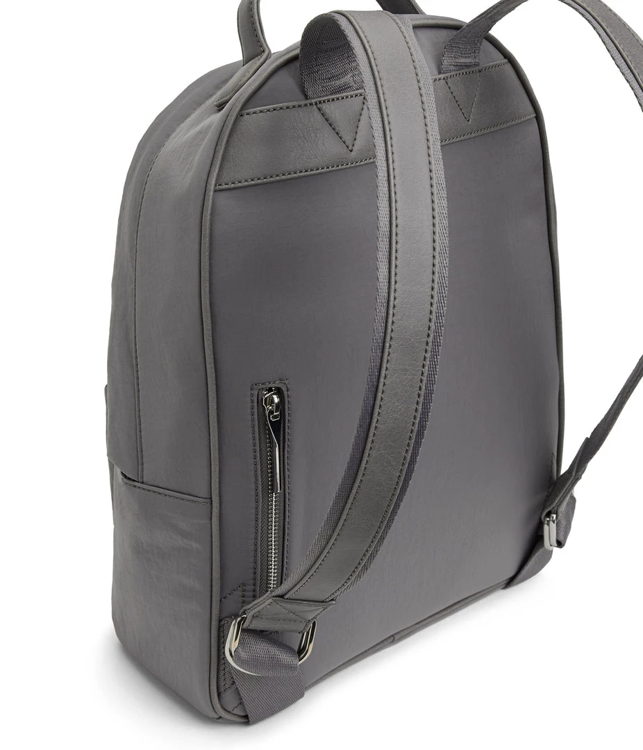 Backpack with adjustable straps and main zipper closure. Front zipper pocket. Small zipper pocket on the back for security. Fits a 13” laptop.