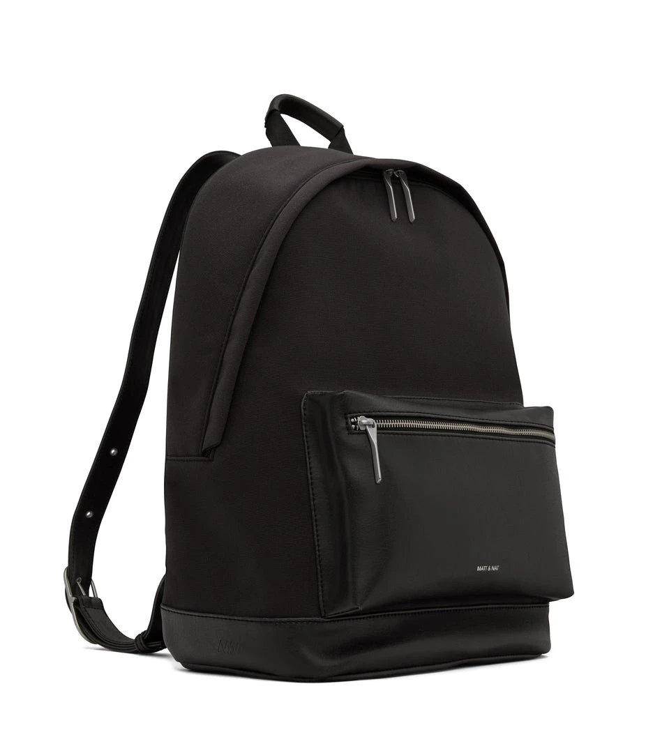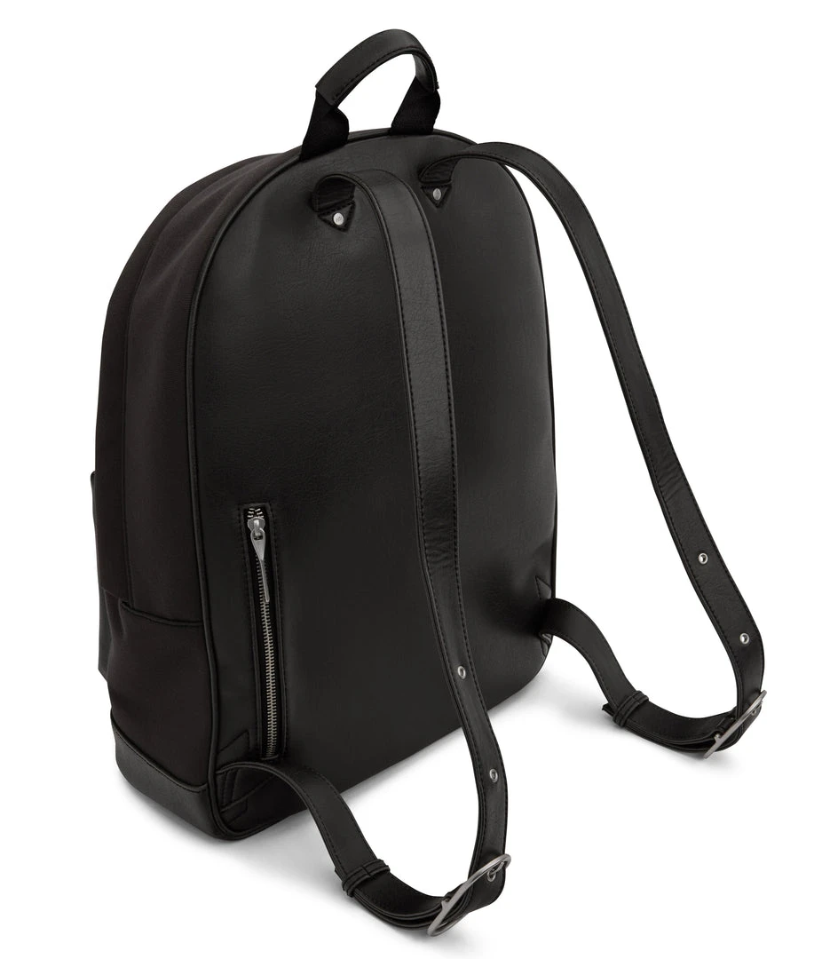 Backpack with adjustable shoulder straps and top main zipper closure. Front zipper pocket. Zipper pocket on back body. Fits a 15” laptop.