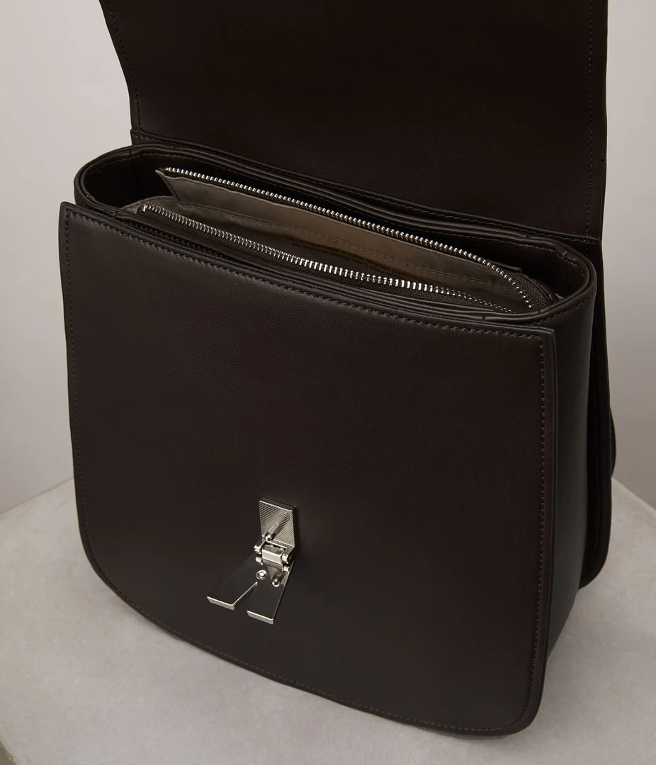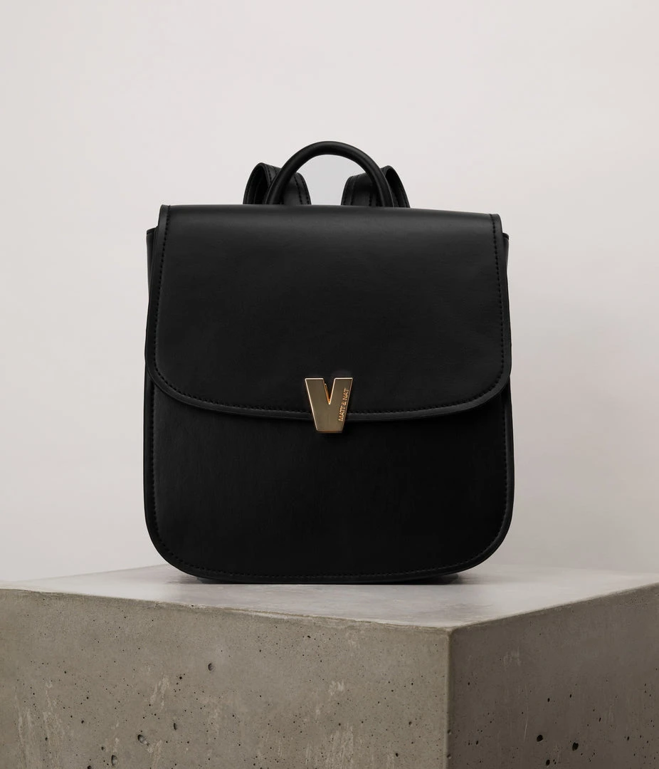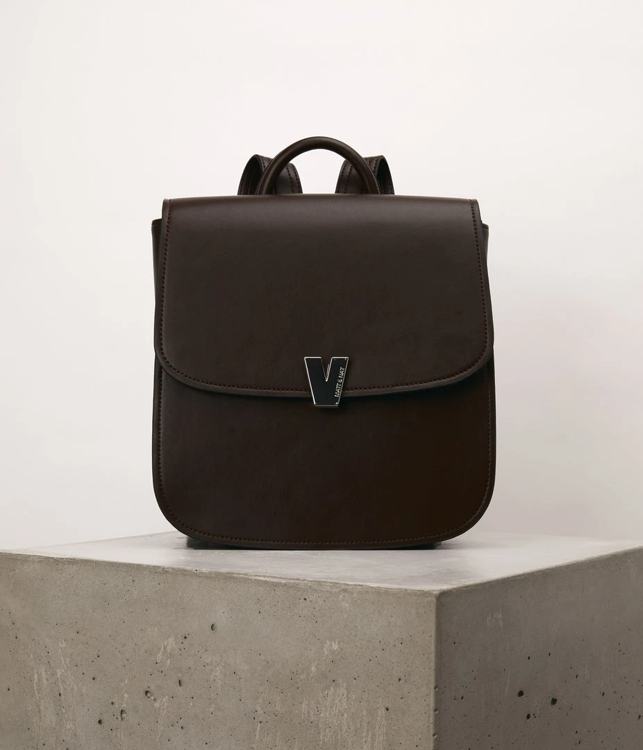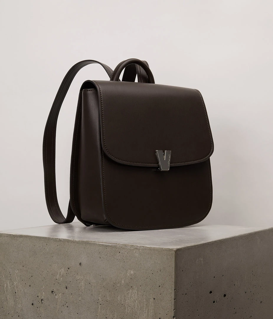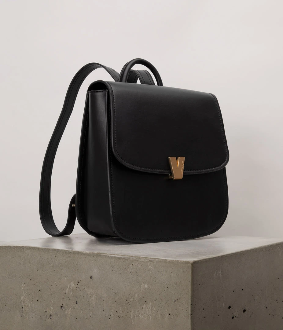 Backpack with flap closure and flip-lock, zipper opening at inside for security, card slot at the exterior back, top handle to hand-carry, and adjustable back straps.