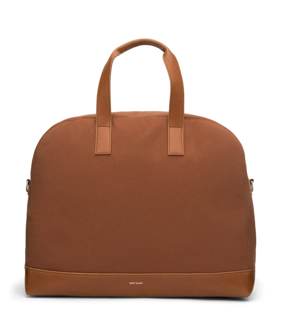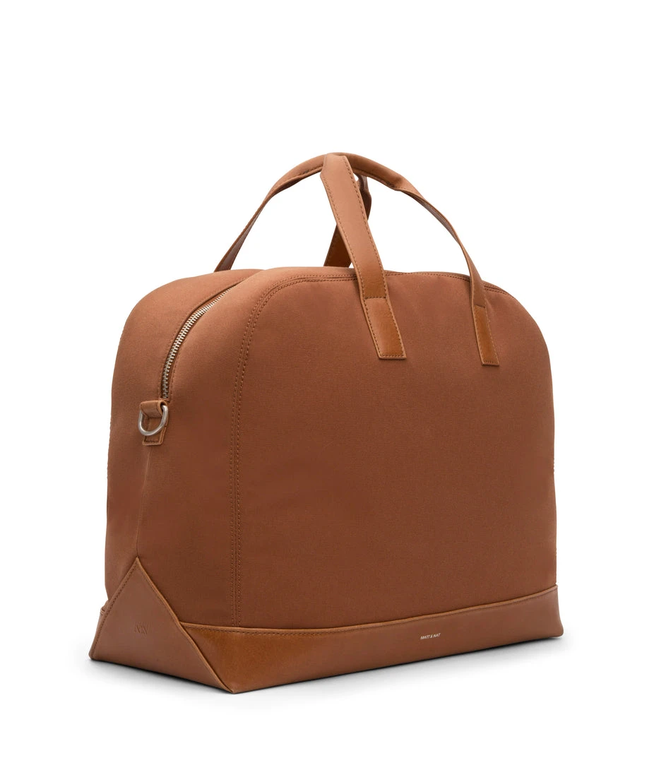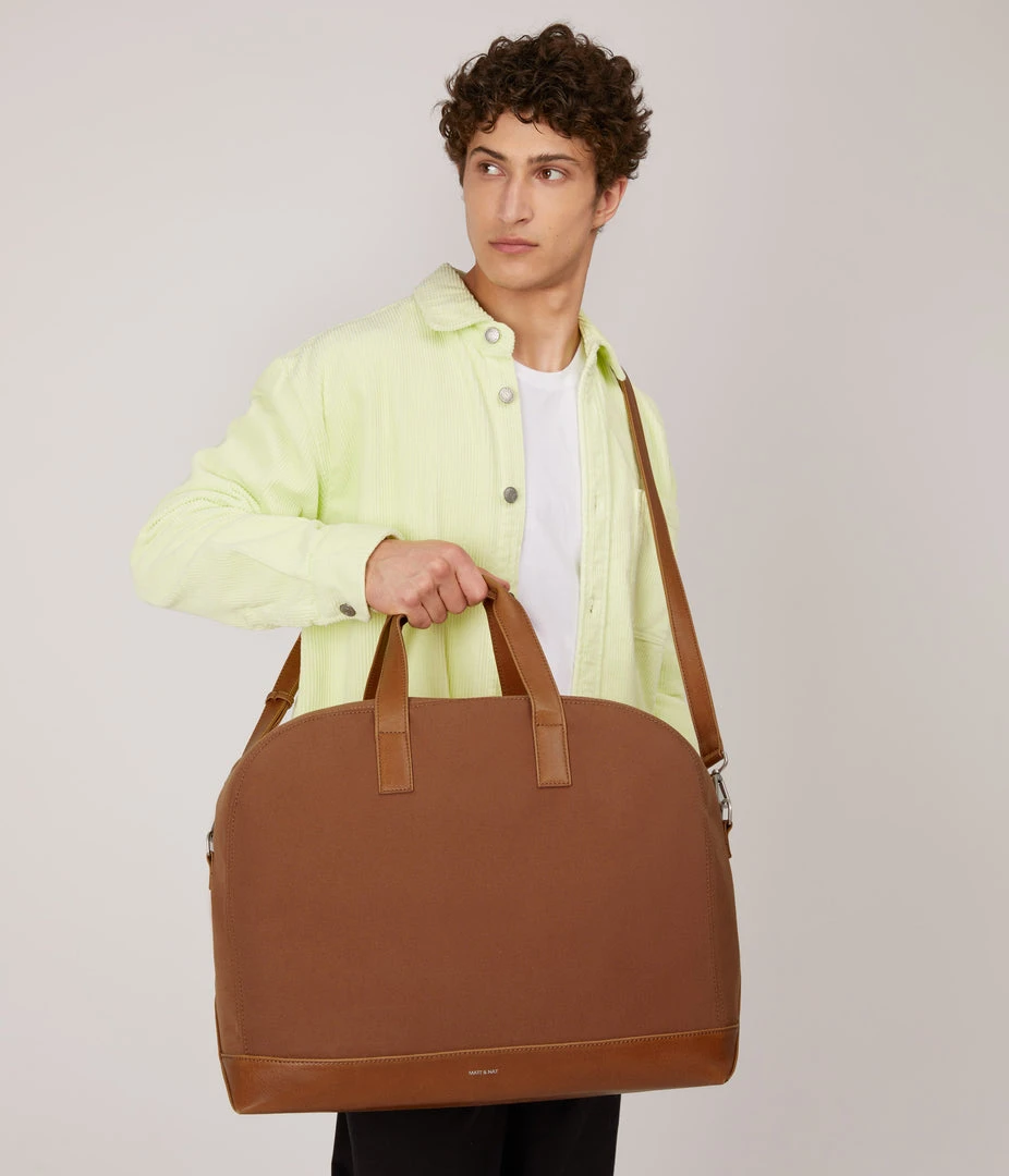 Weekender bag with adjustable and removable crossbody strap. Top main zipper closure.