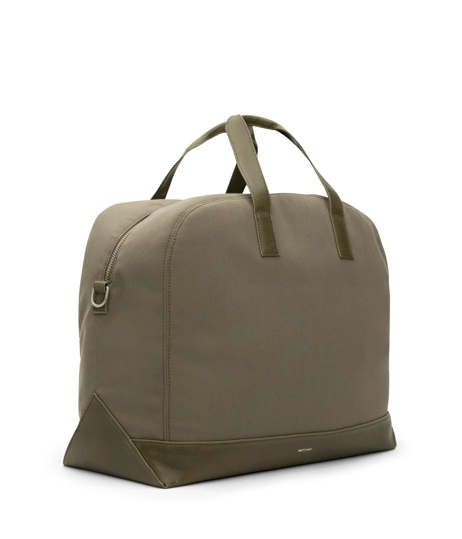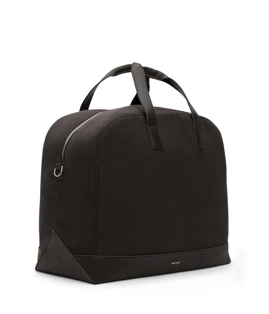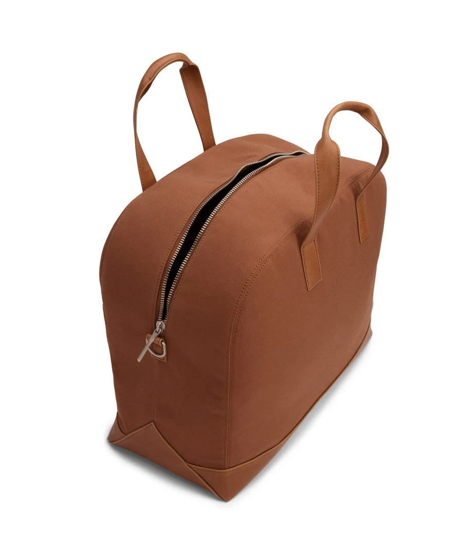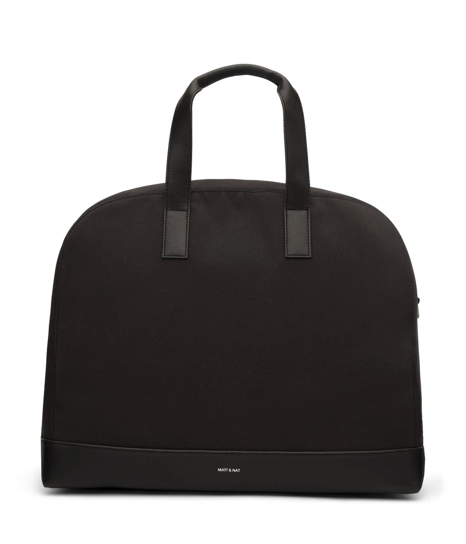 Weekender bag with adjustable and removable crossbody strap. Top main zipper closure.
