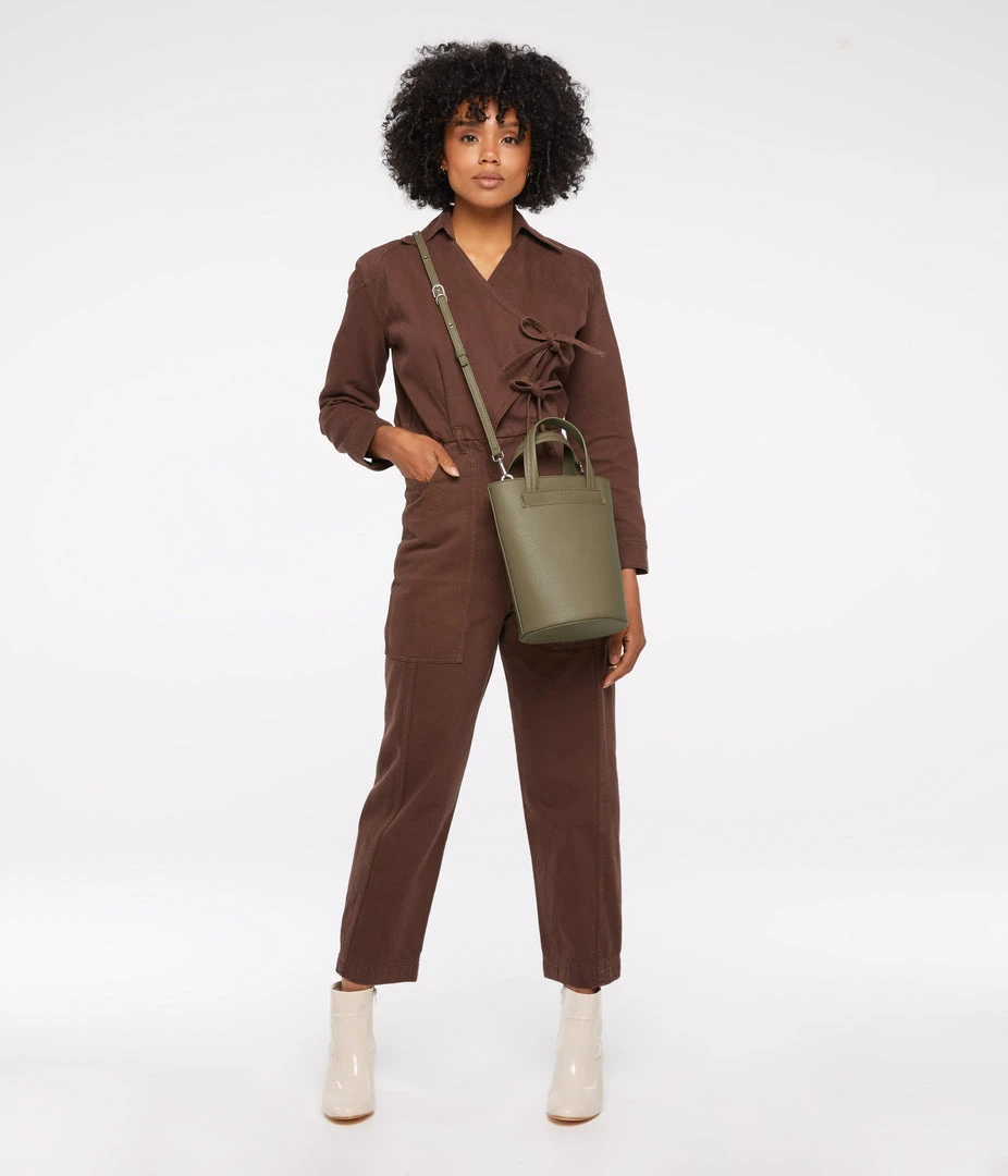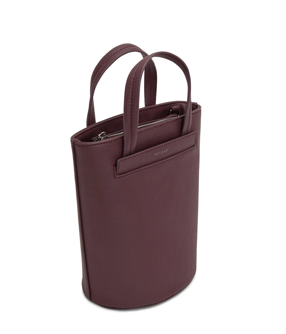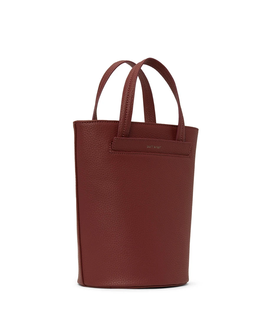 Bucket crossbody bag with zipper closure and exterior front slip pocket. Comes with a detachable and adjustable crossbody strap.