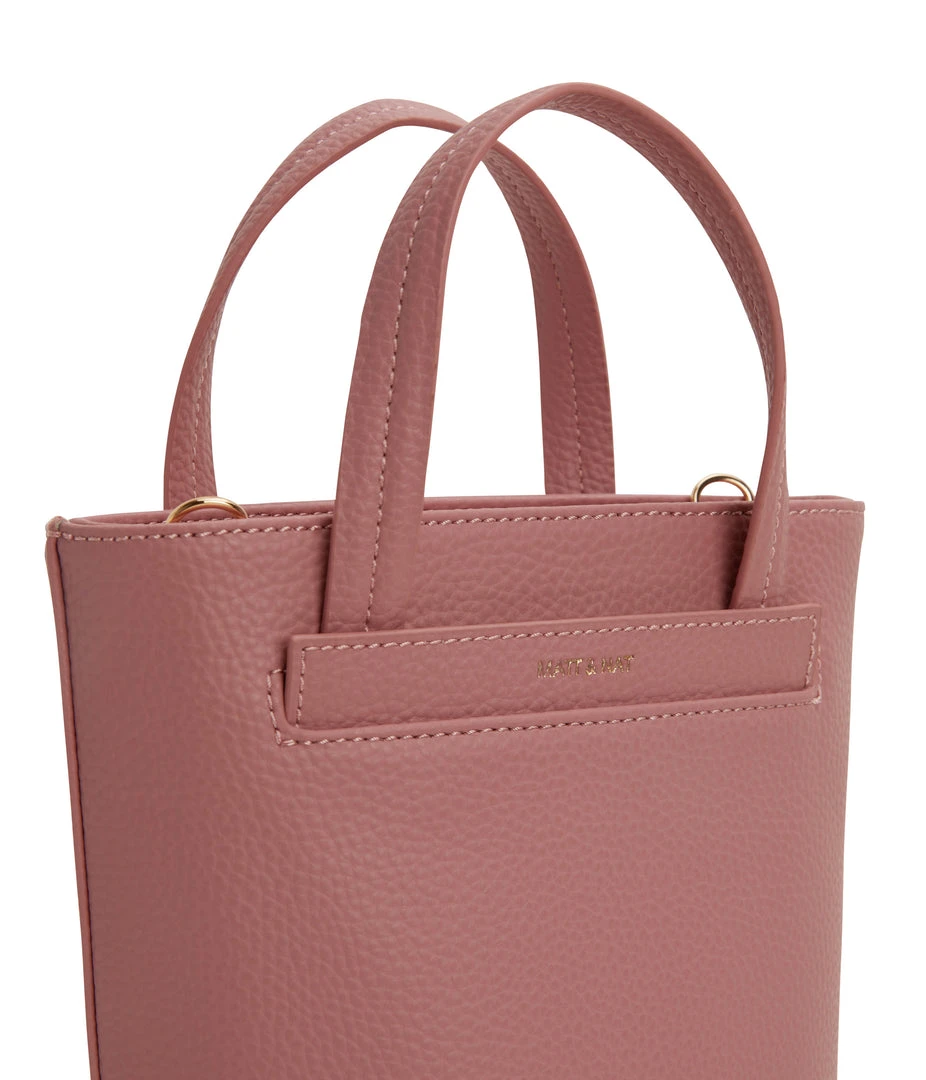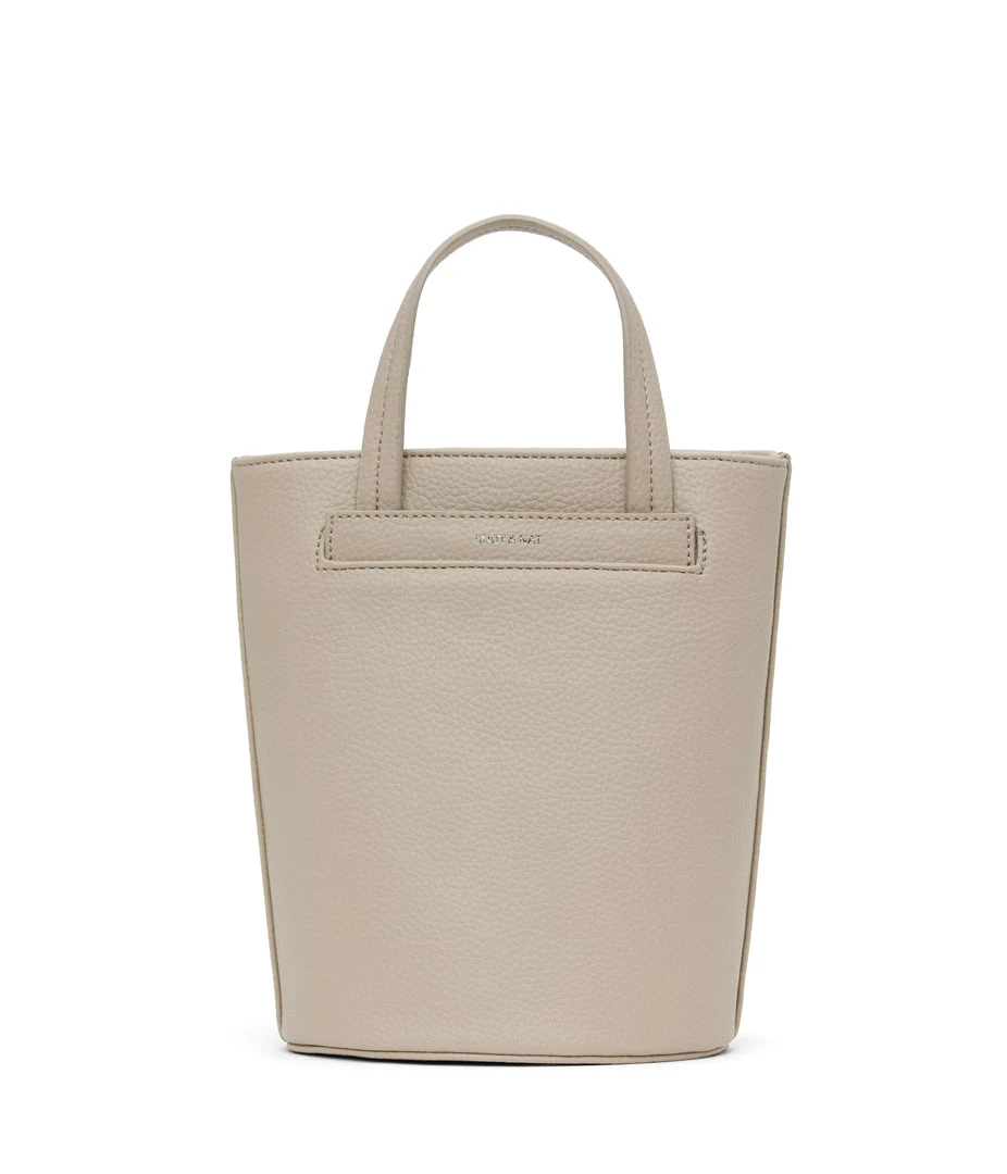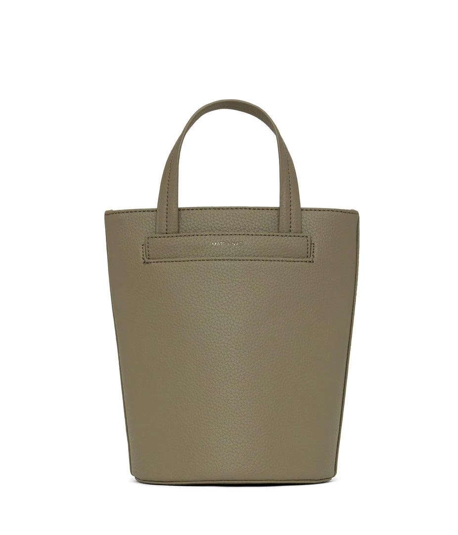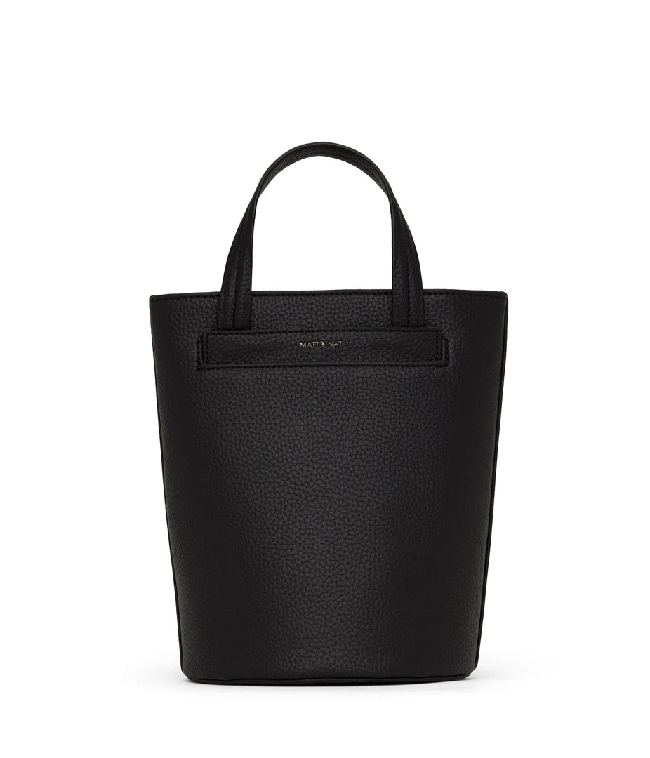 Bucket crossbody bag with zipper closure and exterior front slip pocket. Comes with a detachable and adjustable crossbody strap.