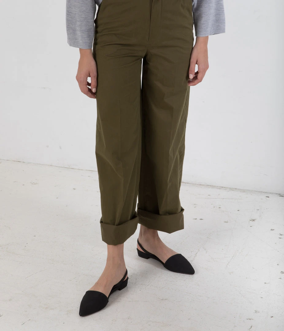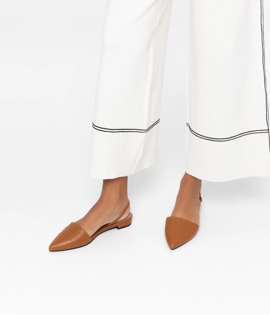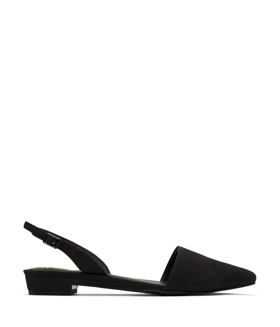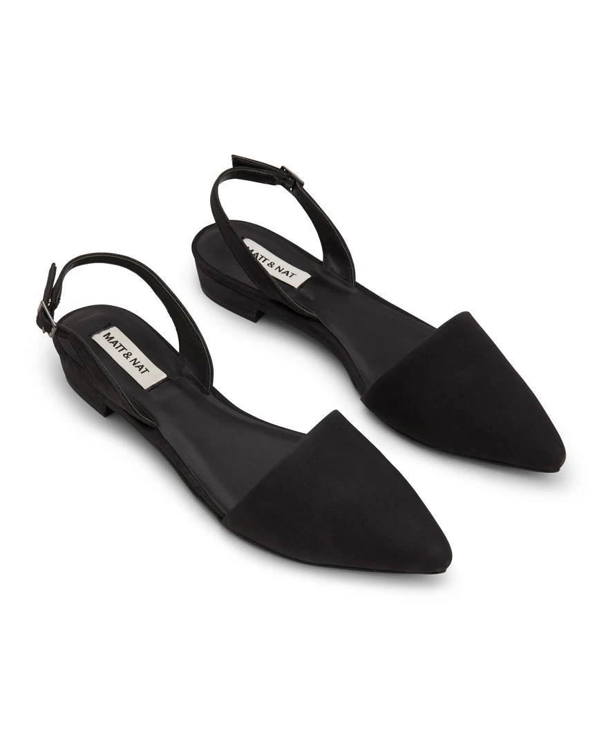 Pointed toe sling back flat on a micro wedge construction offered in our new vegan suede and vegan leather.