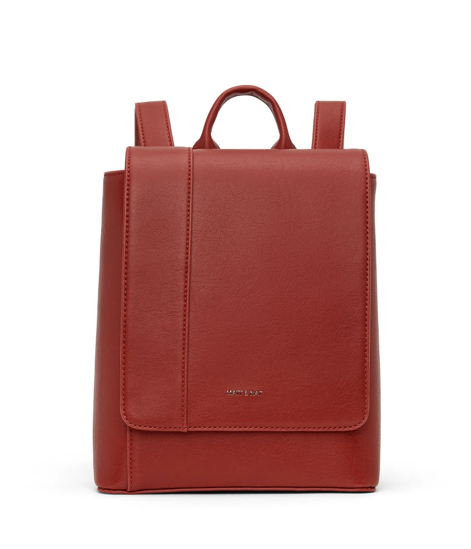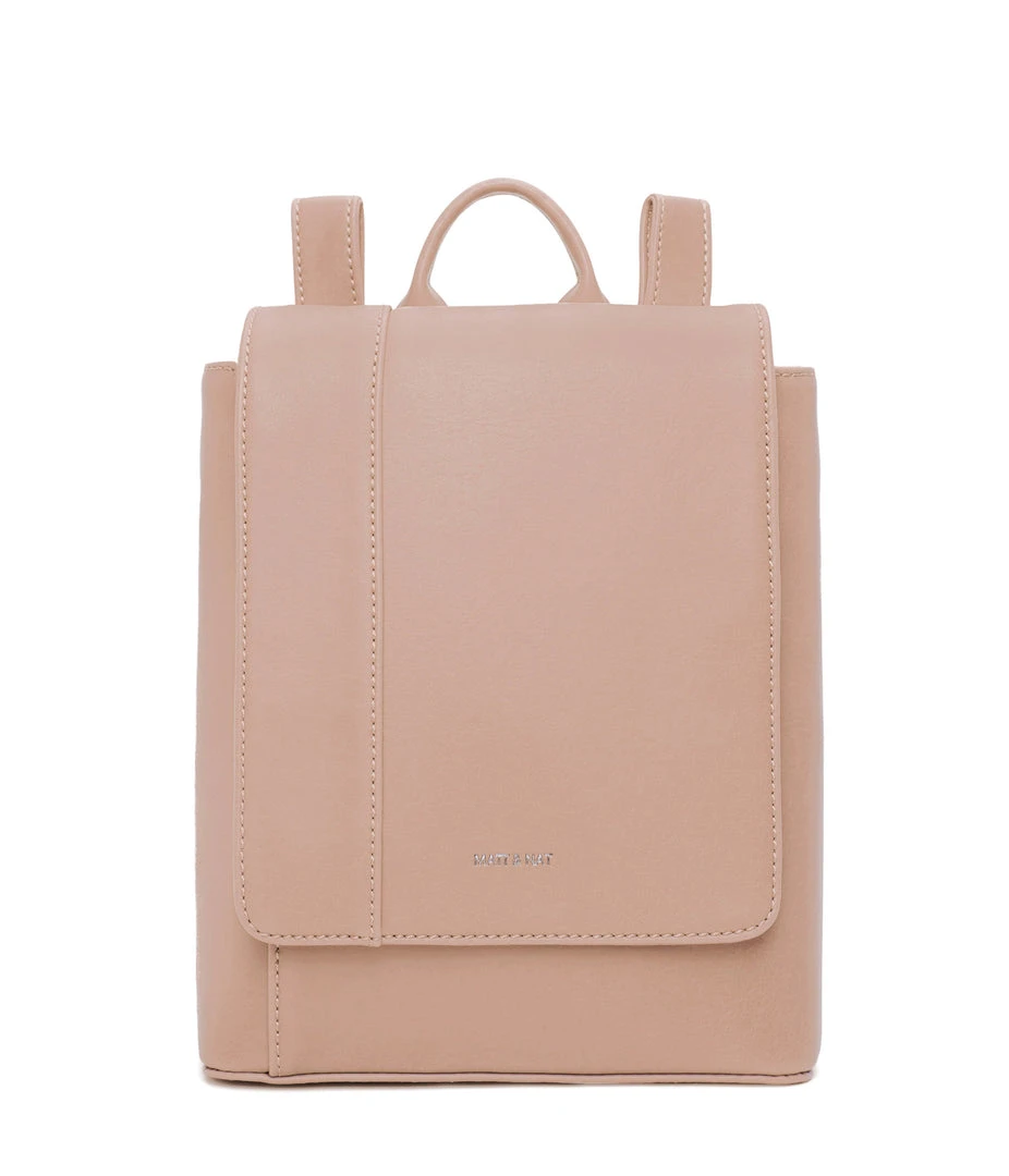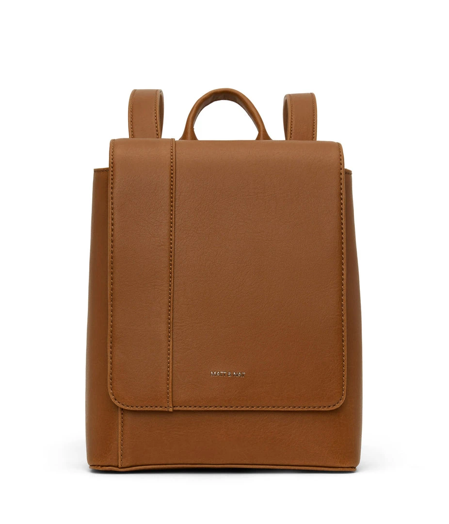 Small backpack with a top handle, flap with hidden magnetic snaps and zipper closure at interior top. Adjustable back straps.