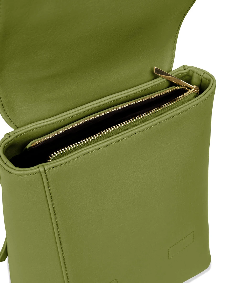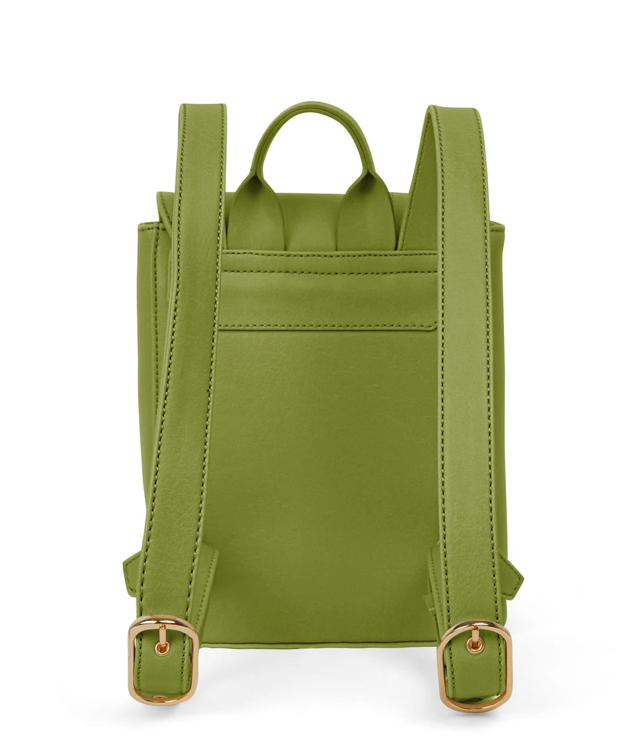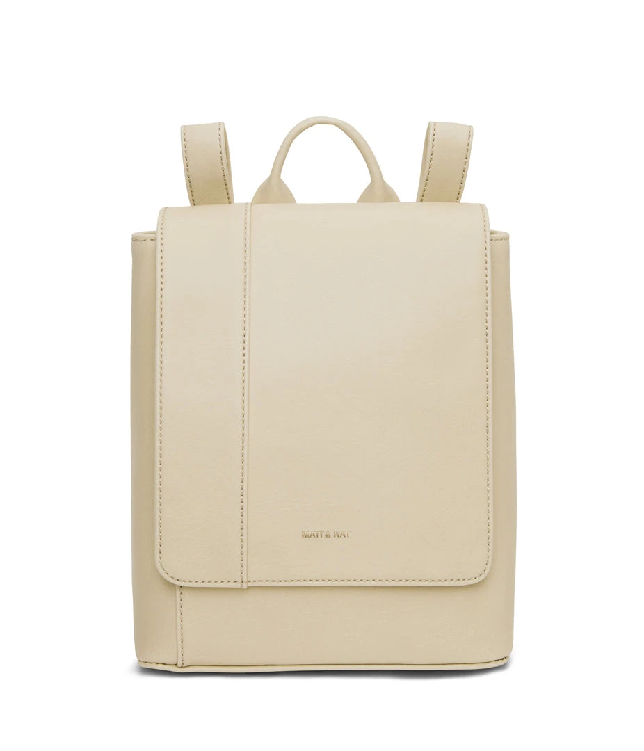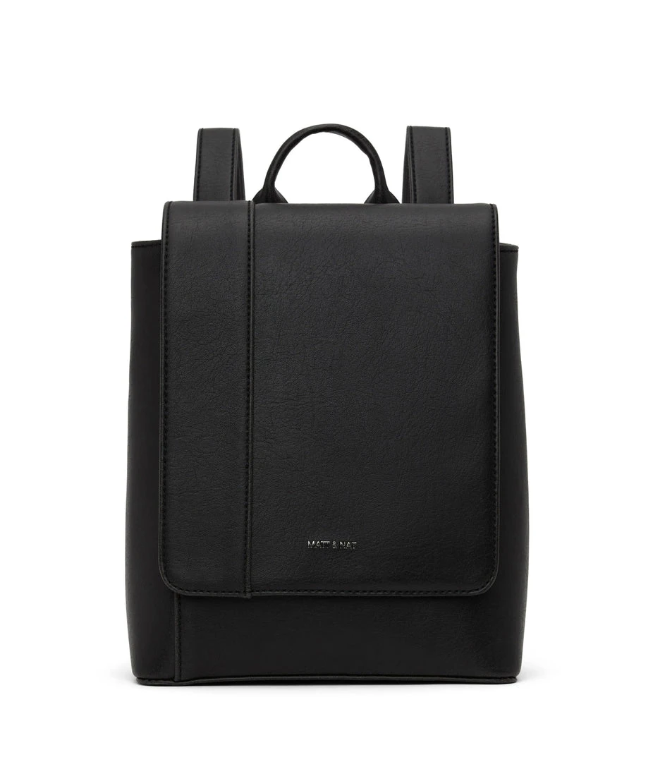 Small backpack with a top handle, flap with hidden magnetic snaps and zipper closure at interior top. Adjustable back straps.
