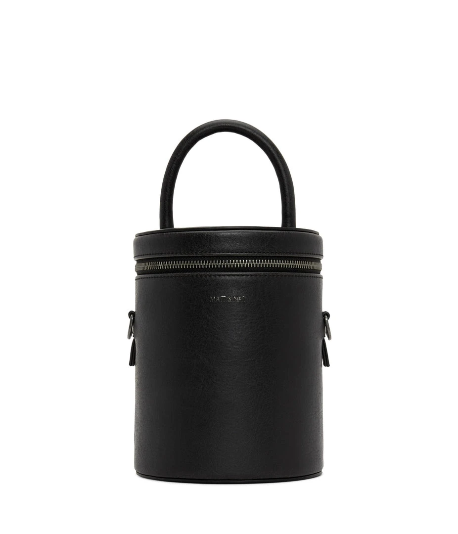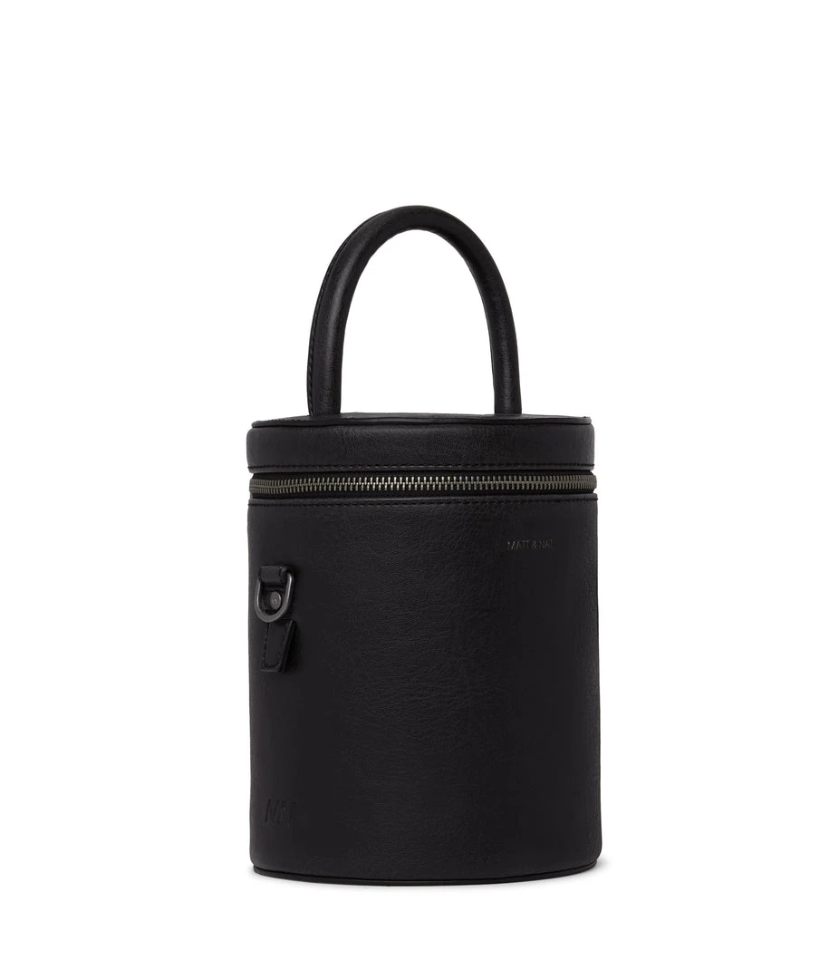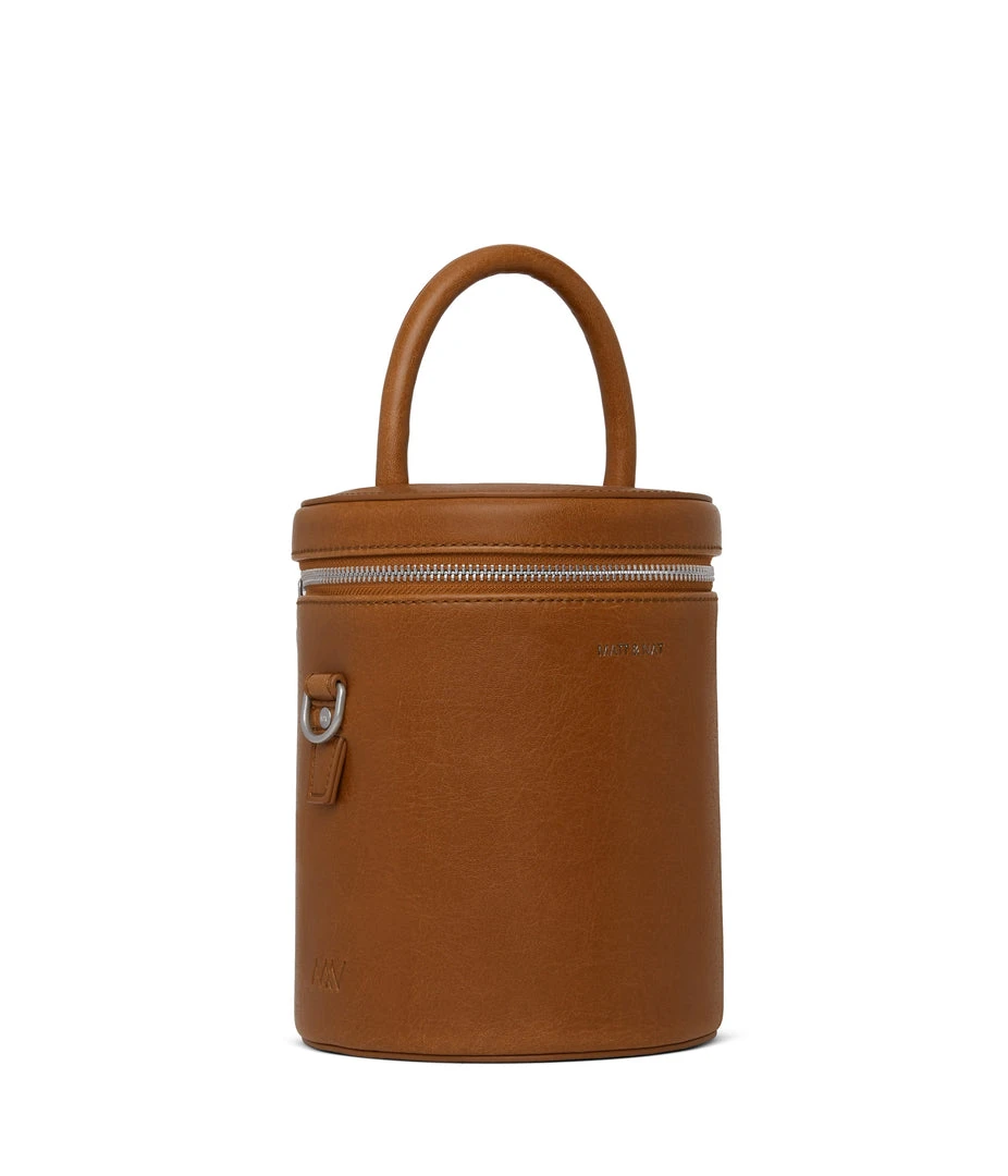 Drum crossbody bag with zipper closure and tubular top handle. Comes with a detachable and adjustable shoulder strap.