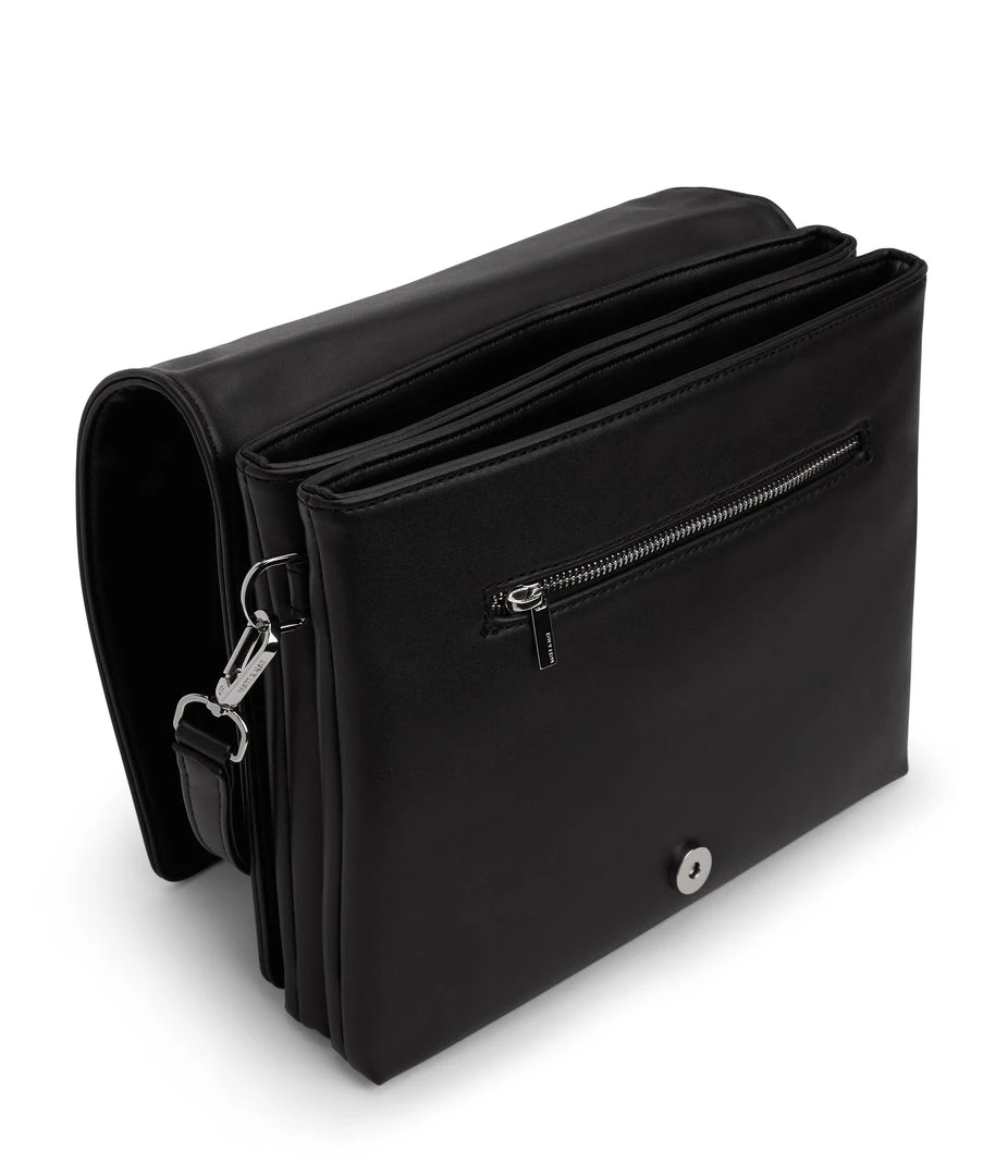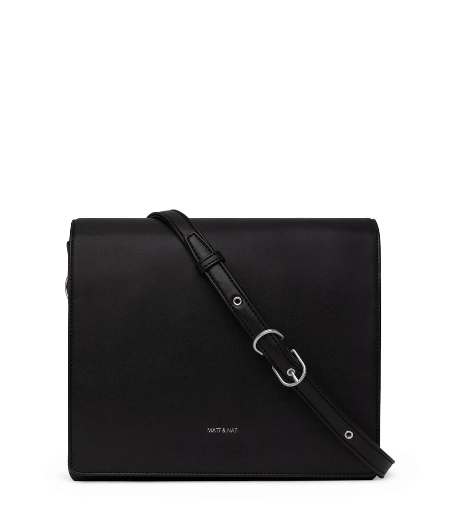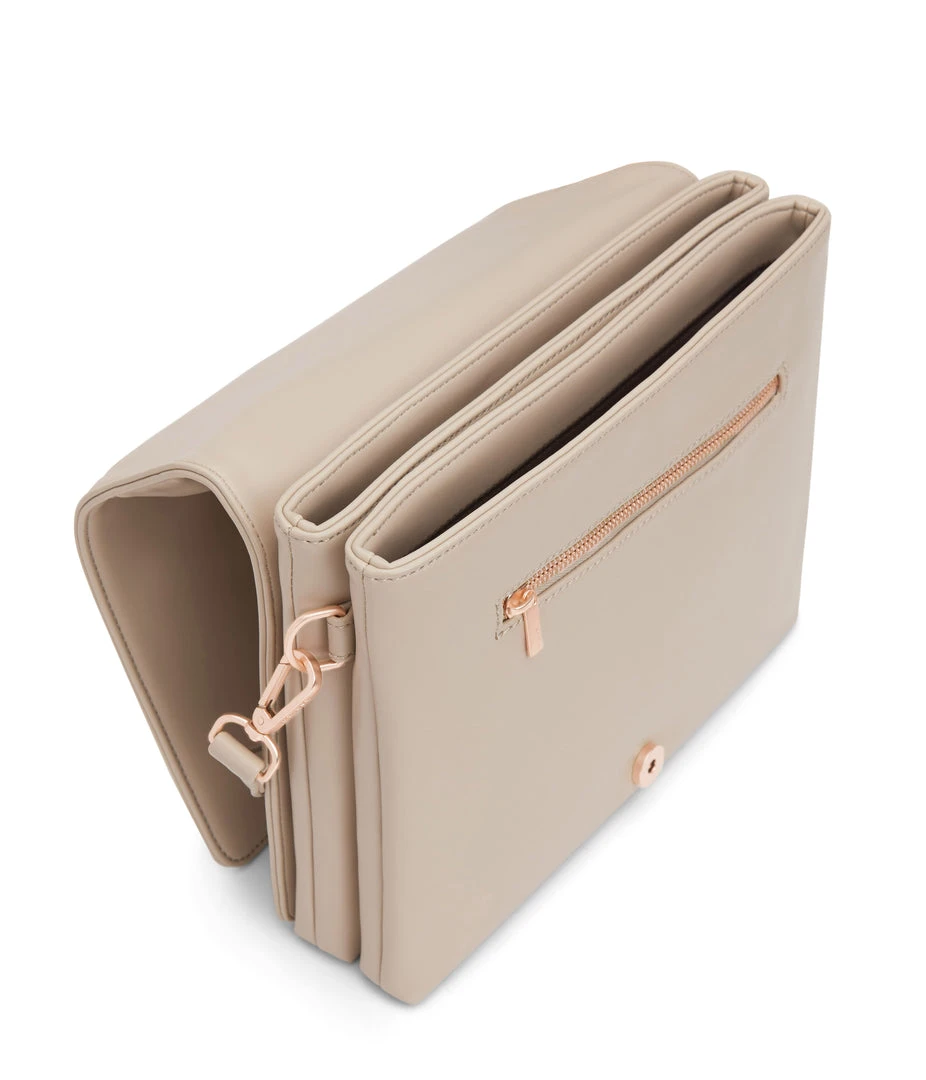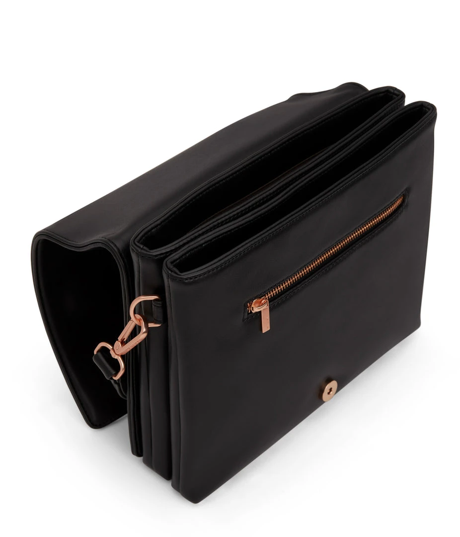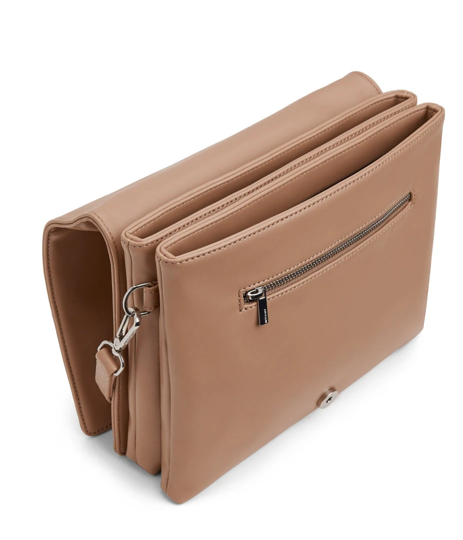 Shoulder bag with double compartment, zipper pocket on the front, and full flap with magnetic snap closure.