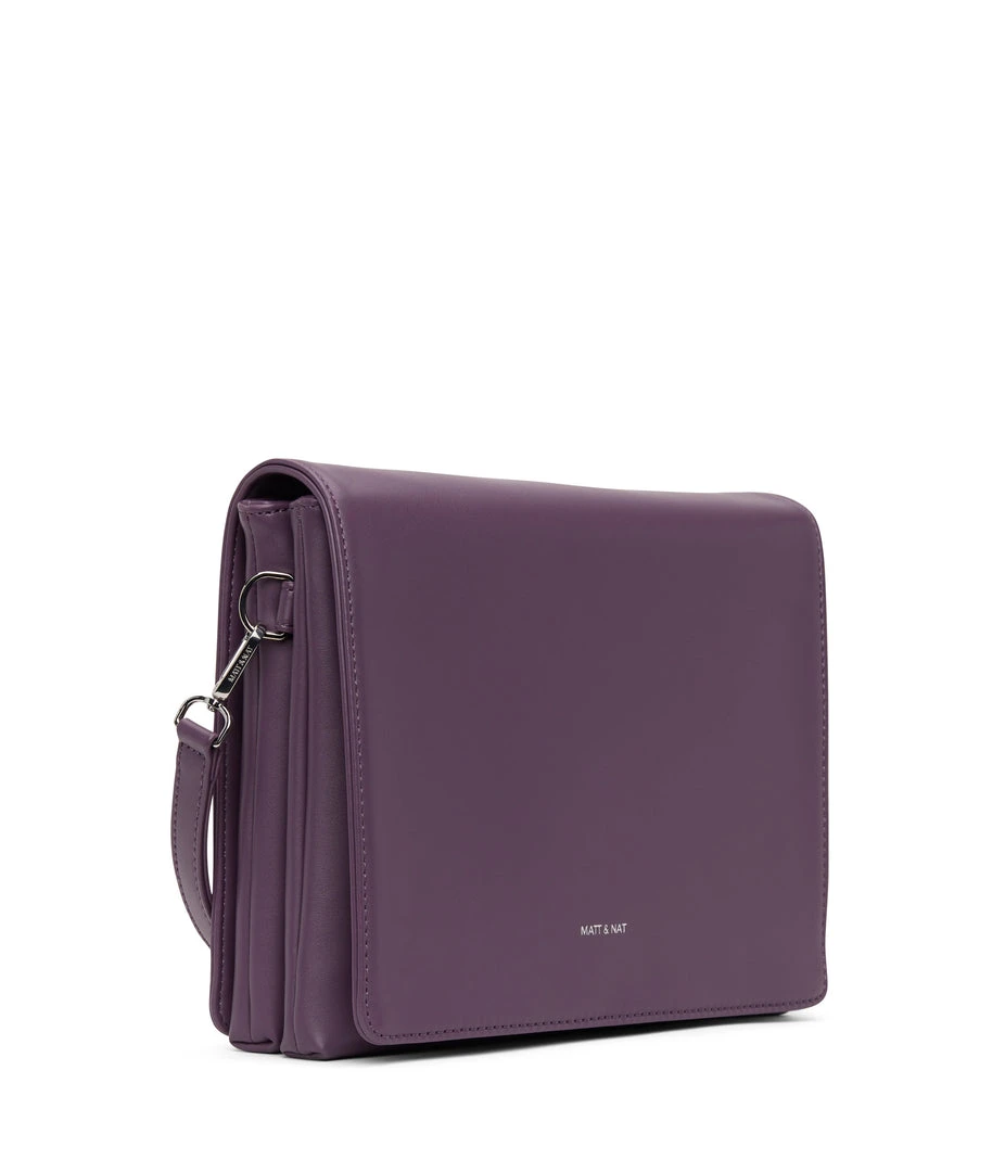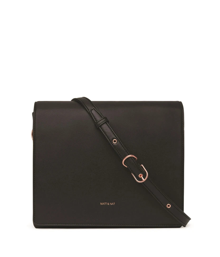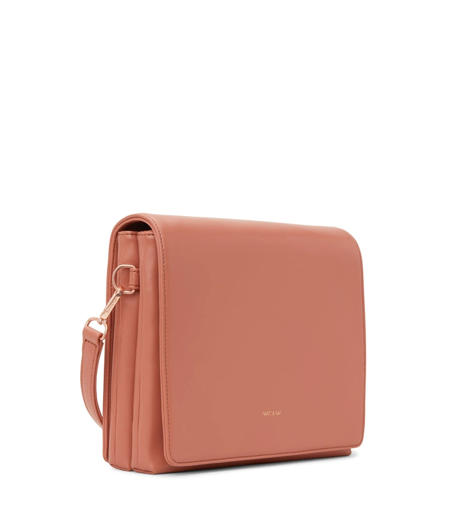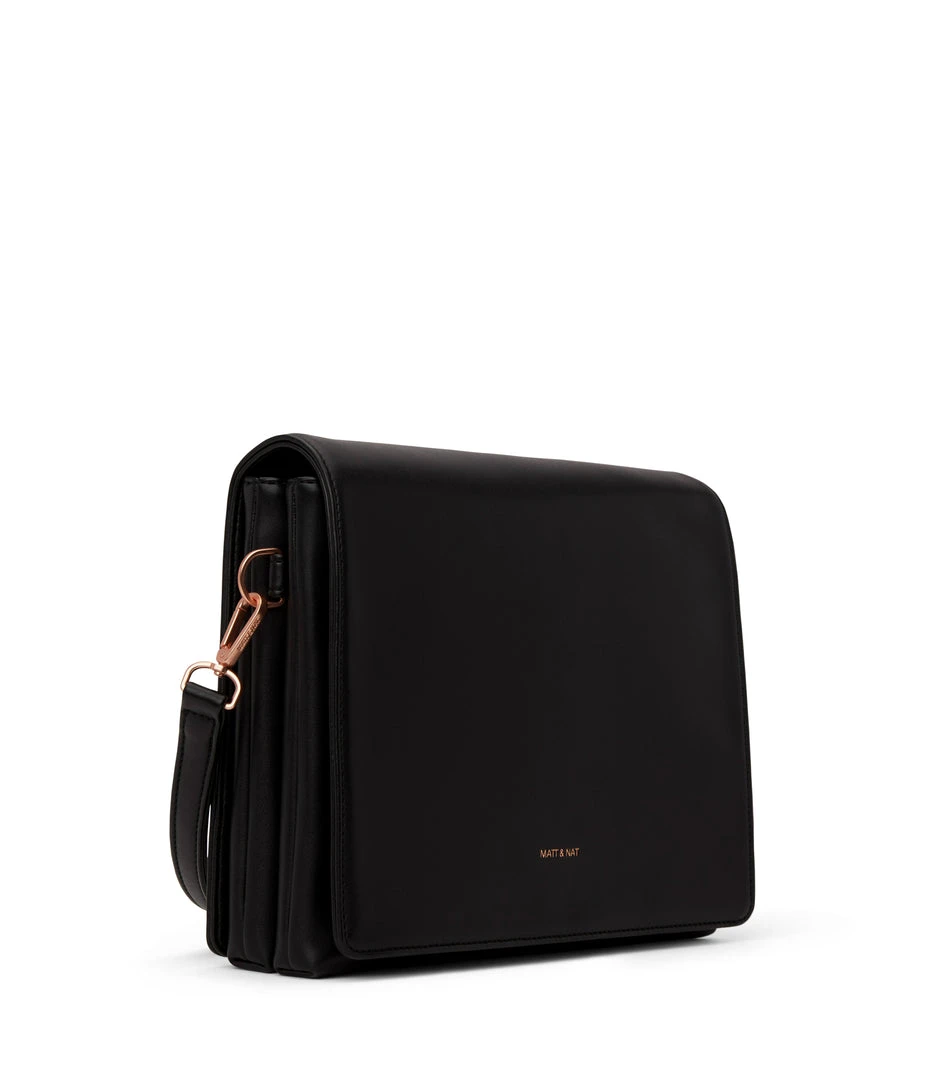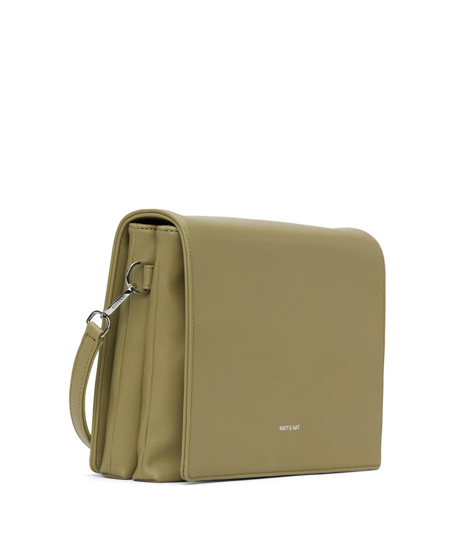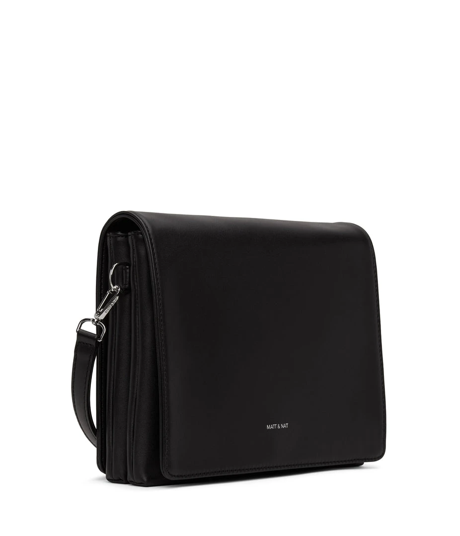 Shoulder bag with double compartment, zipper pocket on the front, and full flap with magnetic snap closure.