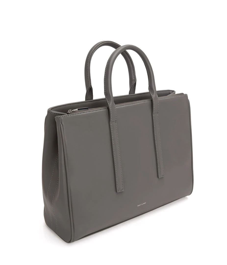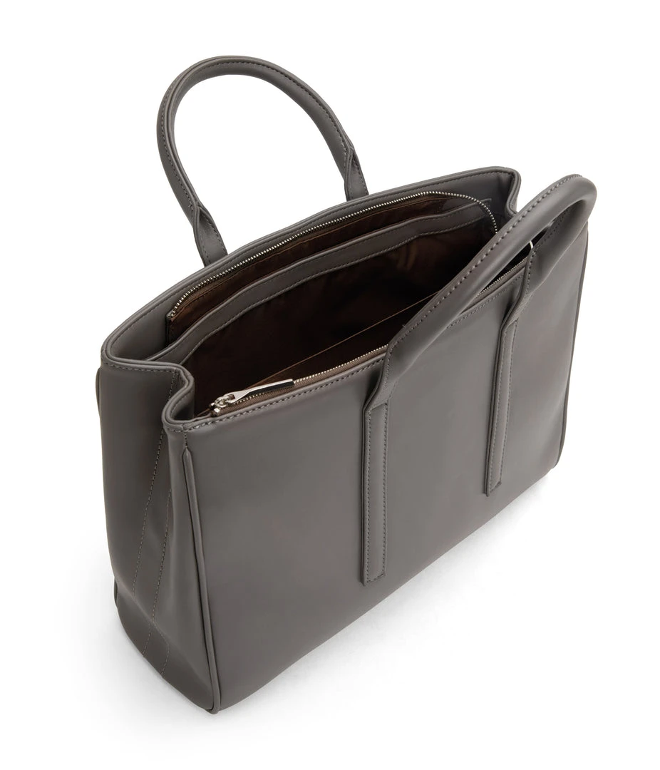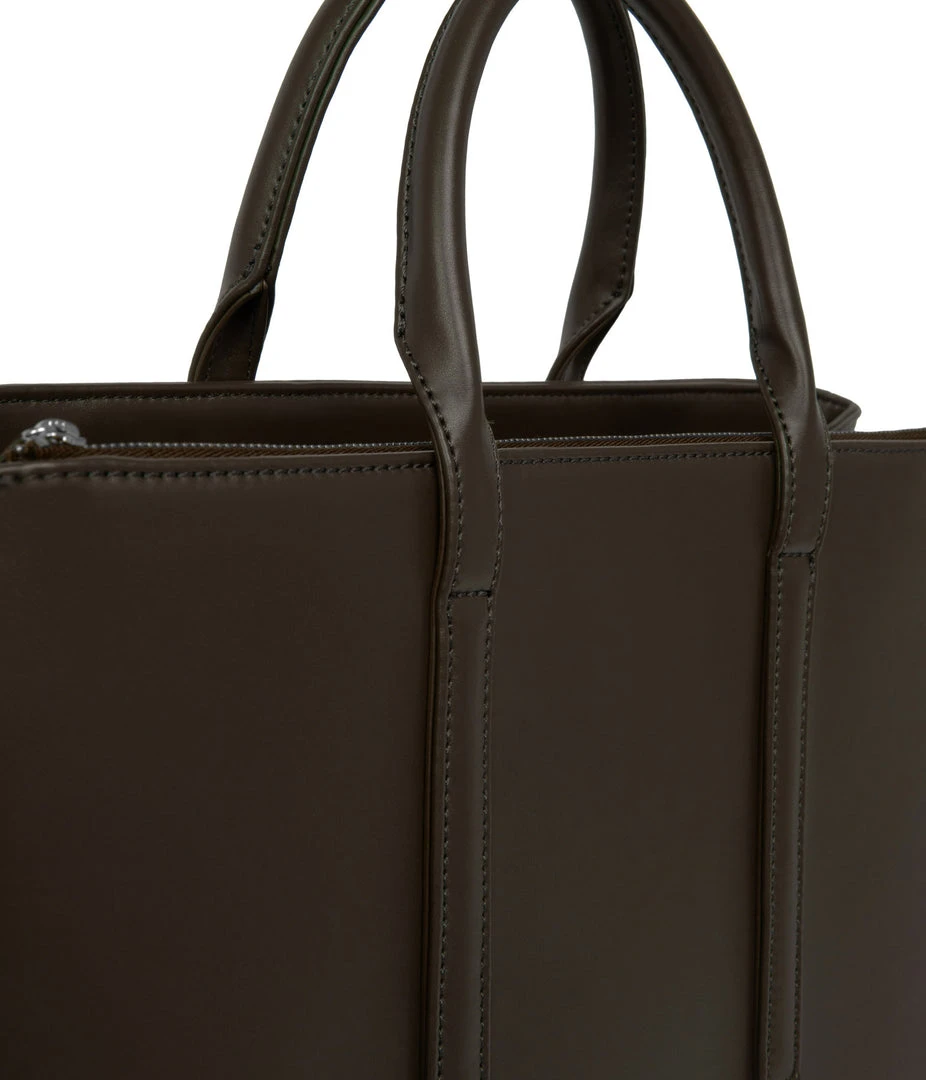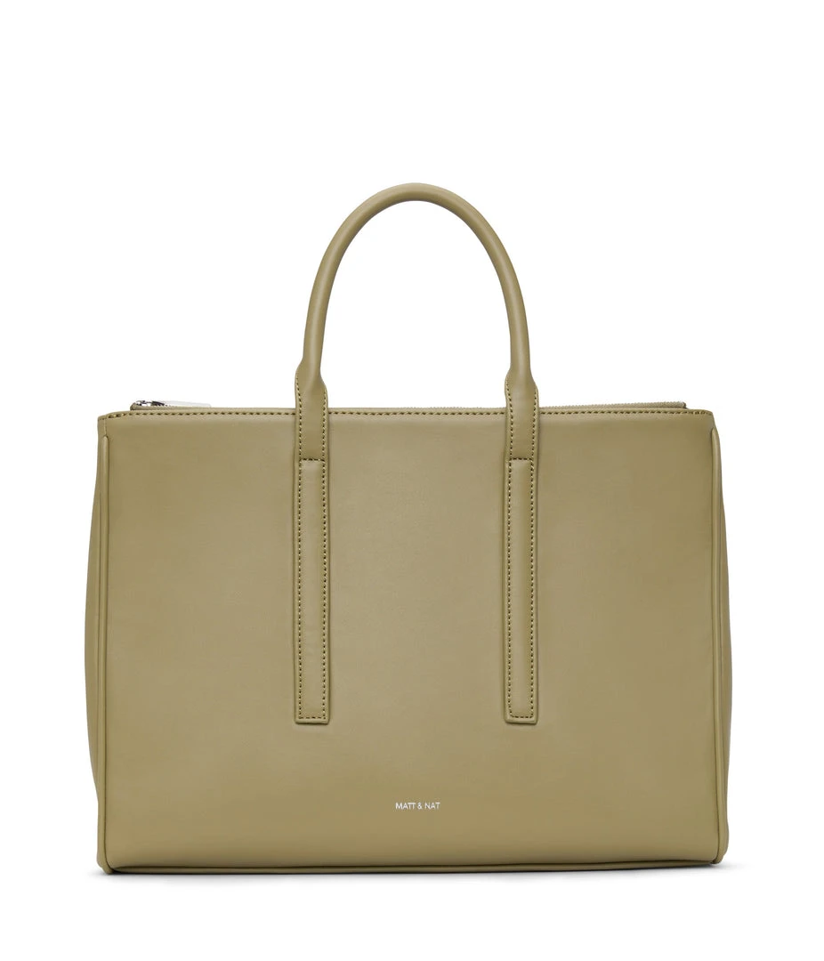 Satchel with tubular handles, main compartment with a center divider and top zipper closure, and large front zip pocket. Comes with an adjustable and detachable crossbody strap. Fits a 13” laptop.