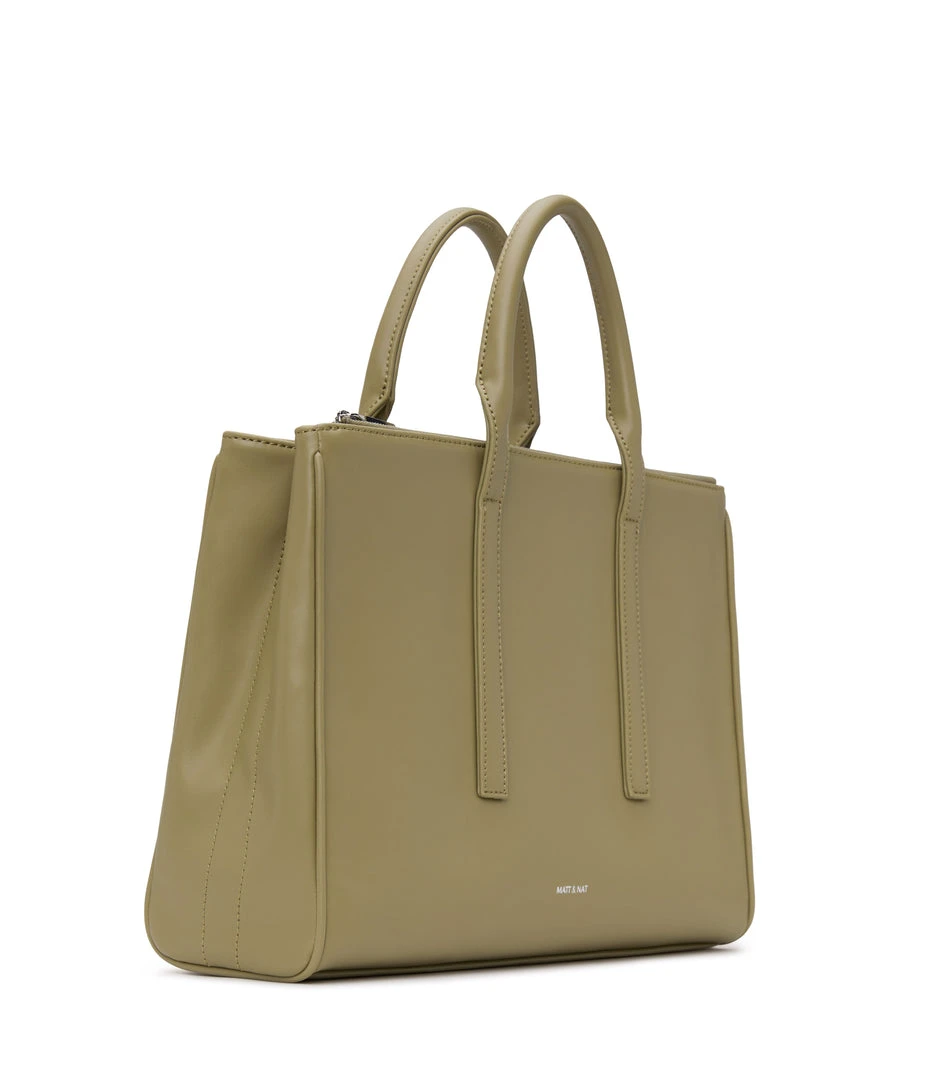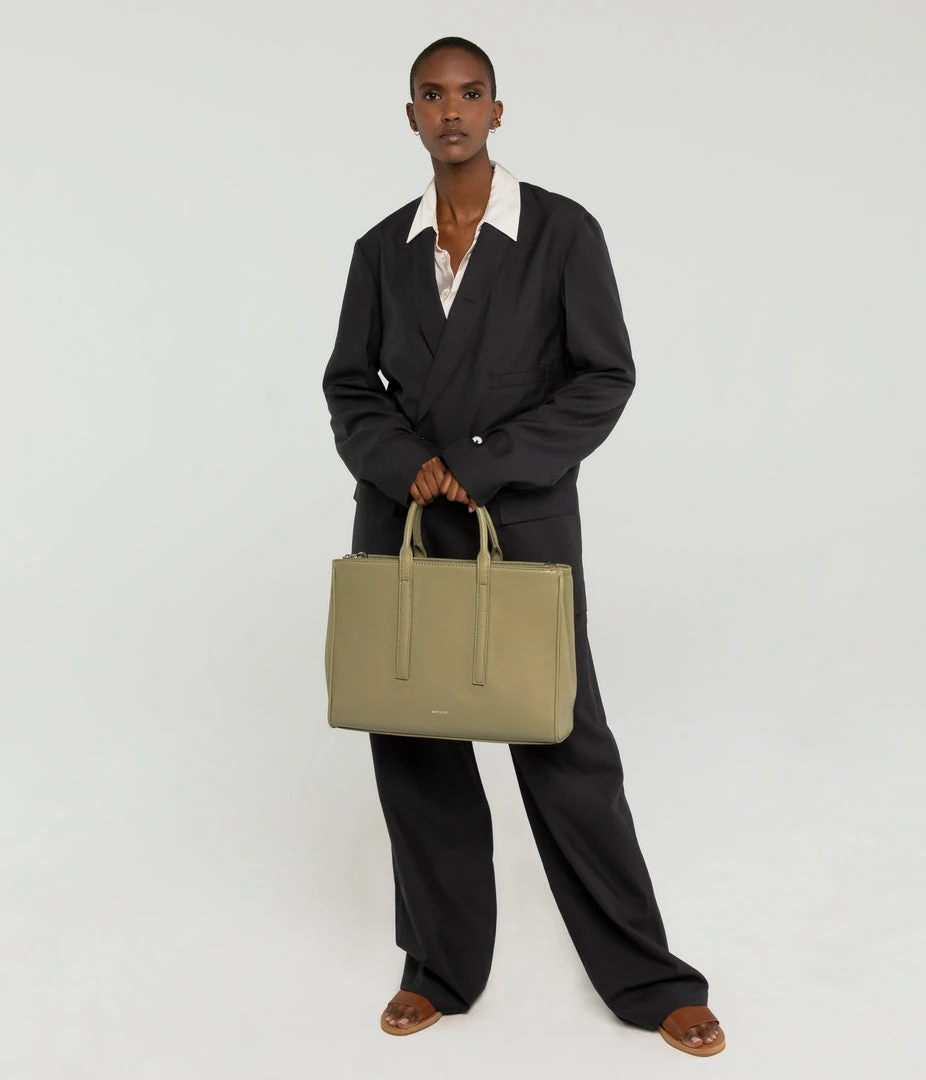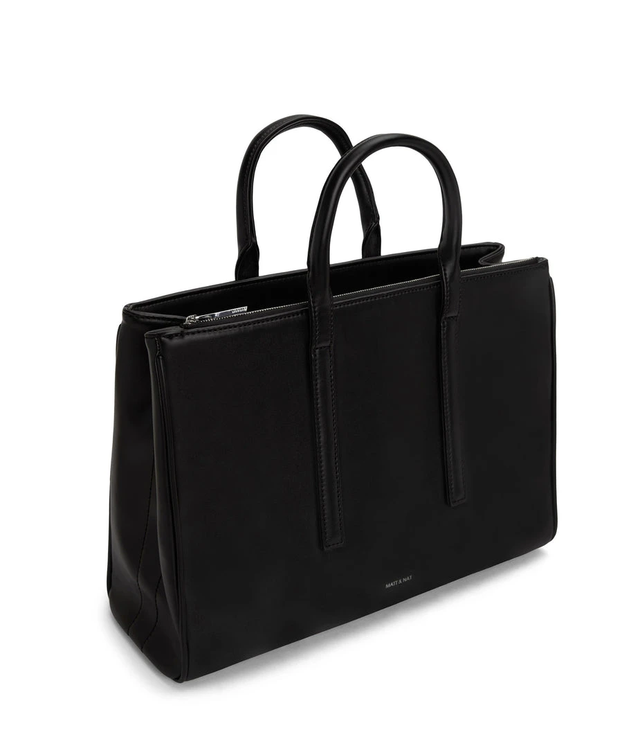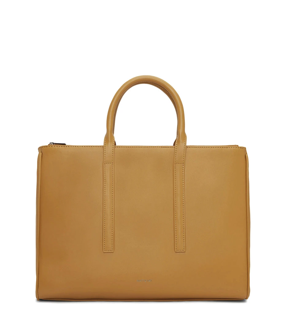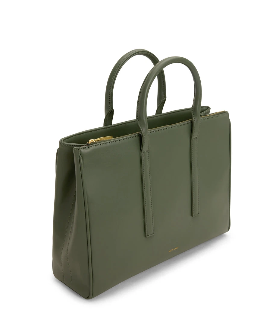 Satchel with tubular handles, main compartment with a center divider and top zipper closure, and large front zip pocket. Comes with an adjustable and detachable crossbody strap. Fits a 13” laptop.