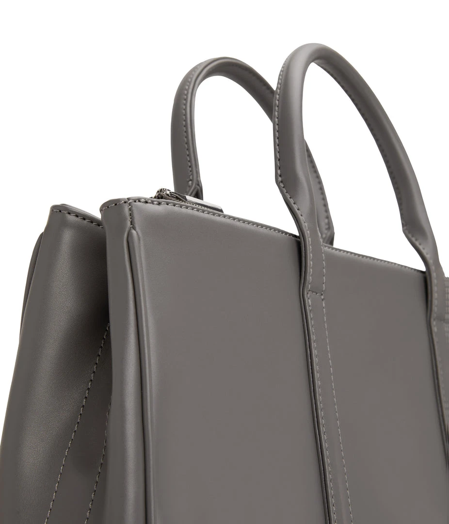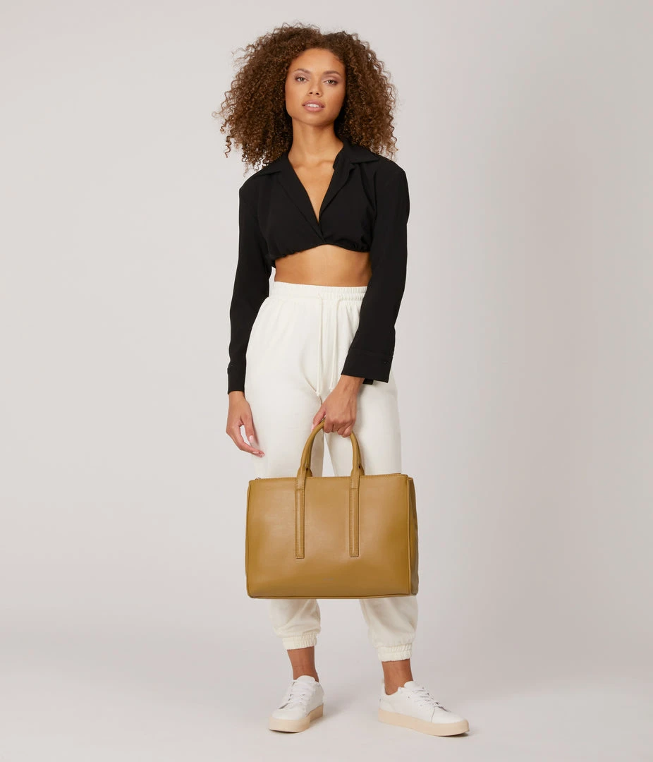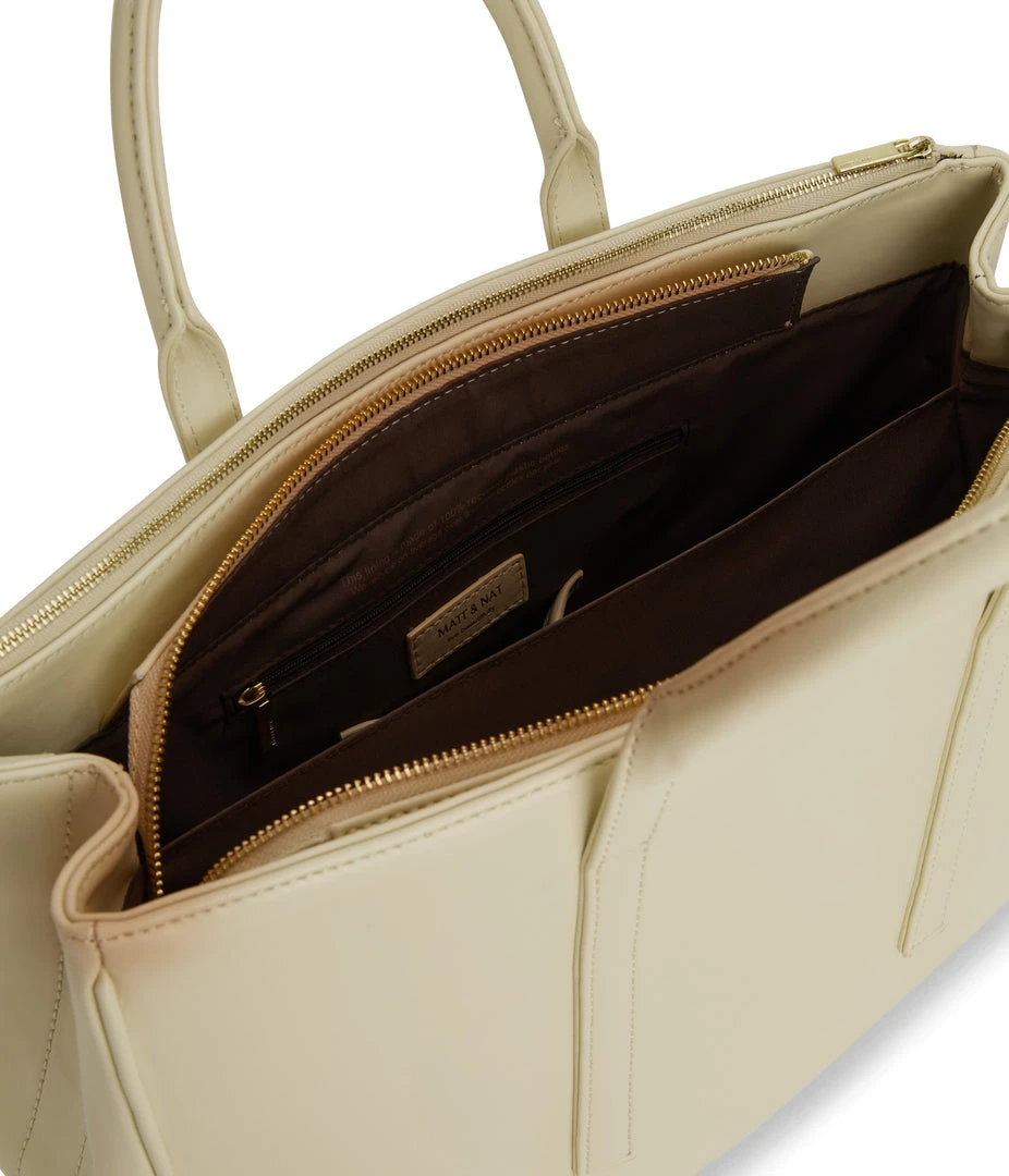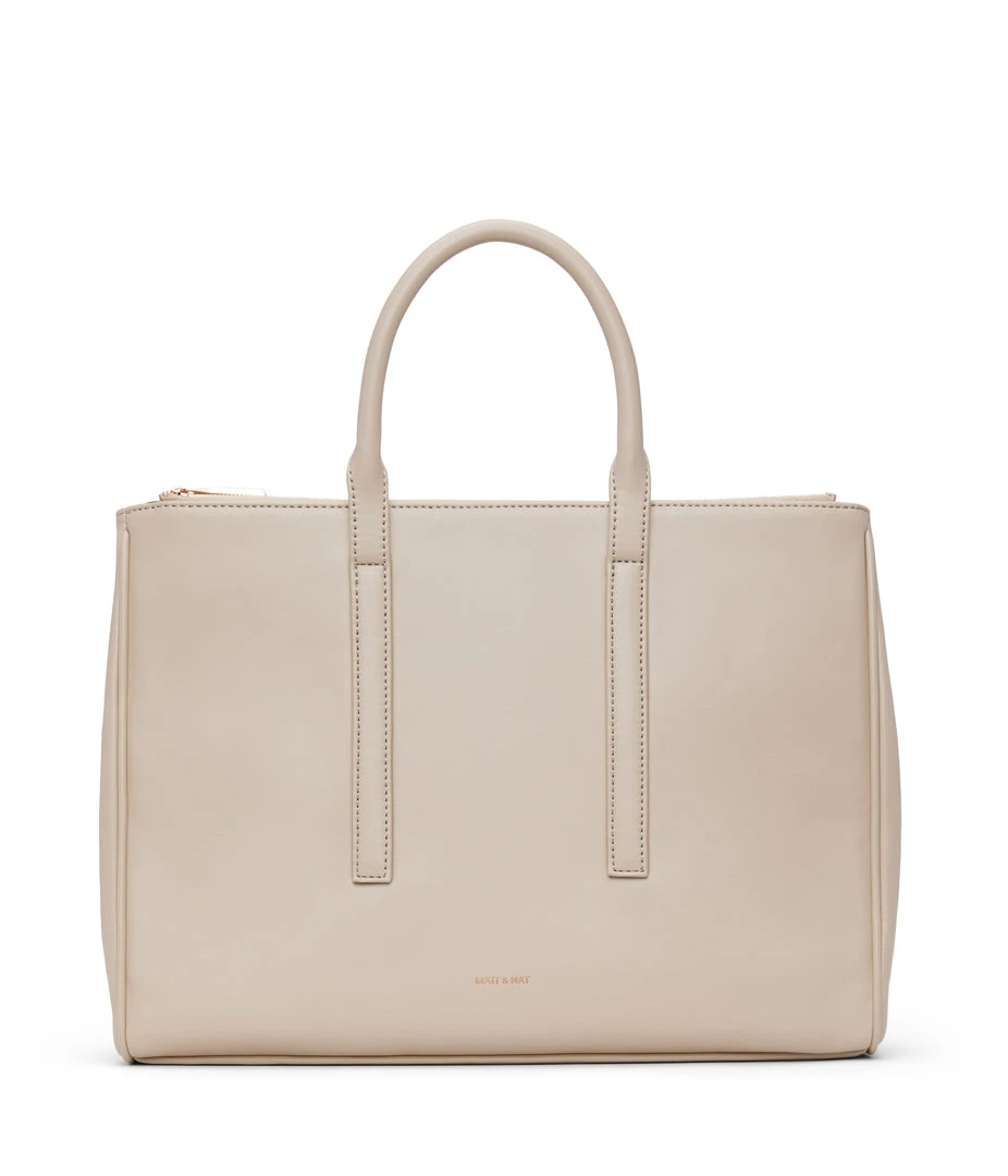 Satchel with tubular handles, main compartment with a center divider and top zipper closure, and large front zip pocket. Comes with an adjustable and detachable crossbody strap. Fits a 13” laptop.