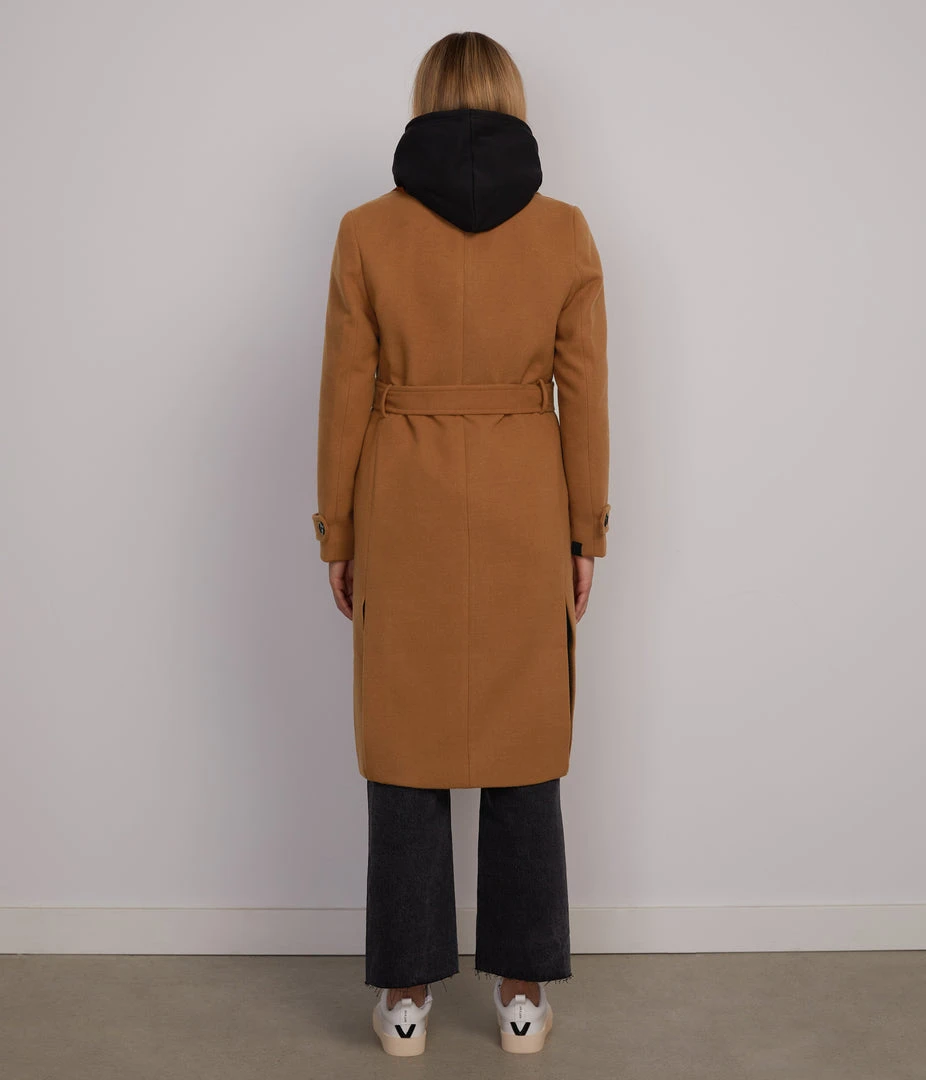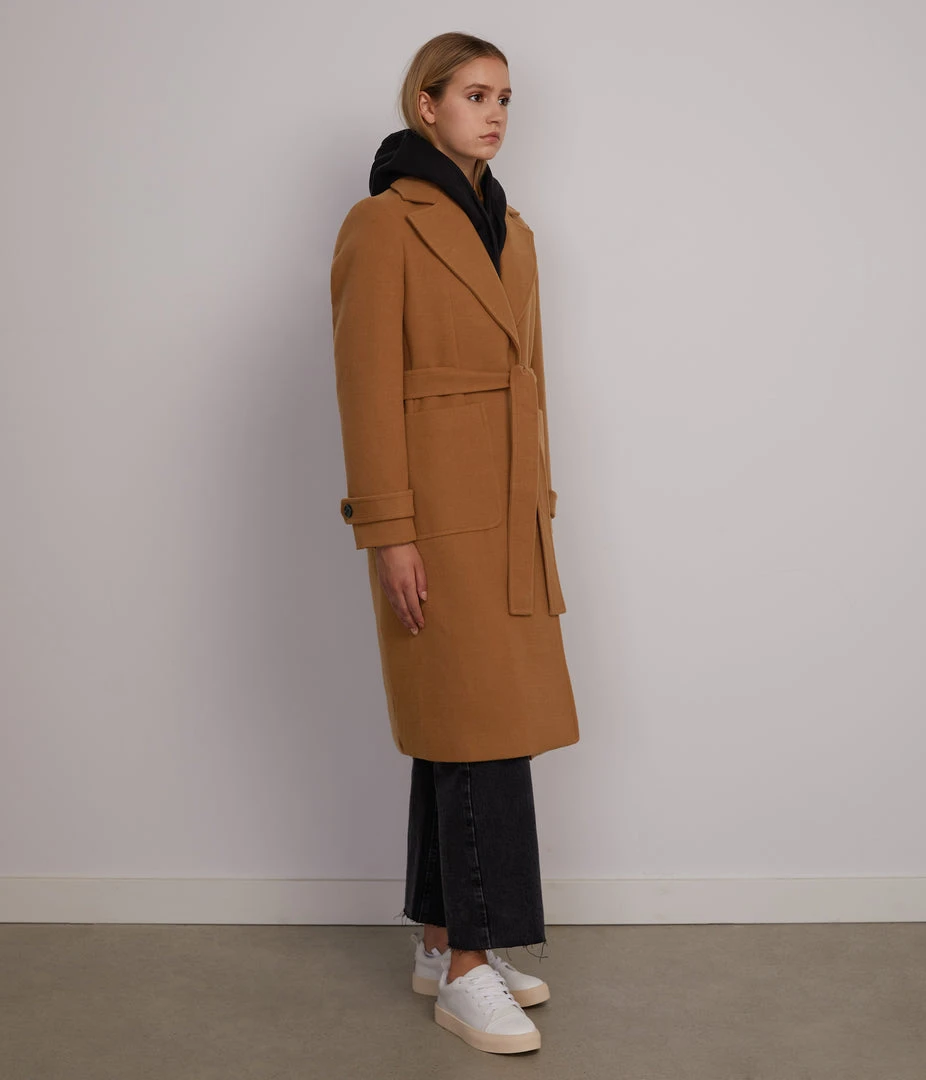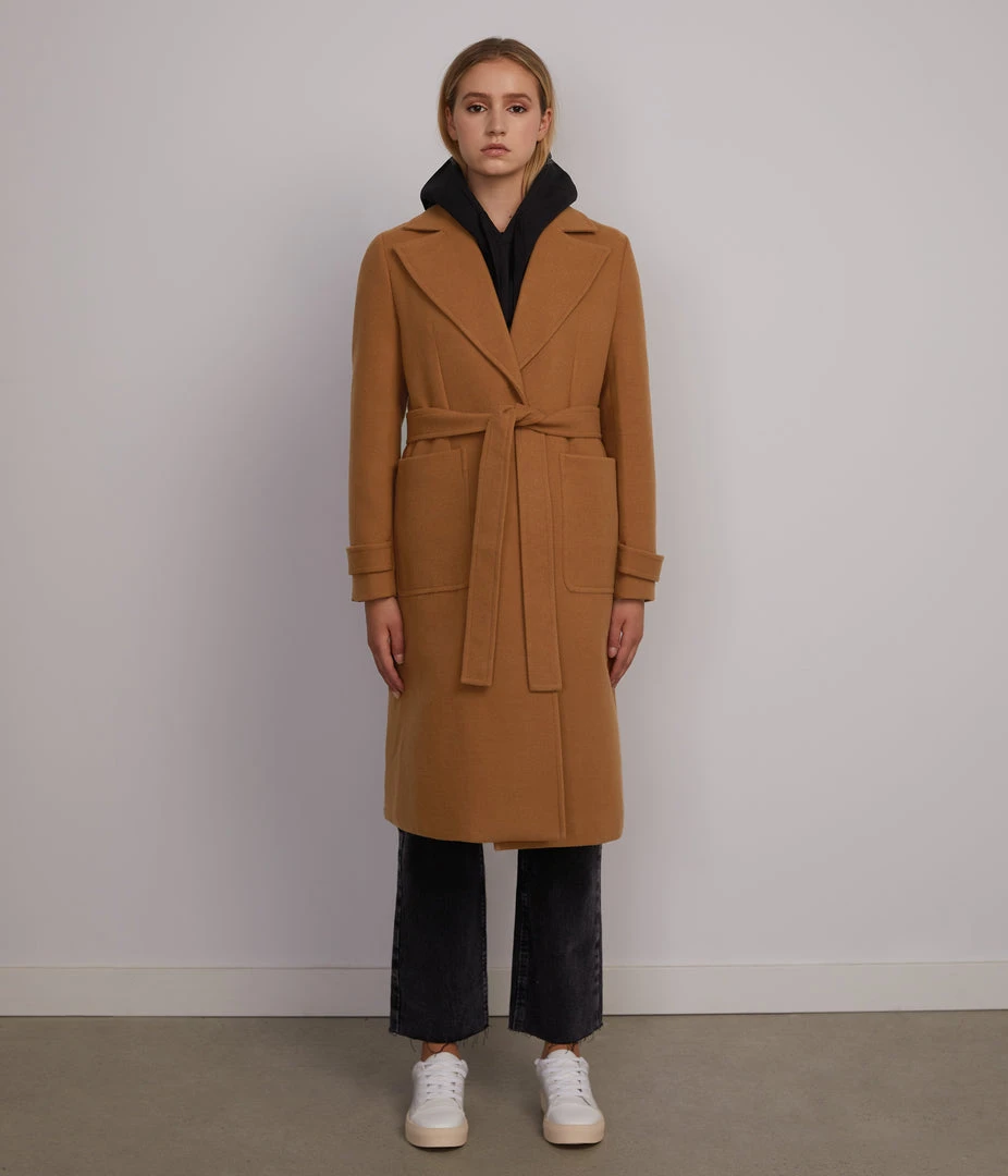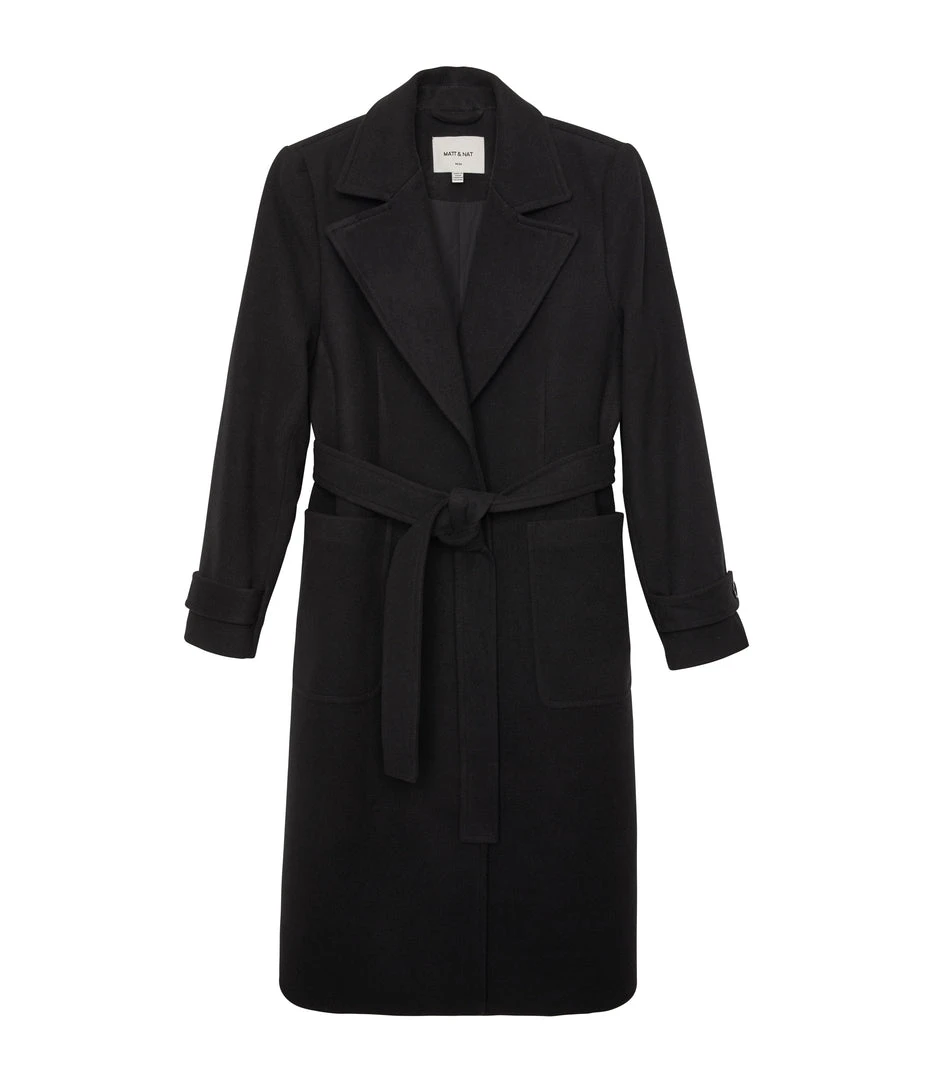 Long sleeve vegan wool coat with notched lapel collar, self-tie belt, and large patch pockets on the front.