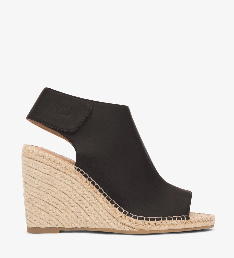 High vamp espadrille wedge with open toe and adjustable back strap design.