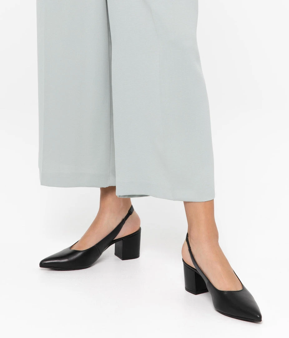 Block heel sling back pointed toe shoe with elastic comfort detail.