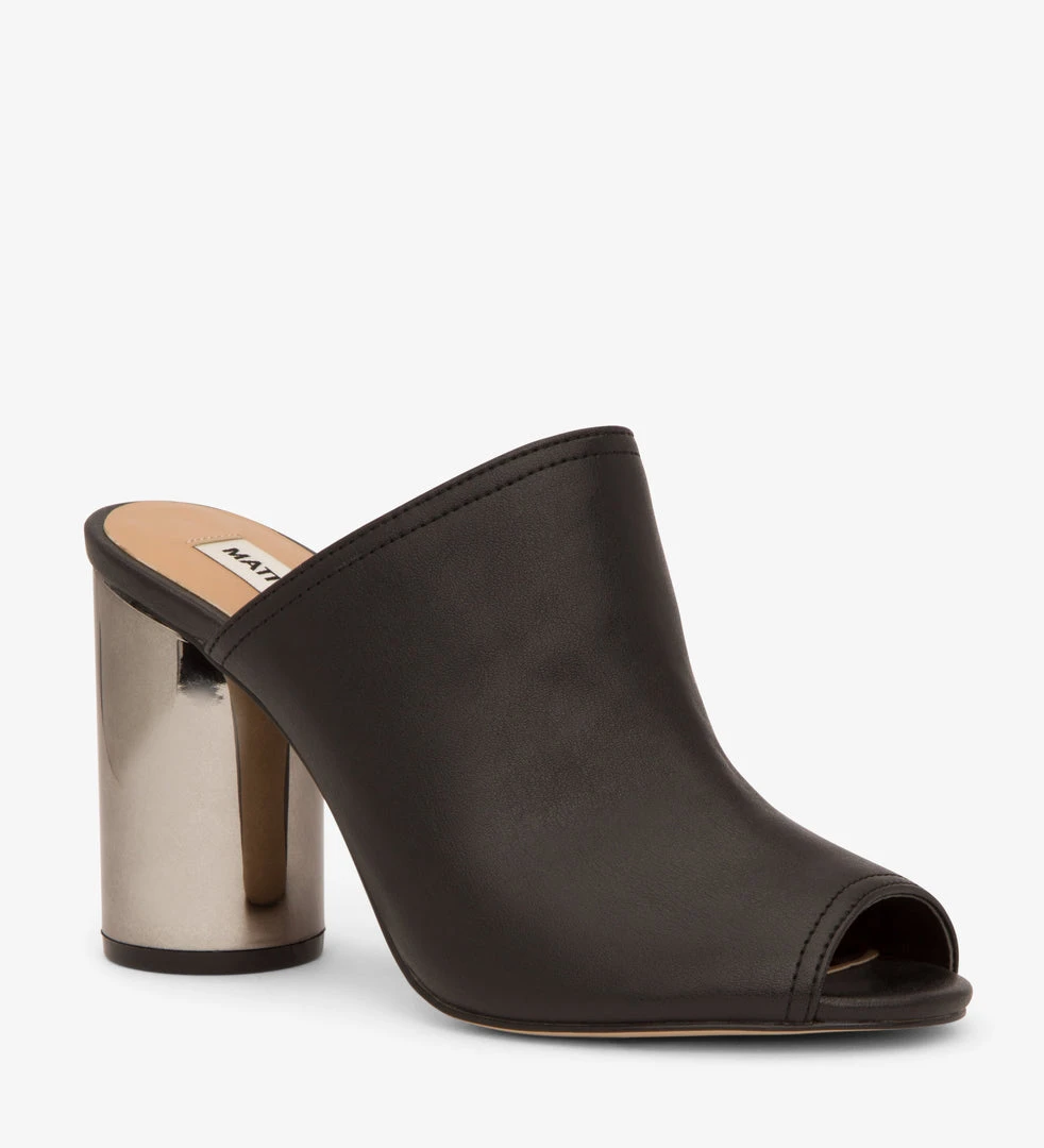 High-heeled mule offered in smooth grain vegan leather and suede with a metallic wood or shiny cylindrical heel finish.