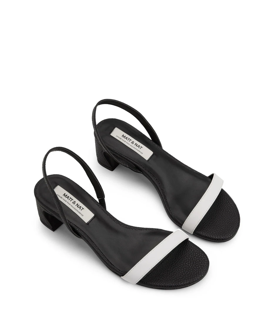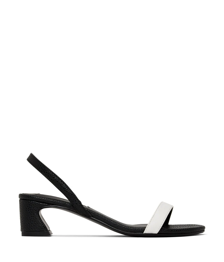 Women’s chic sandal with contrast strap detail and mid-heel.
