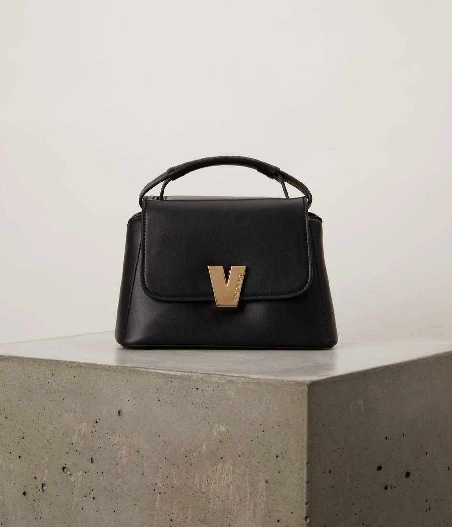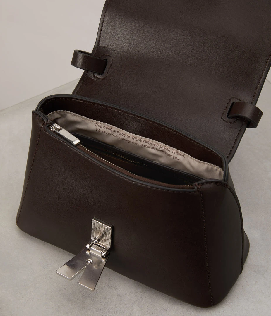 Small crossbody bag with flap closure and flip-lock, top handle to hand-carry, zipper pocket at the top of the front panel, and an adjustable and detachable shoulder strap. Also available in size GEAN.