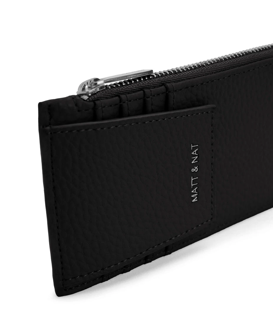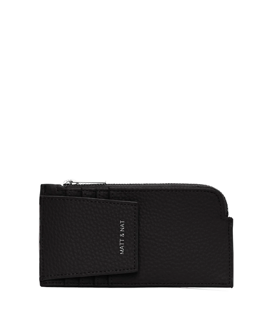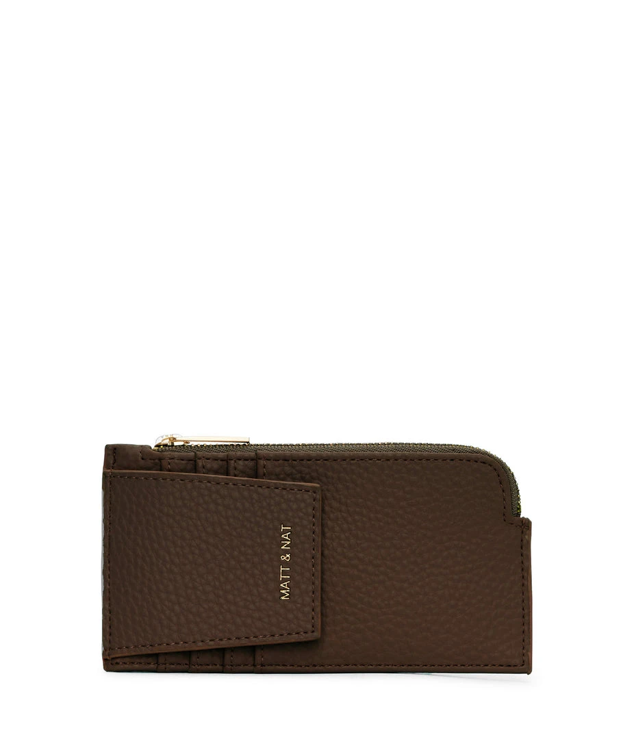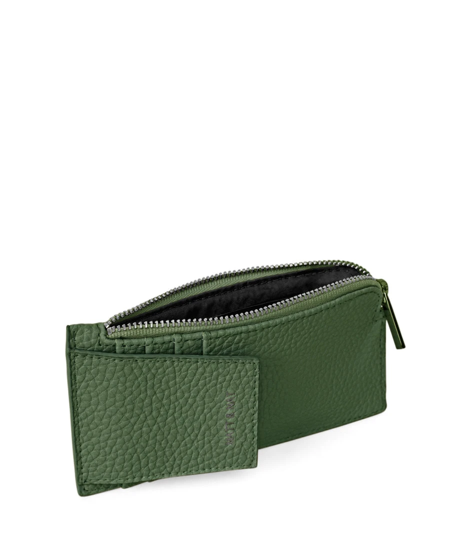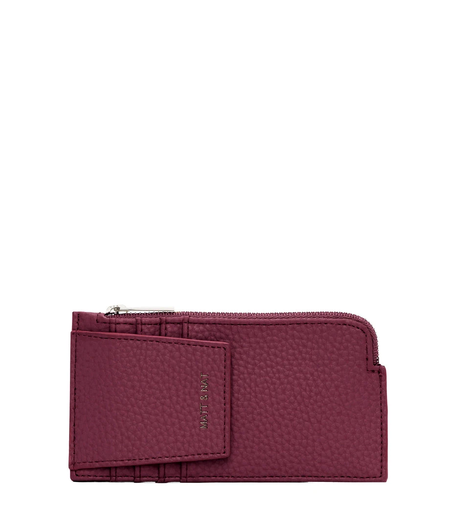 Cardholder with zip coin pocket, 4 card slots with a flap and snap closure, and a slip pocket at exterior back.