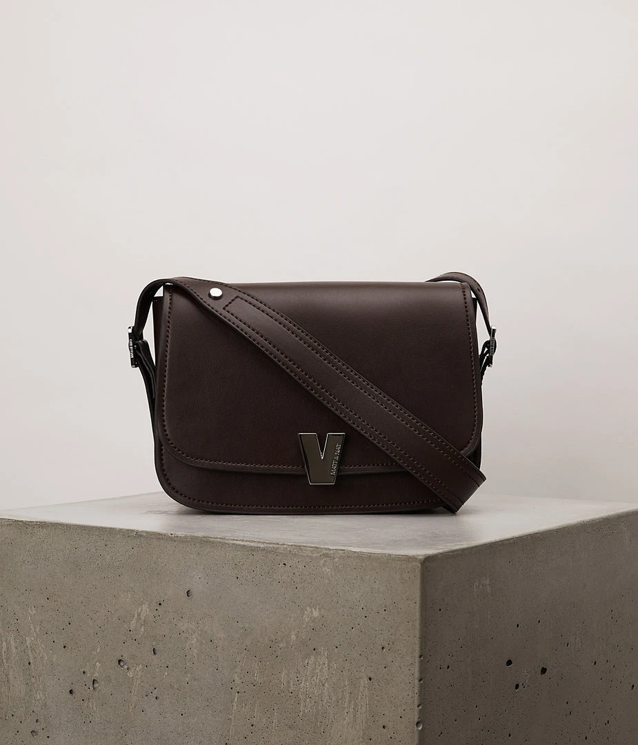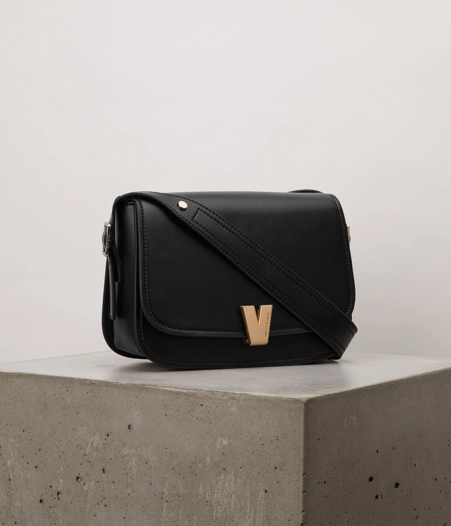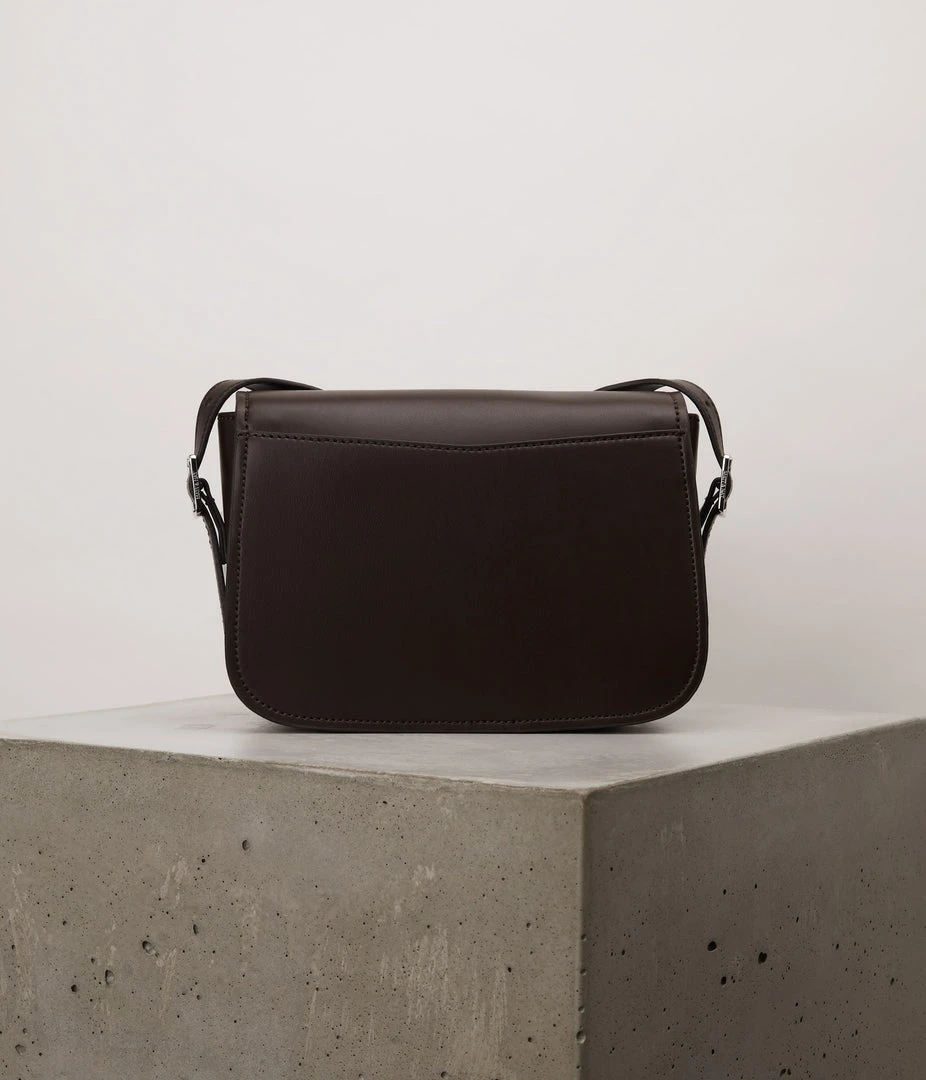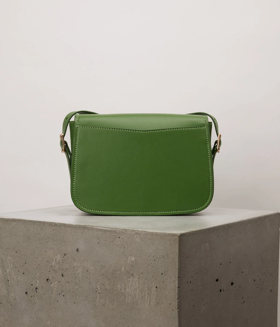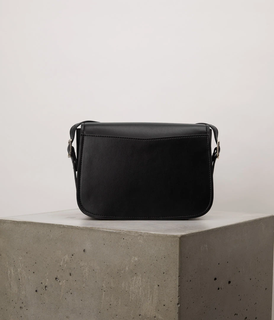 Crossbody bag with flap closure and flip-lock, exterior back slip pocket, and adjustable strap.