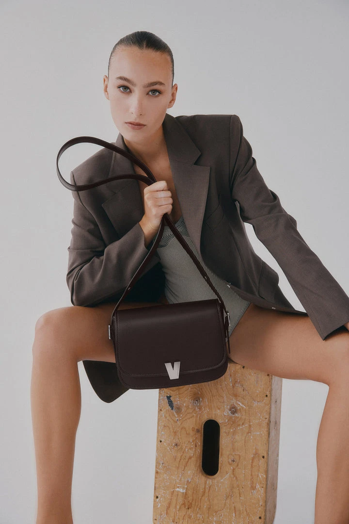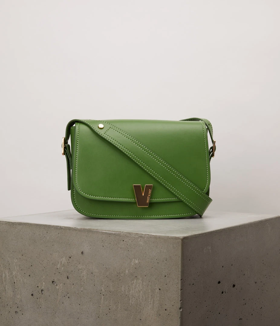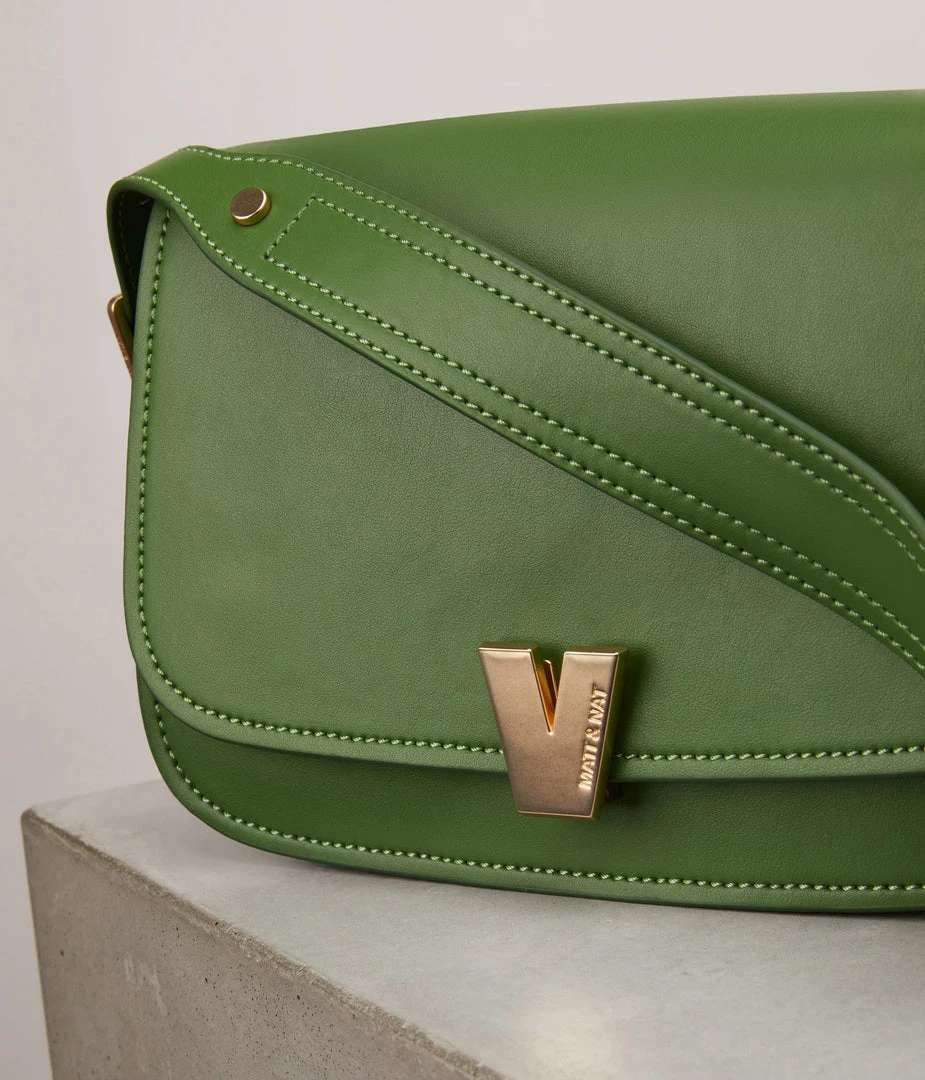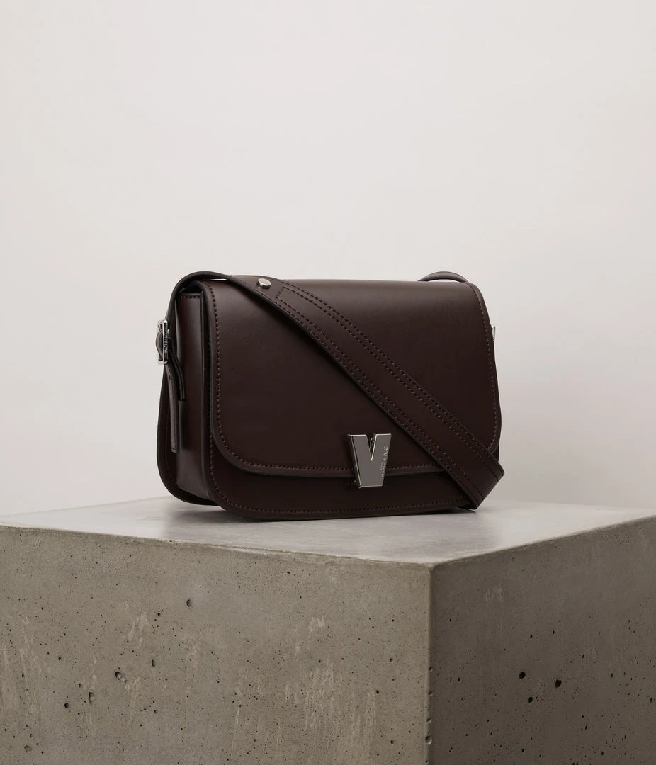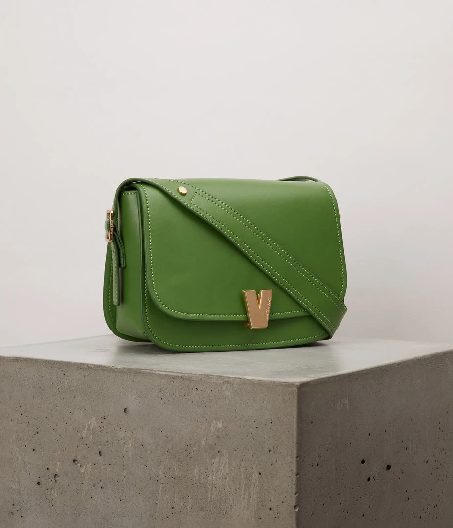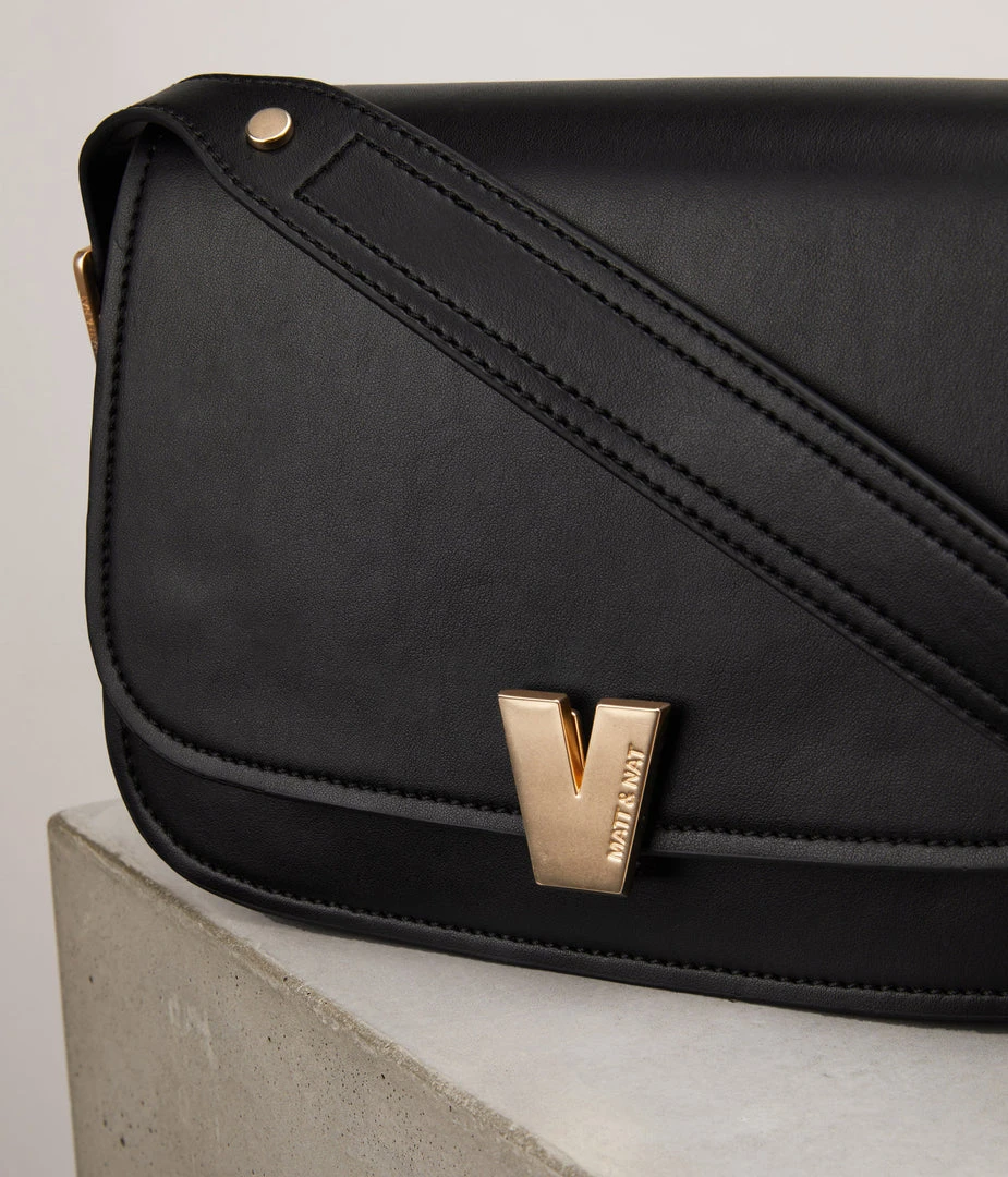 Crossbody bag with flap closure and flip-lock, exterior back slip pocket, and adjustable strap.