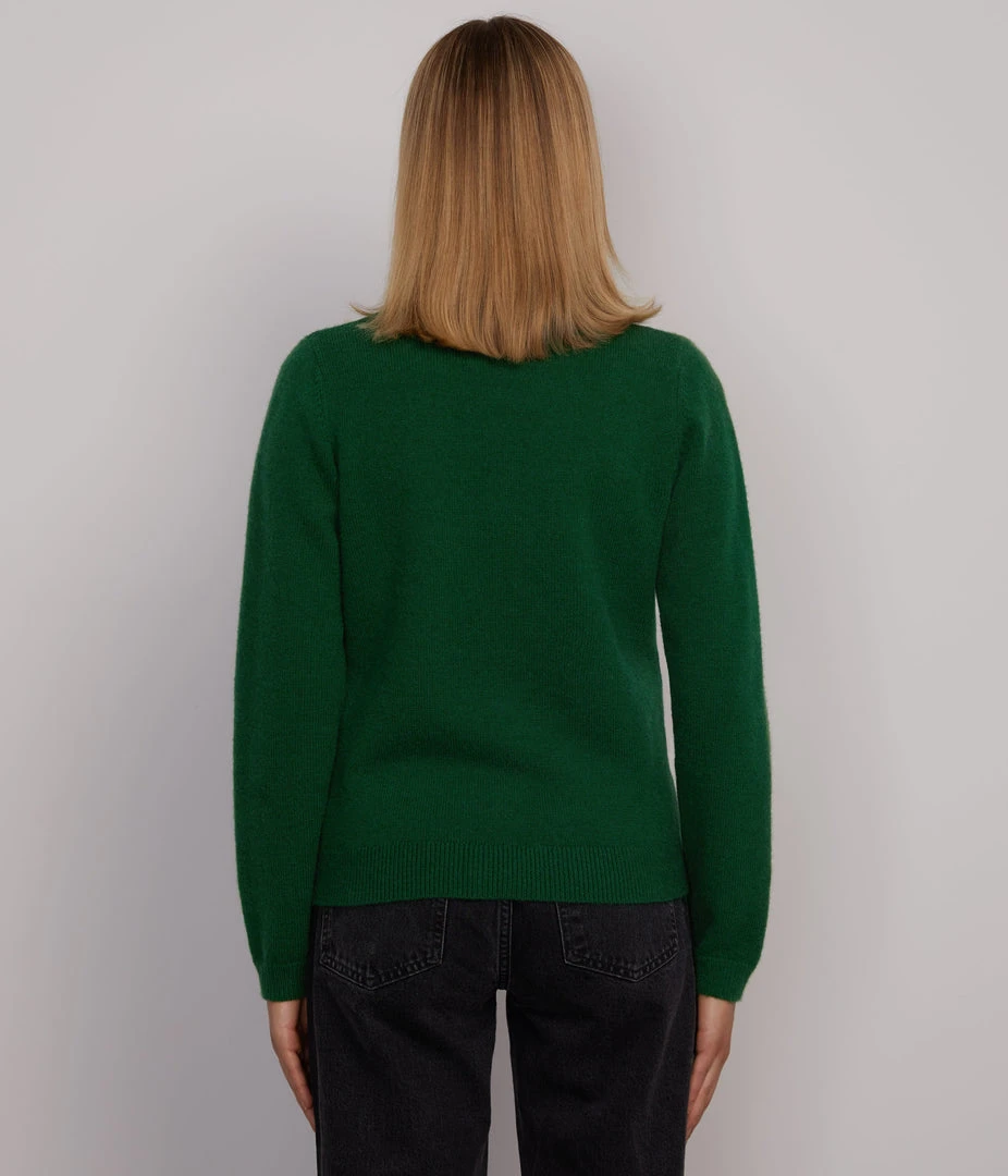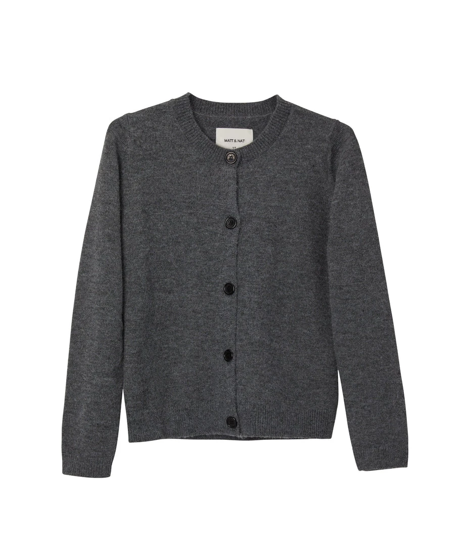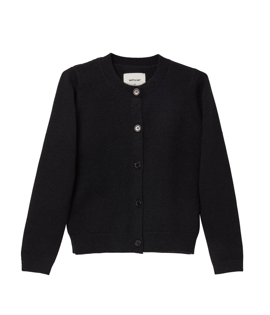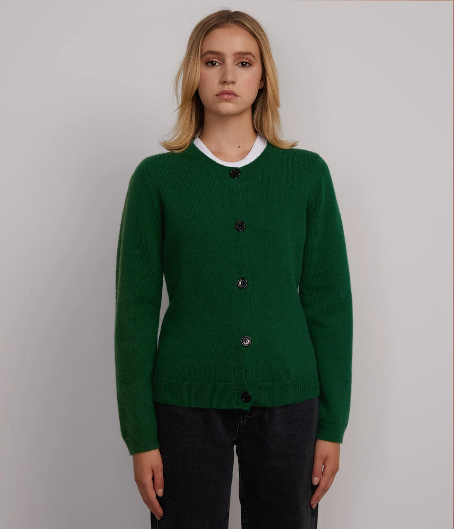 Long-sleeve button-front cardigan with crew-neck, rib finish around neckline, hem and cuffs.