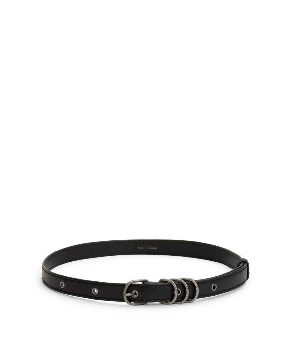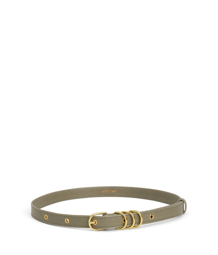 Skinny regular waist belt with metal D-ring hardware and embossed logo at belt end.