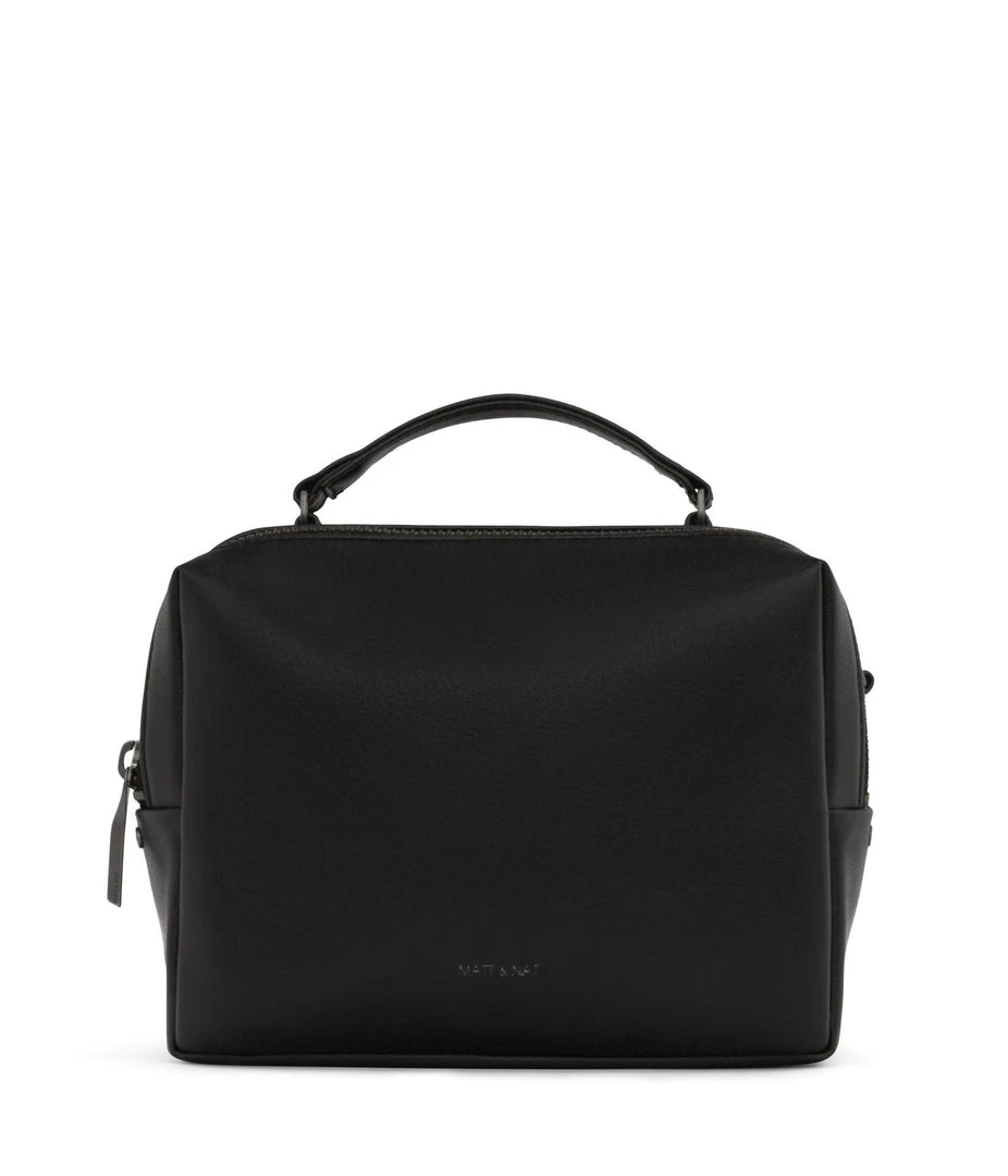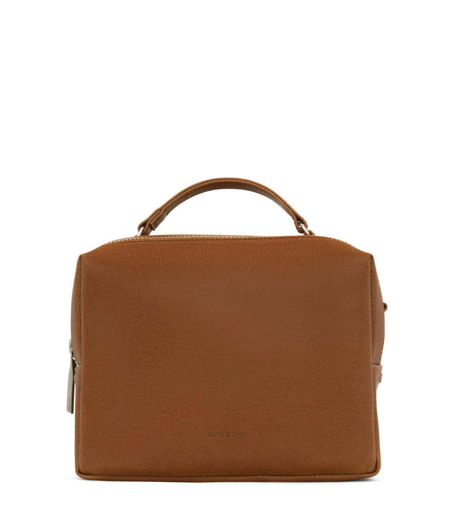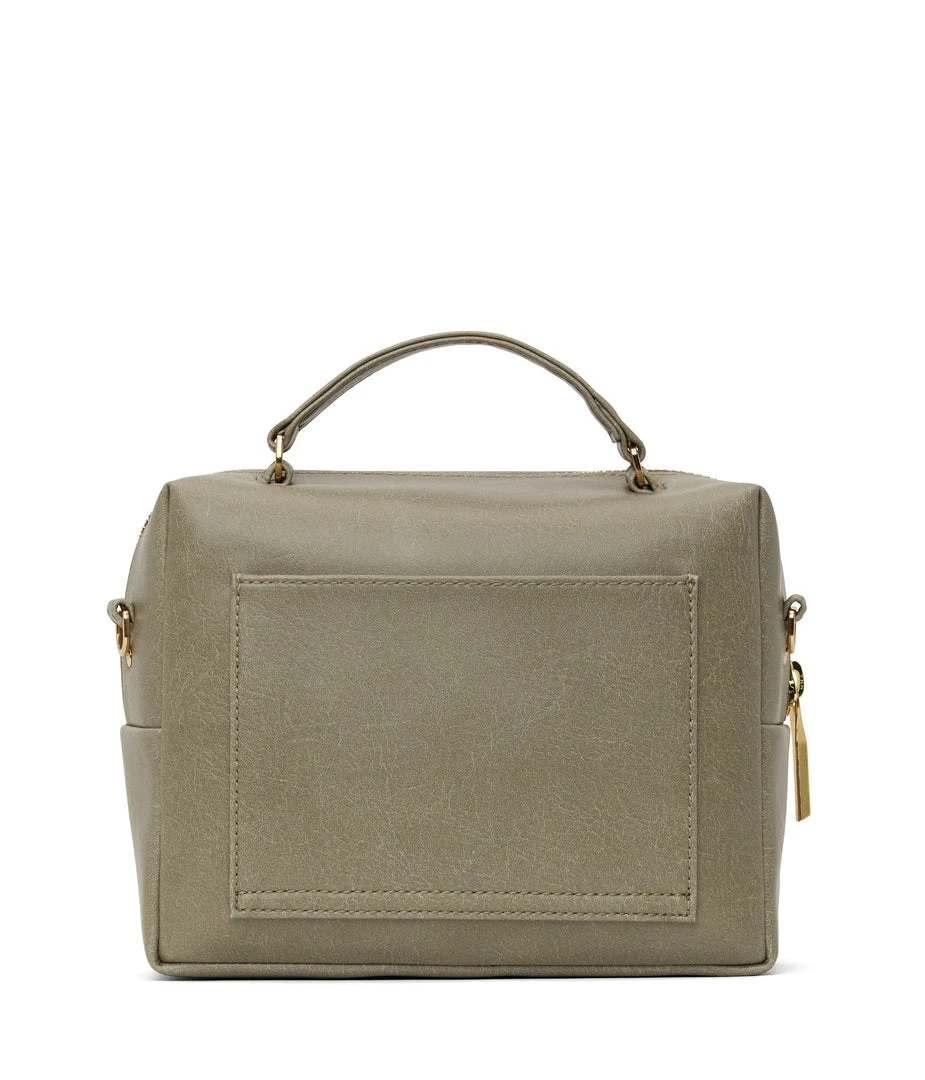 Boxy crossbody bag with top handle, metal zip closure and exterior patch pocket on back. Comes with a removable and adjustable crossbody strap.