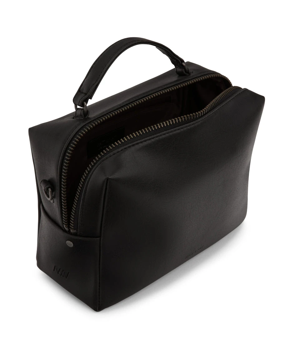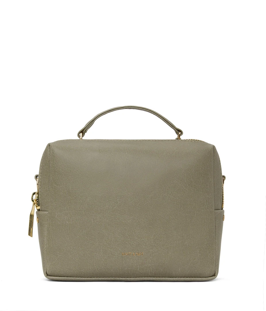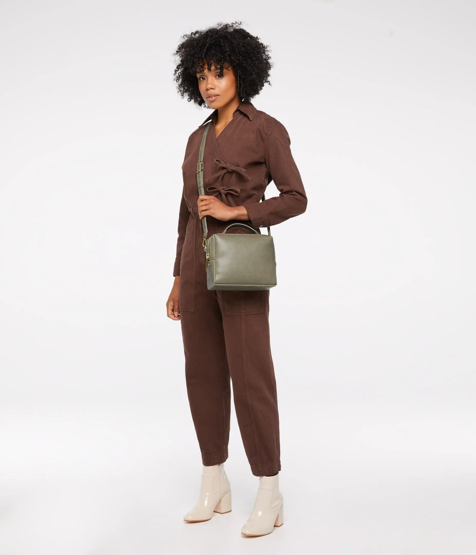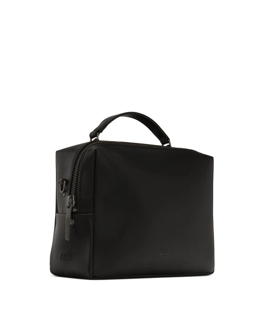 Boxy crossbody bag with top handle, metal zip closure and exterior patch pocket on back. Comes with a removable and adjustable crossbody strap.