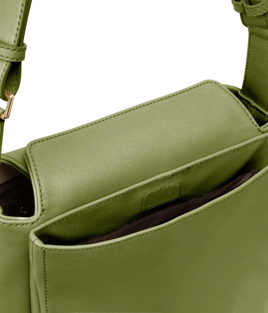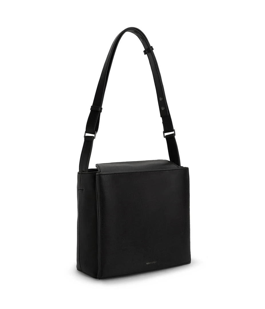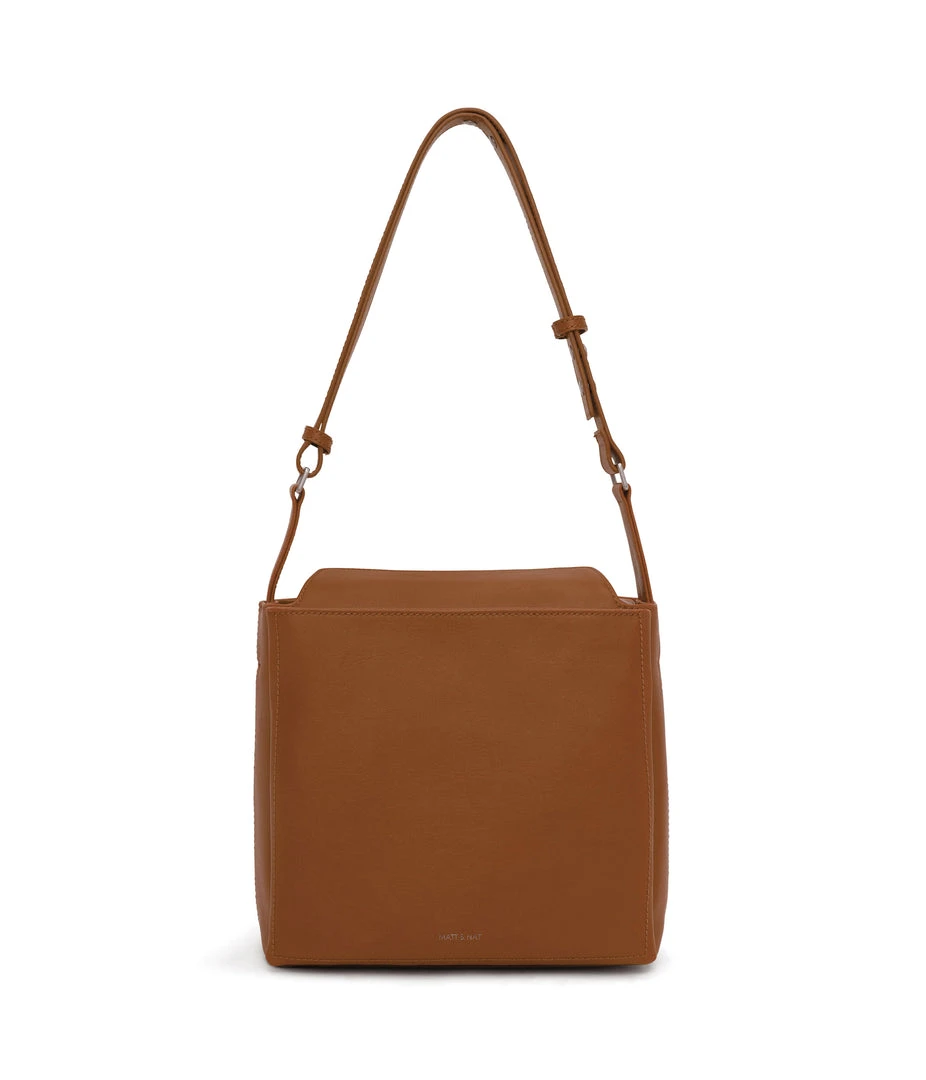 Shoulder bag with a top overlapped flap closure, front slip pocket with hidden magnetic snap closure, and an adjustable strap that extends to wear as a crossbody. Fits an 11″ iPad.