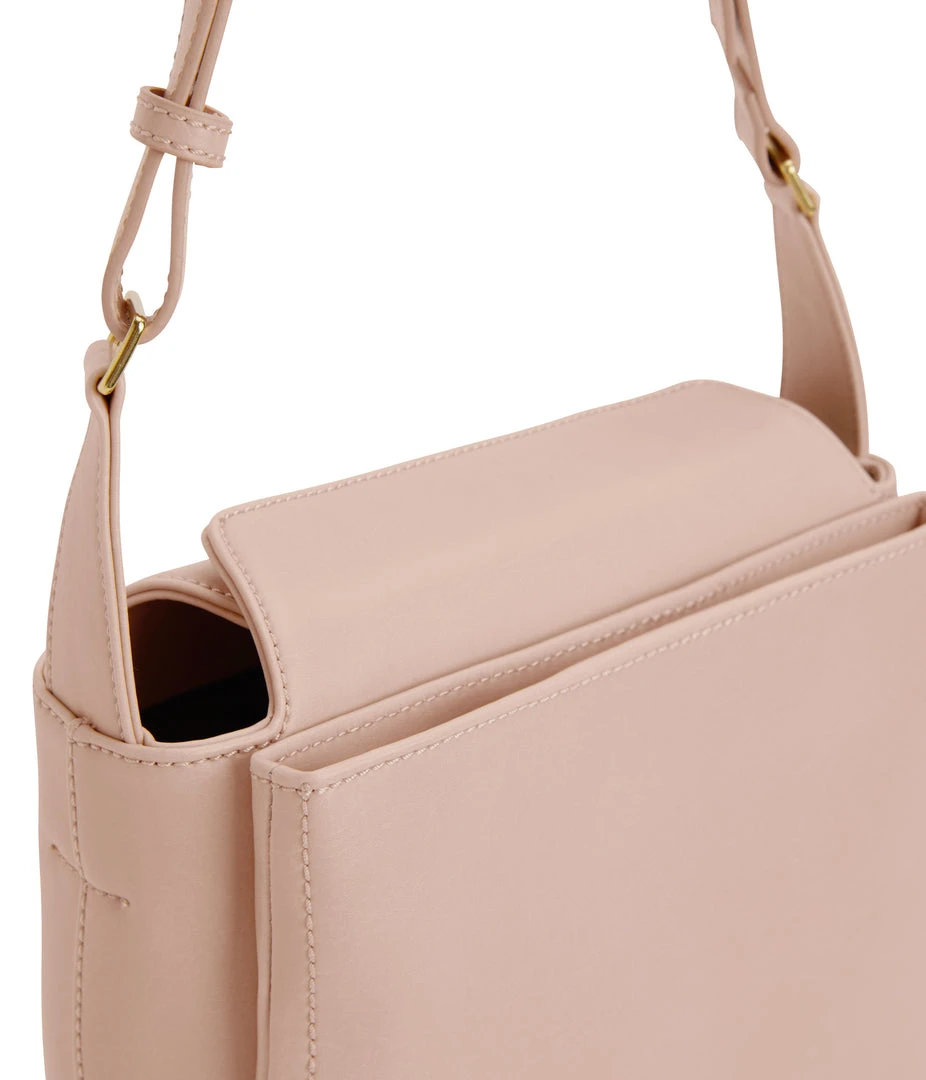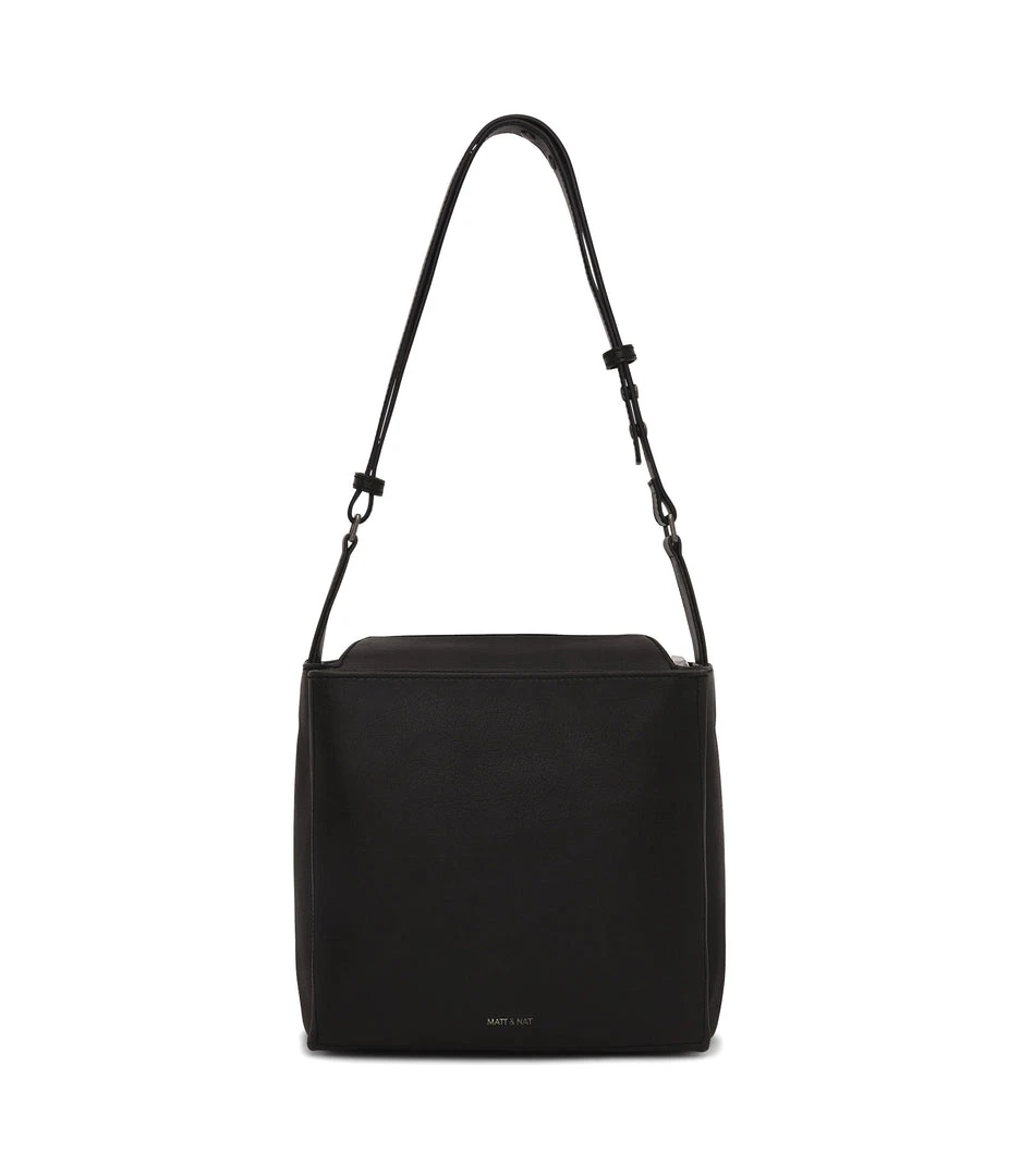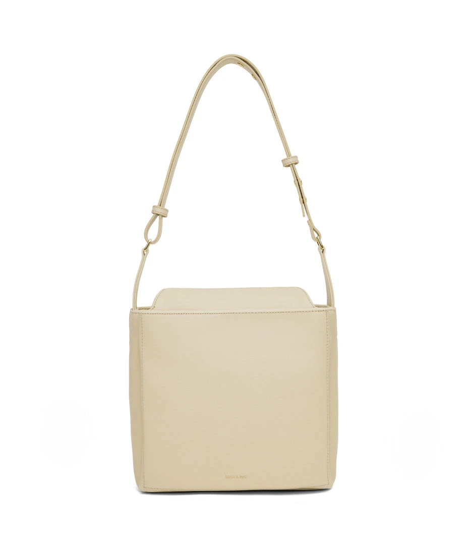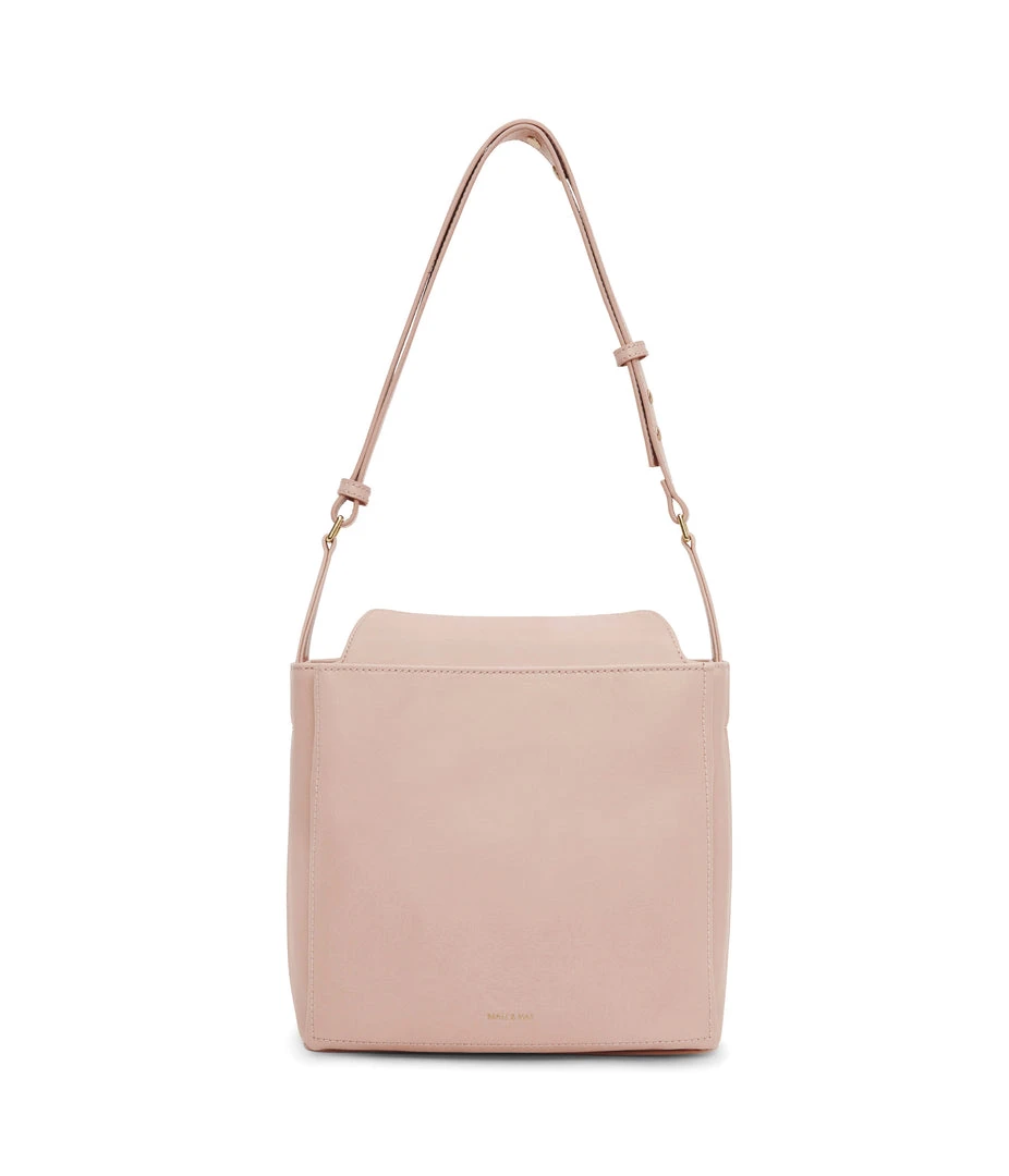 Shoulder bag with a top overlapped flap closure, front slip pocket with hidden magnetic snap closure, and an adjustable strap that extends to wear as a crossbody. Fits an 11″ iPad.