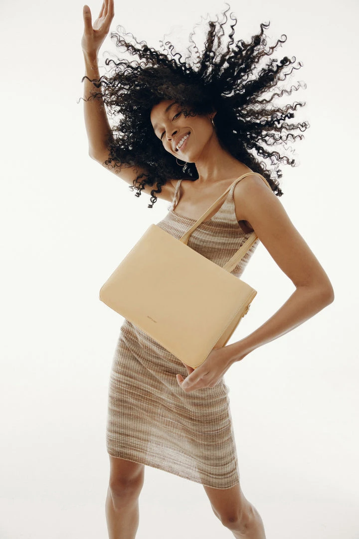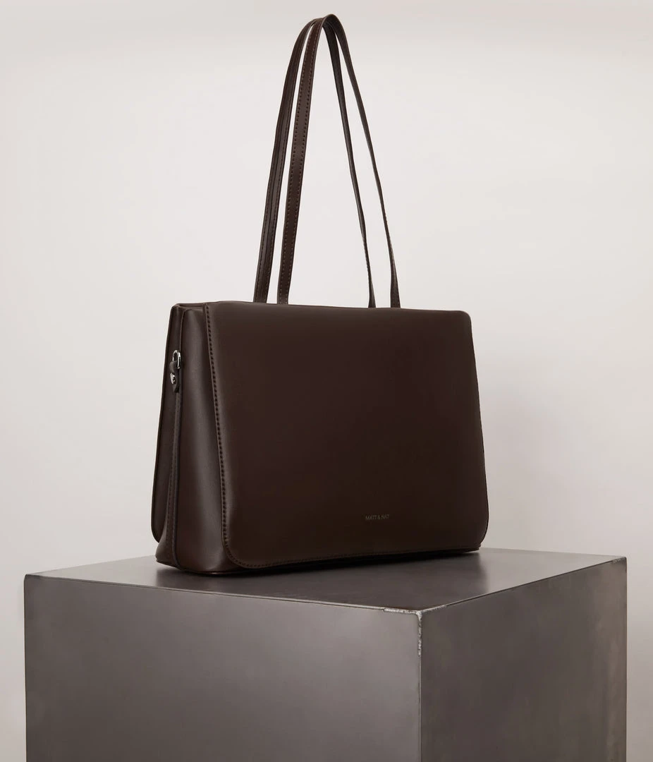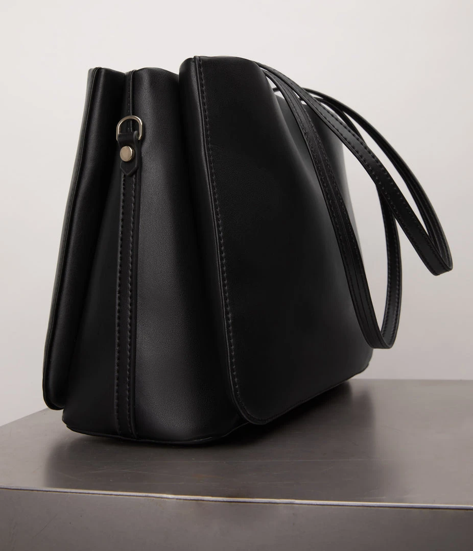 Three compartment satchel with handles to carry over the shoulder. Main center compartment with zipper closure and slip compartments with magnetic closure on the front and back. Adjustable crossbody strap included.