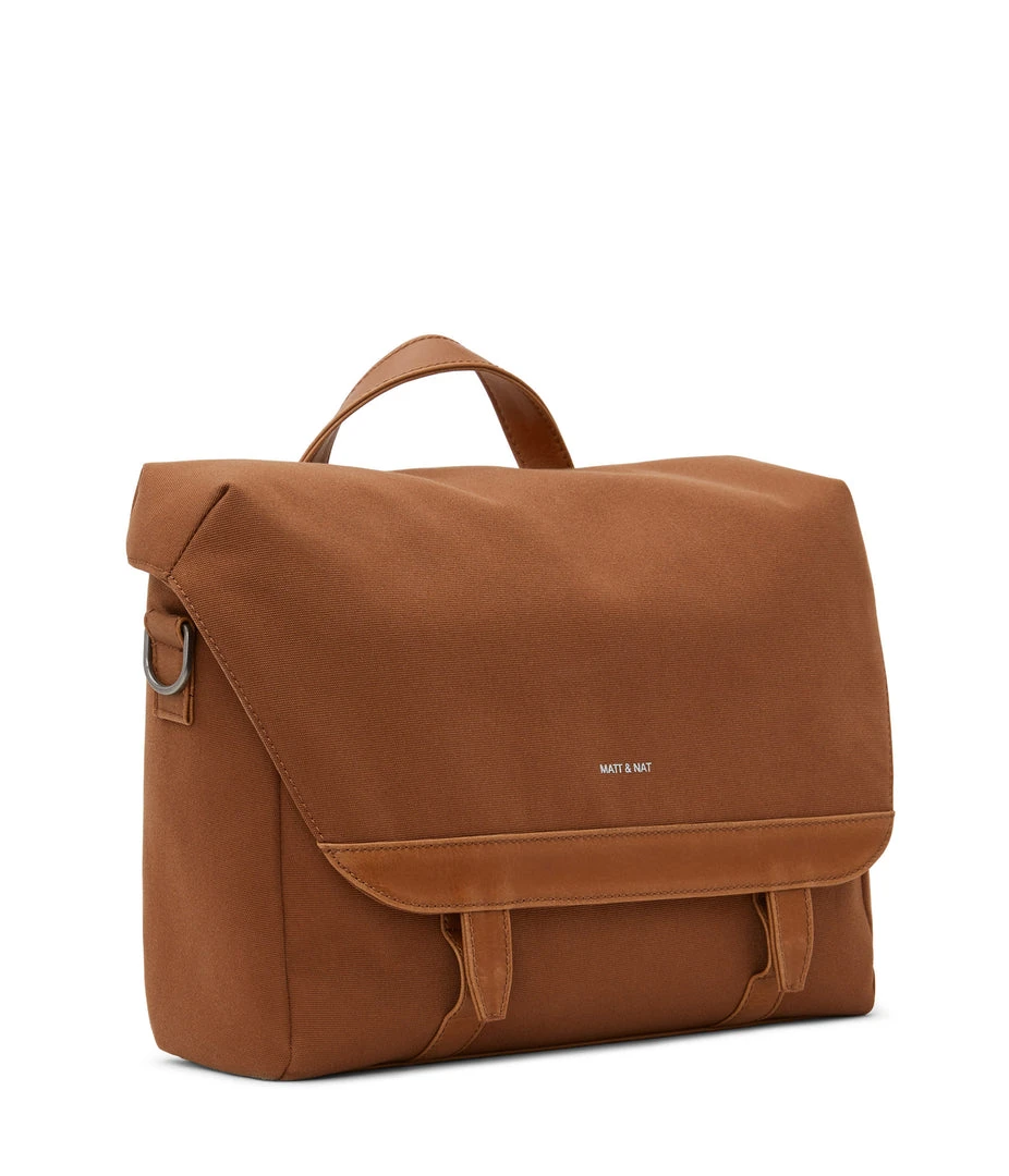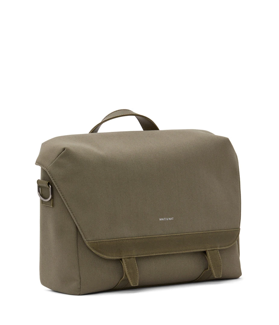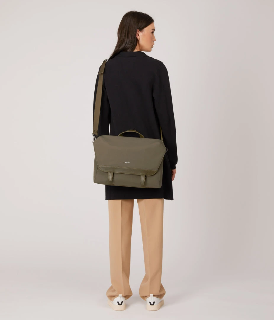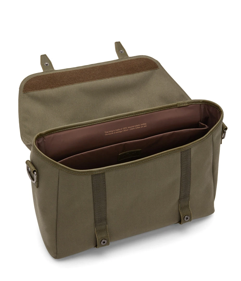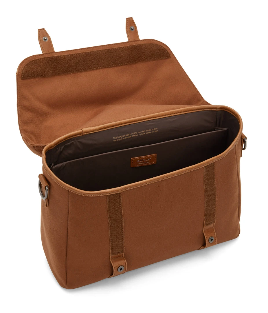 Messenger bag with adjustable shoulder strap. Front flap with snap and velcro closure. Fits a 13” laptop.