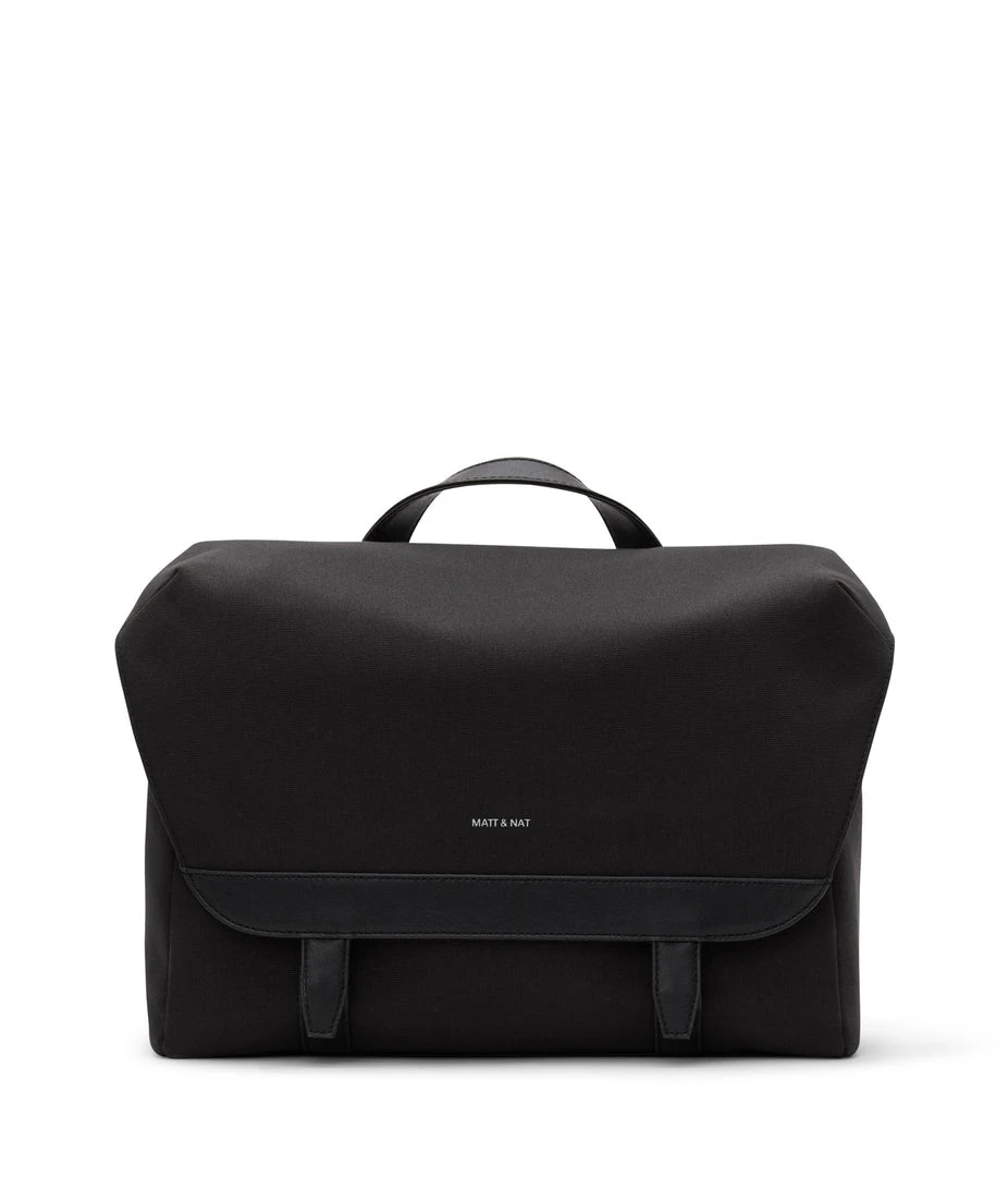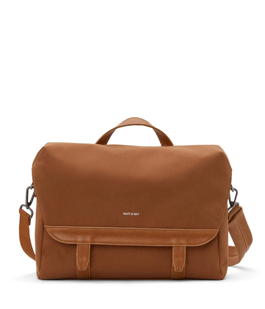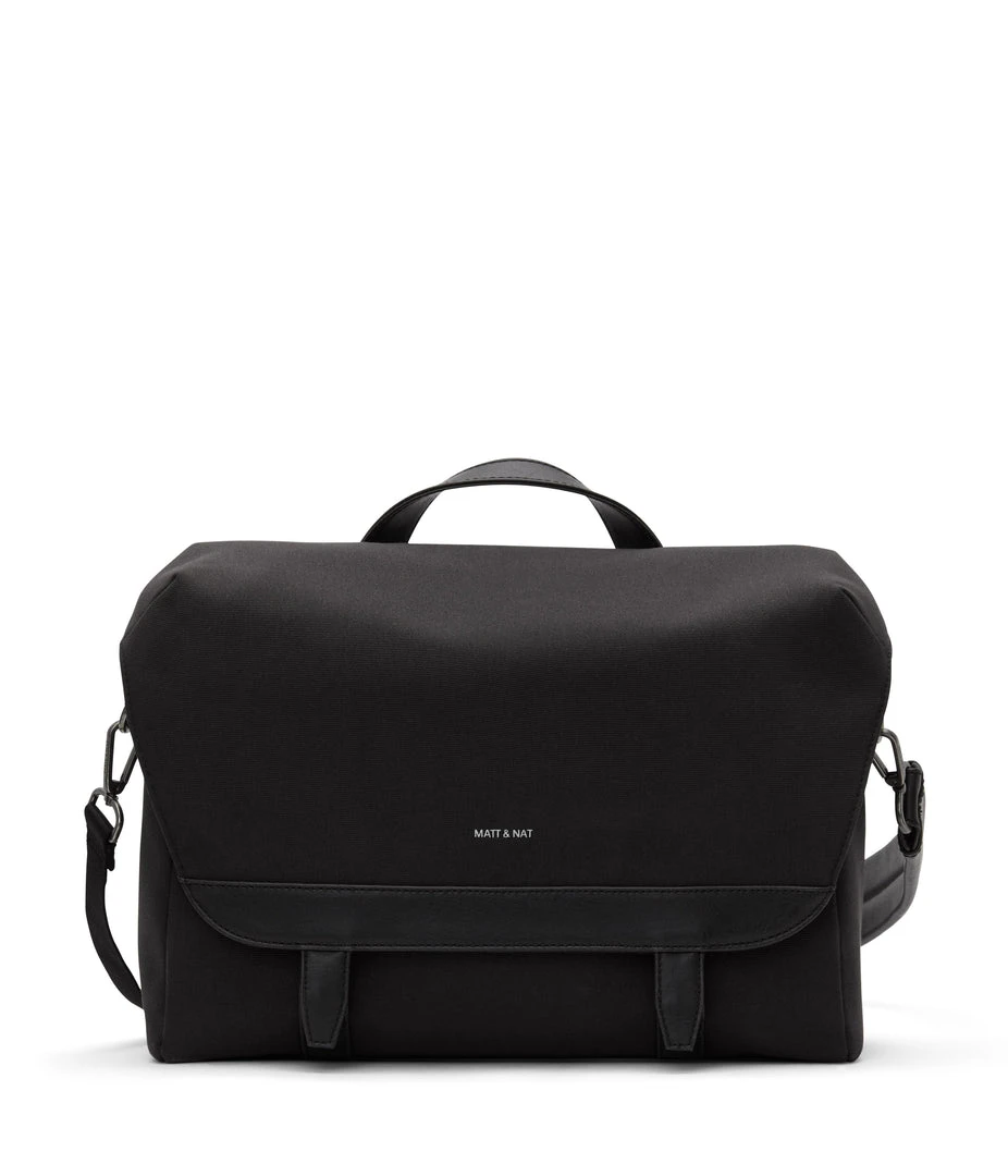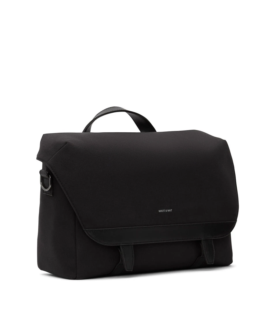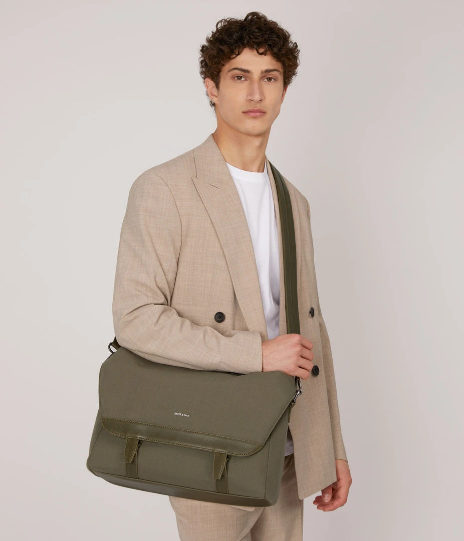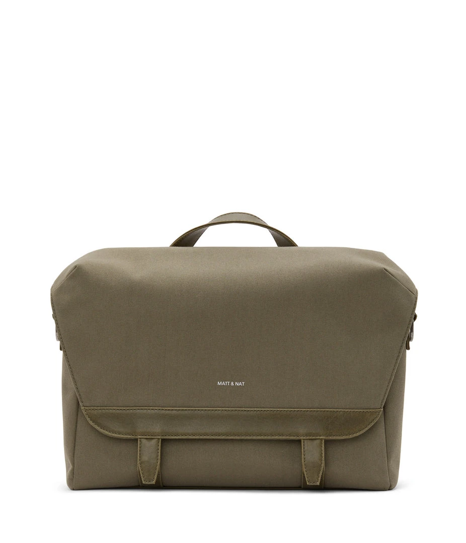Messenger bag with adjustable shoulder strap. Front flap with snap and velcro closure. Fits a 13” laptop.
