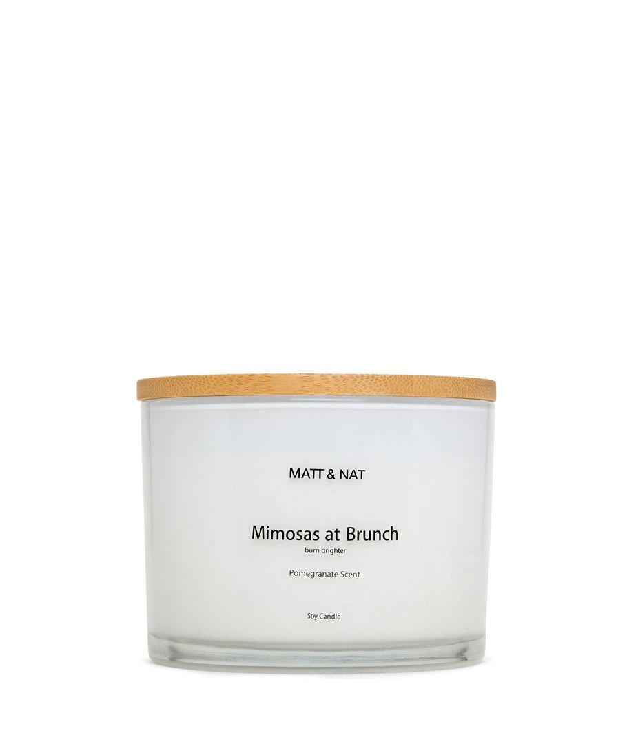 Mists of golden mimosa float above hints of fresh pomegranate. Comes in a frosted glass jar with a removable bamboo logo embossed lid candle cover and is packaged into a beautifully crafted MATT & NAT box.