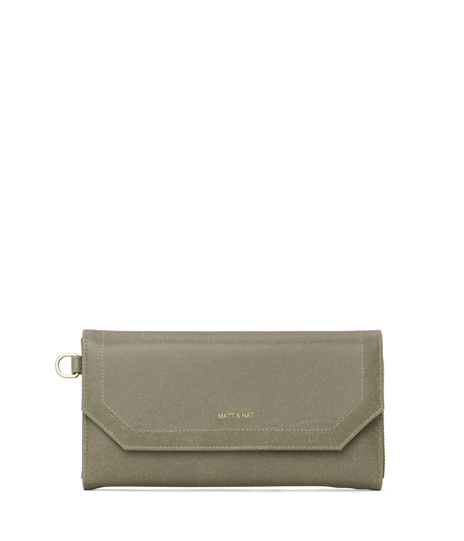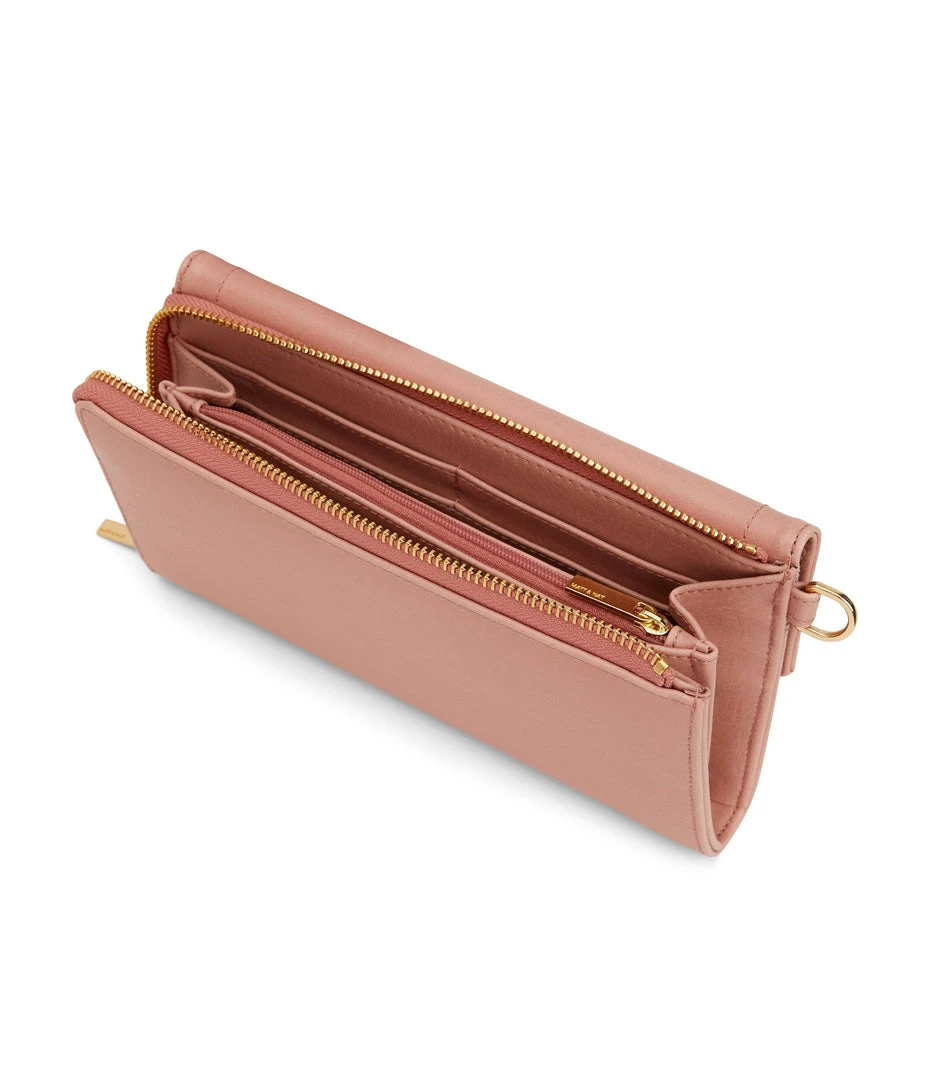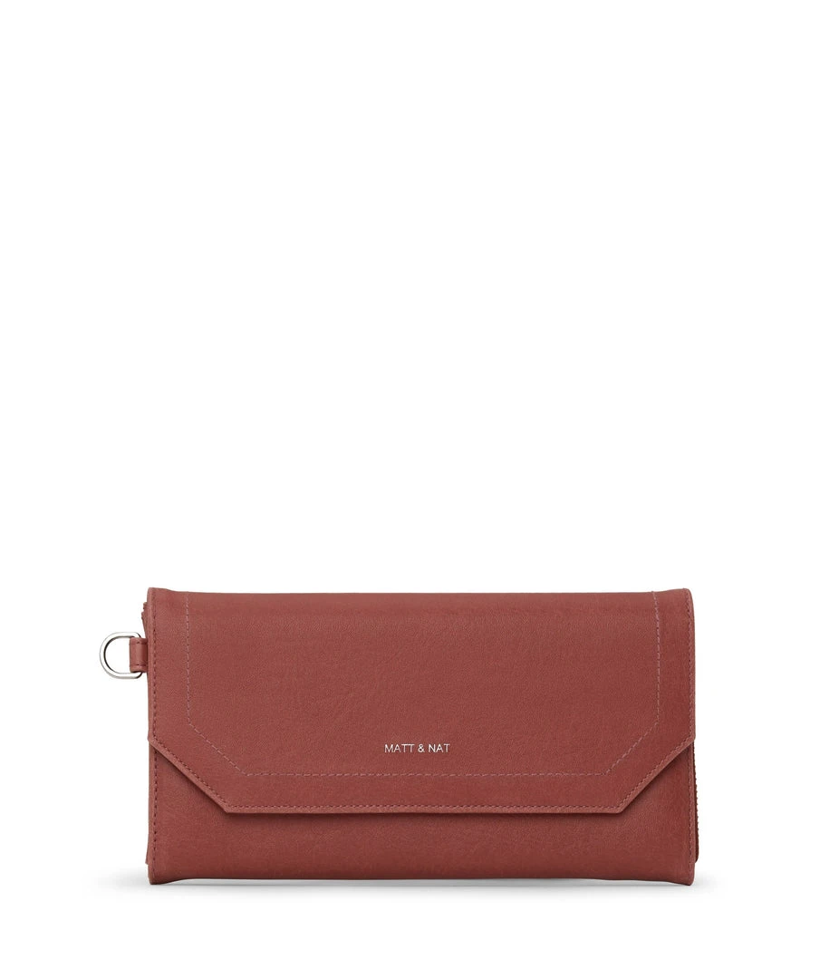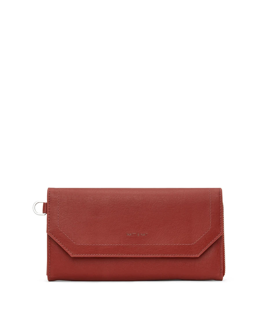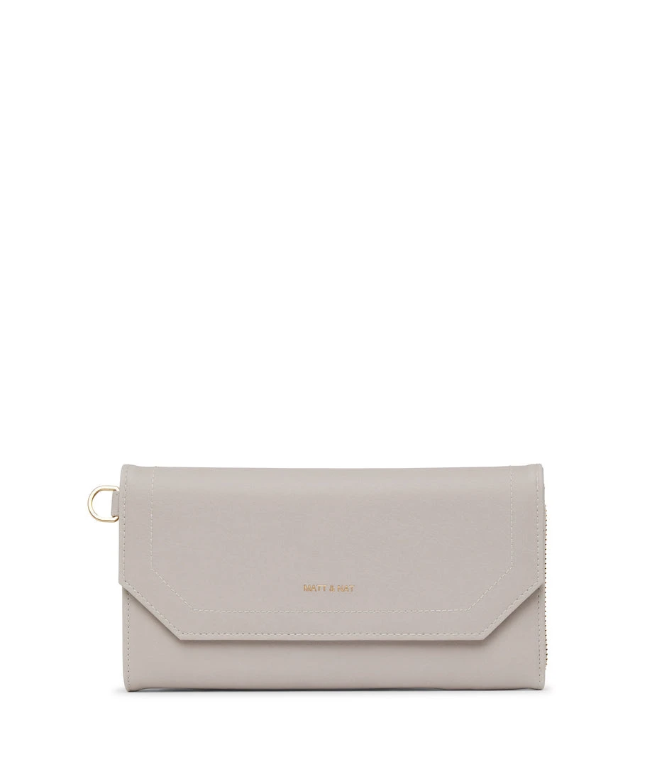 Large wallet with a detachable wristlet. The front flap pocket features 6 credit card slots and 1 slip pocket. The main zippered pocket features 12 credit card slots and a zippered coin pocket. Fits an iPhone 11 Pro Max.