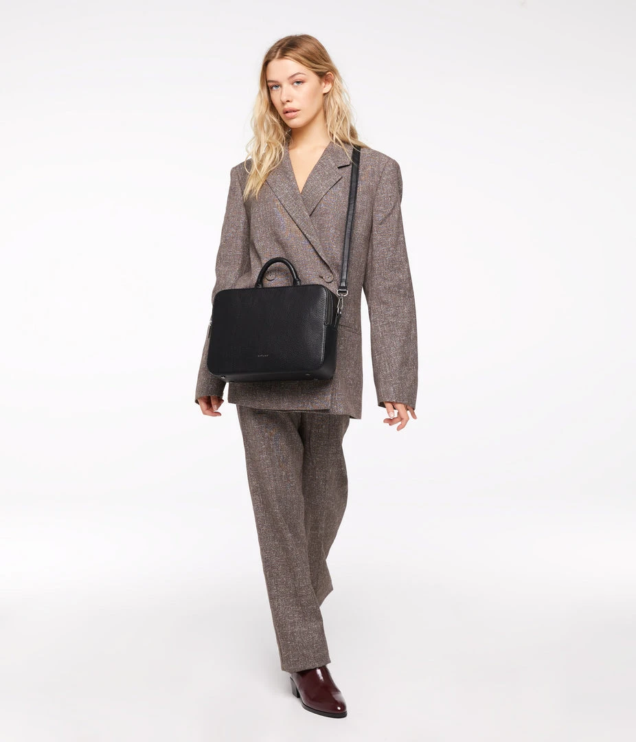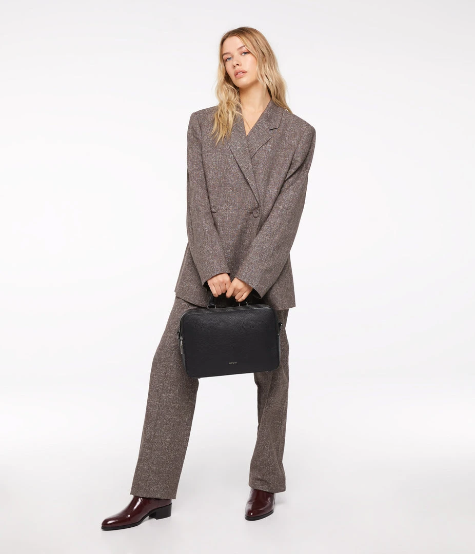 Top handle satchel with 2 main zipper compartments and metal protective feet at the bottom. Comes with a detachable and adjustable crossbody bag.