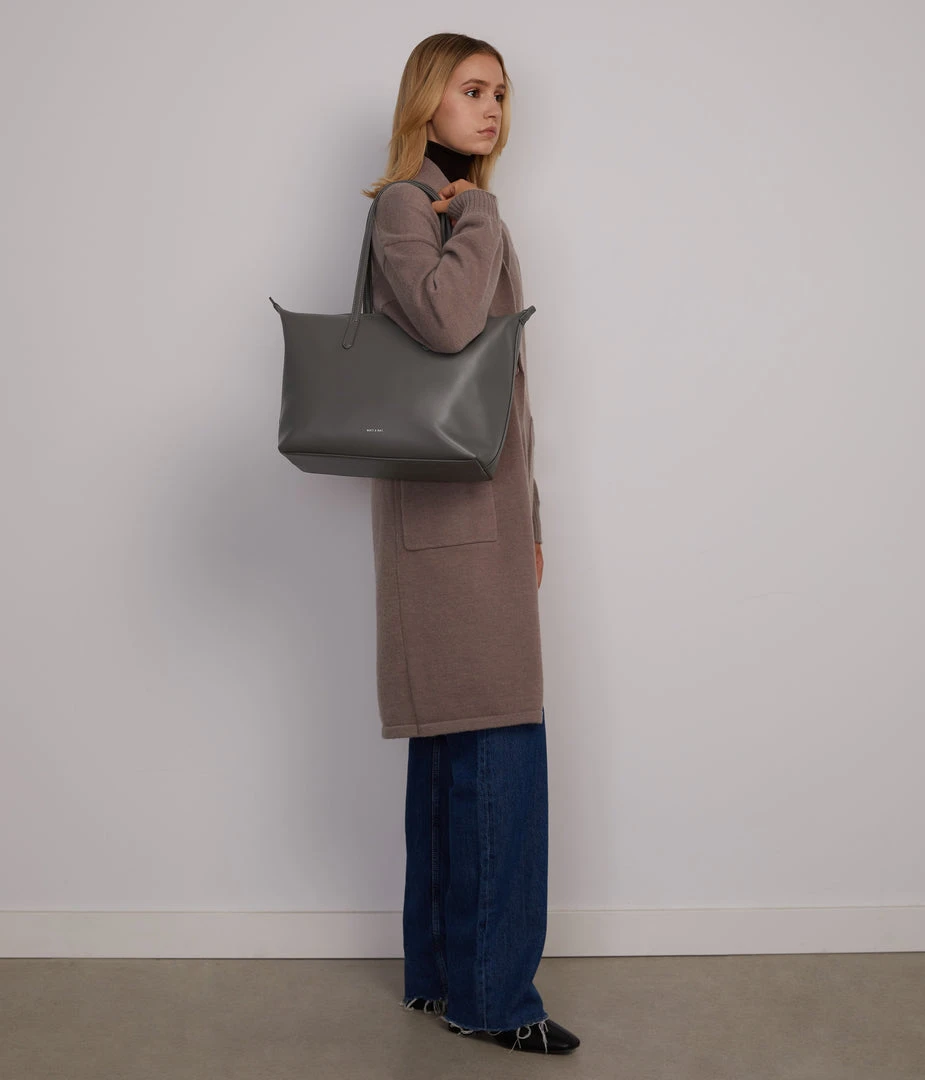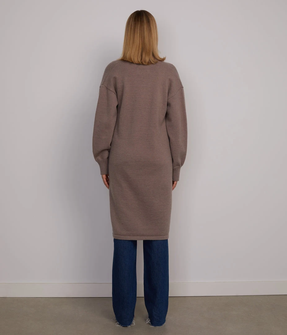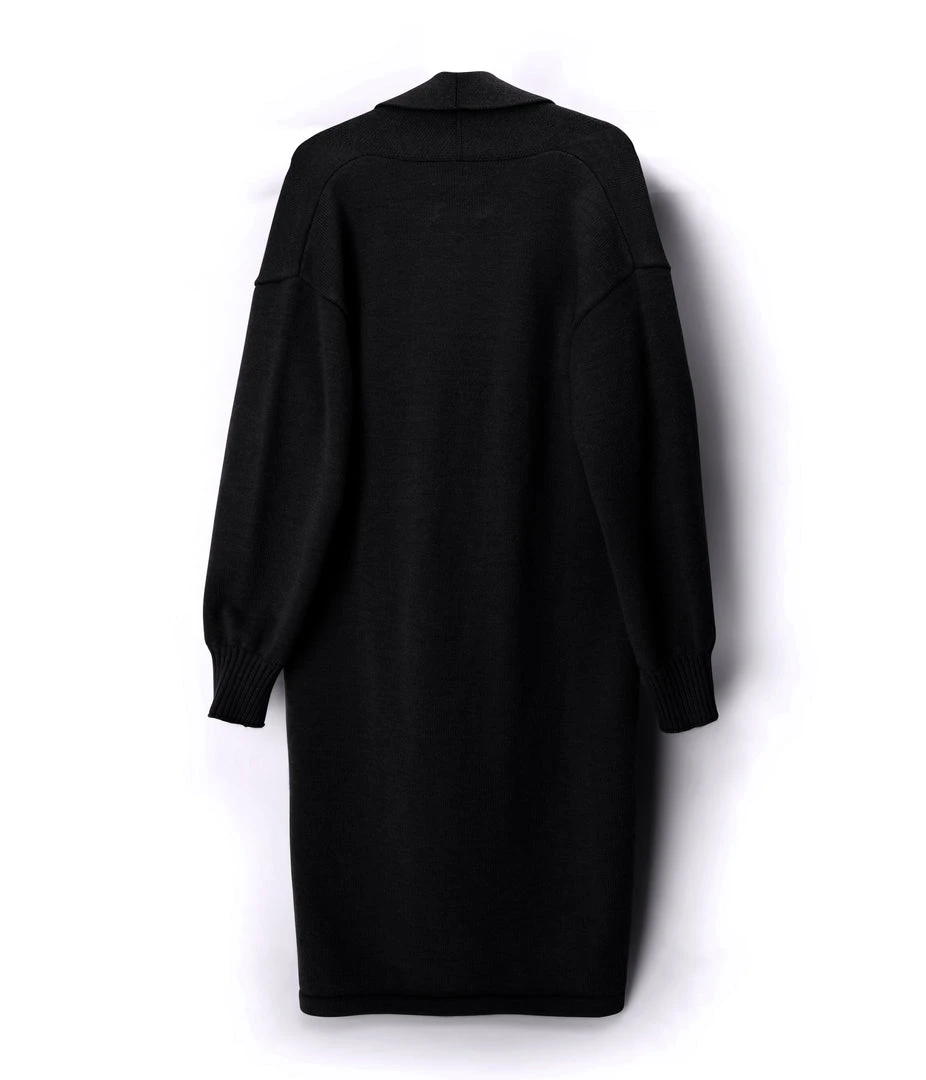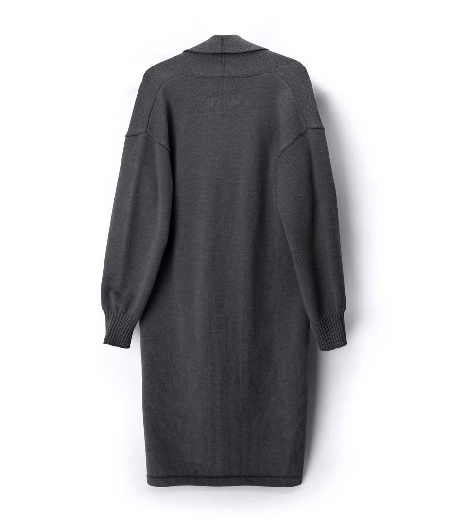 Long sleeve knee-length cardigan with single-button closure, shawl collar, large patch pockets, and rib finish at cuffs and pockets.