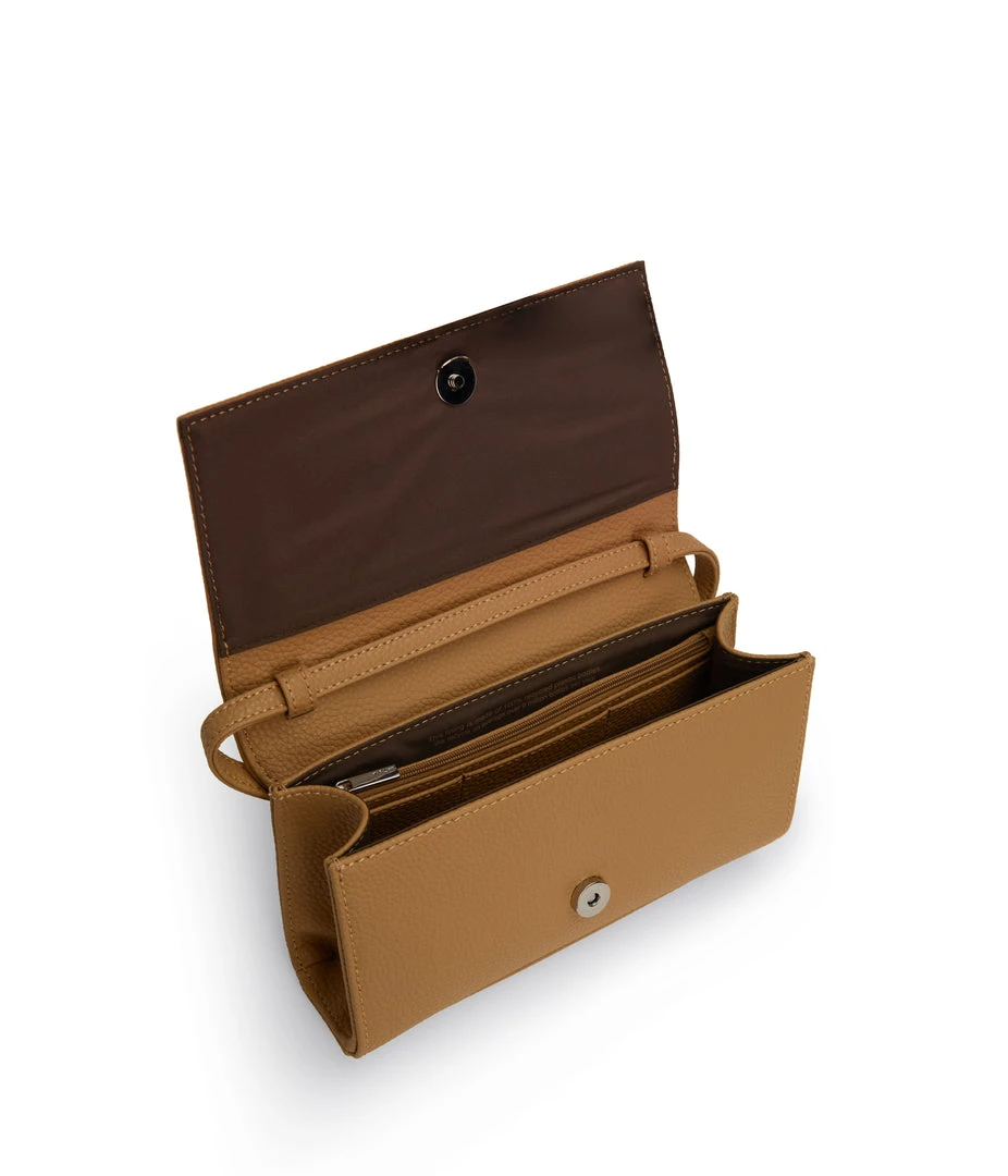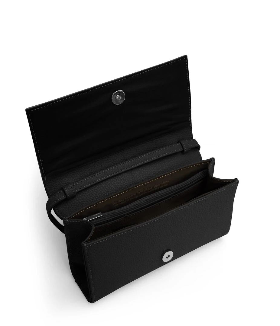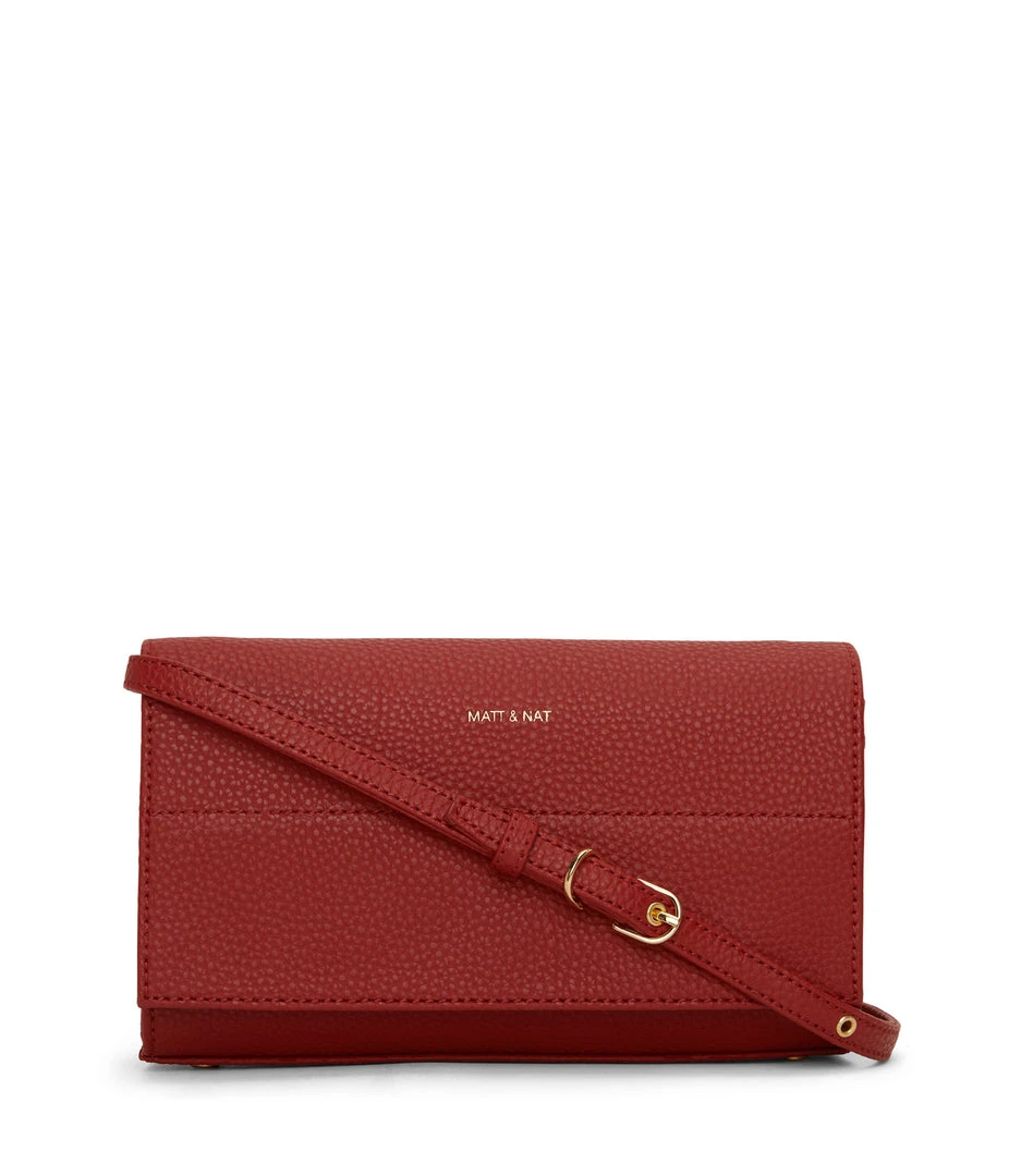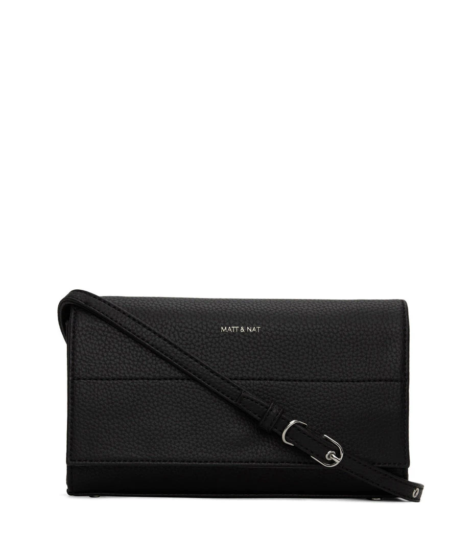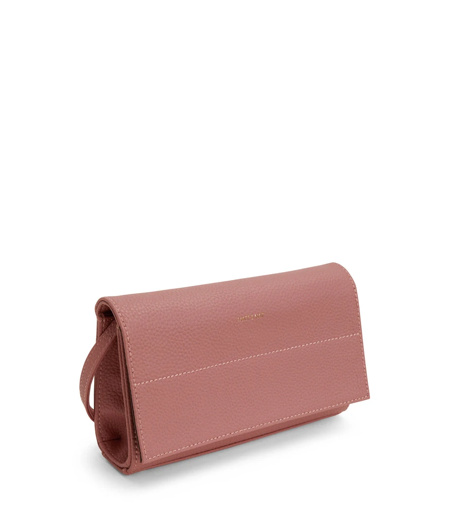 Crossbody bag with wallet features and a detachable and adjustable strap, metal feet at the base. Can be used as a clutch.