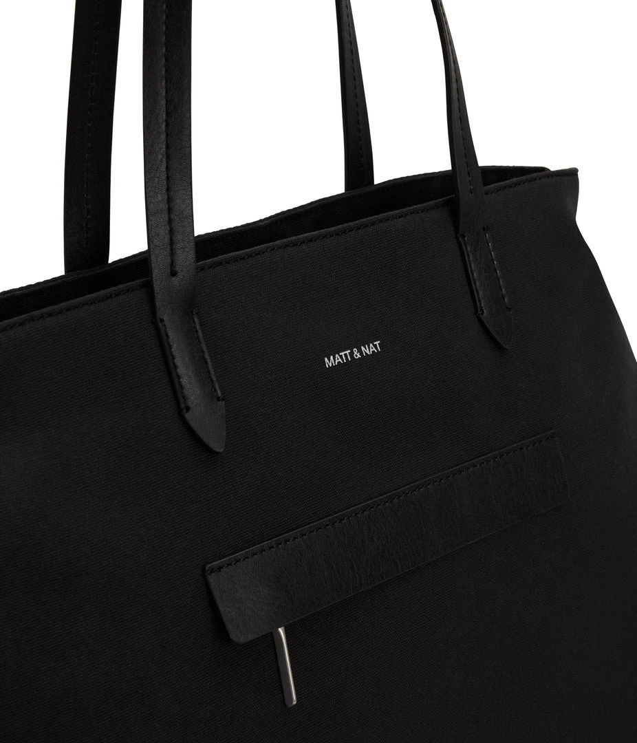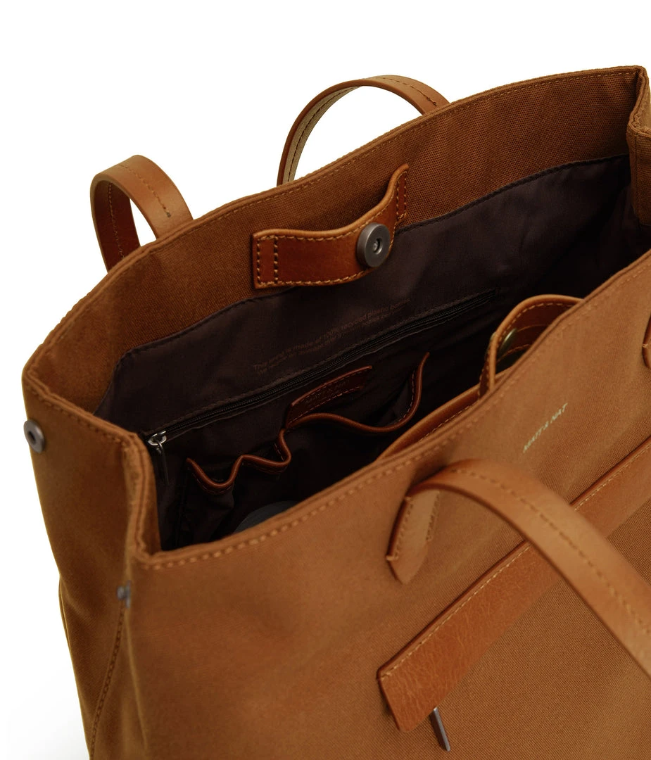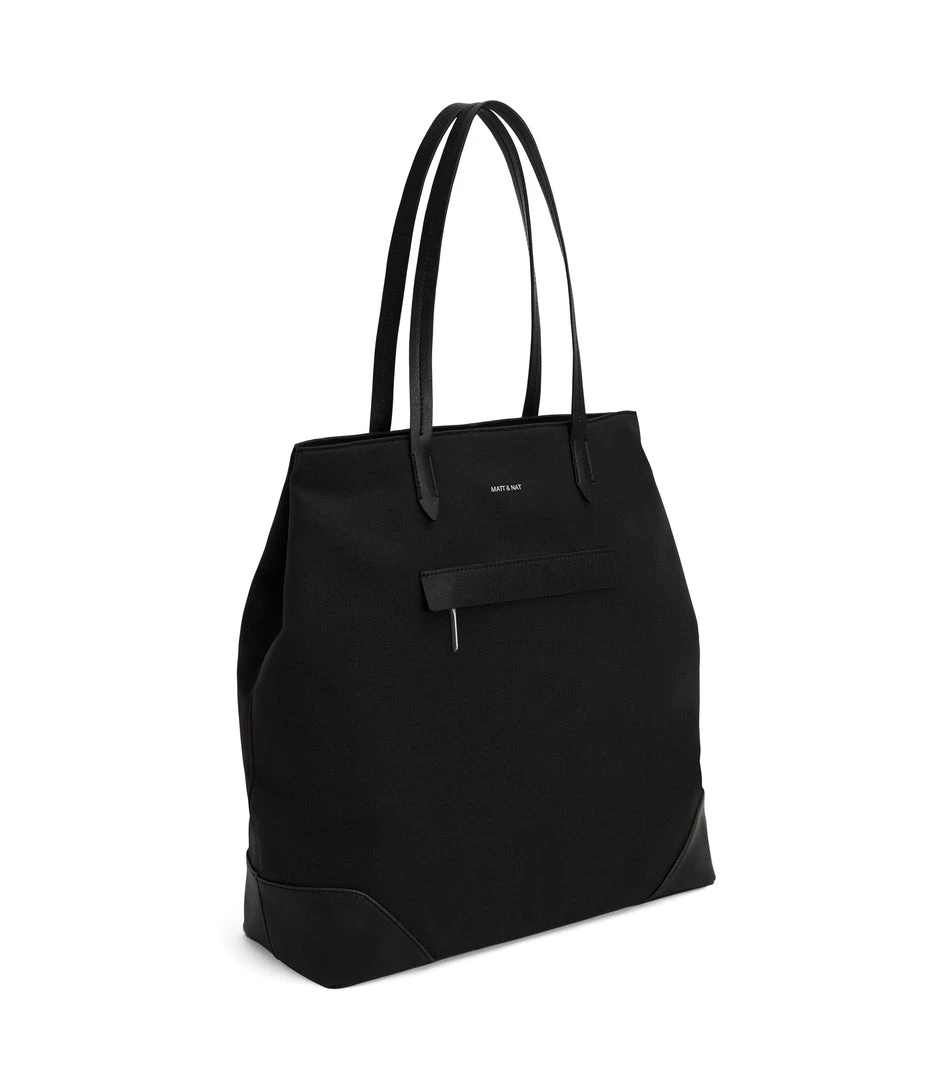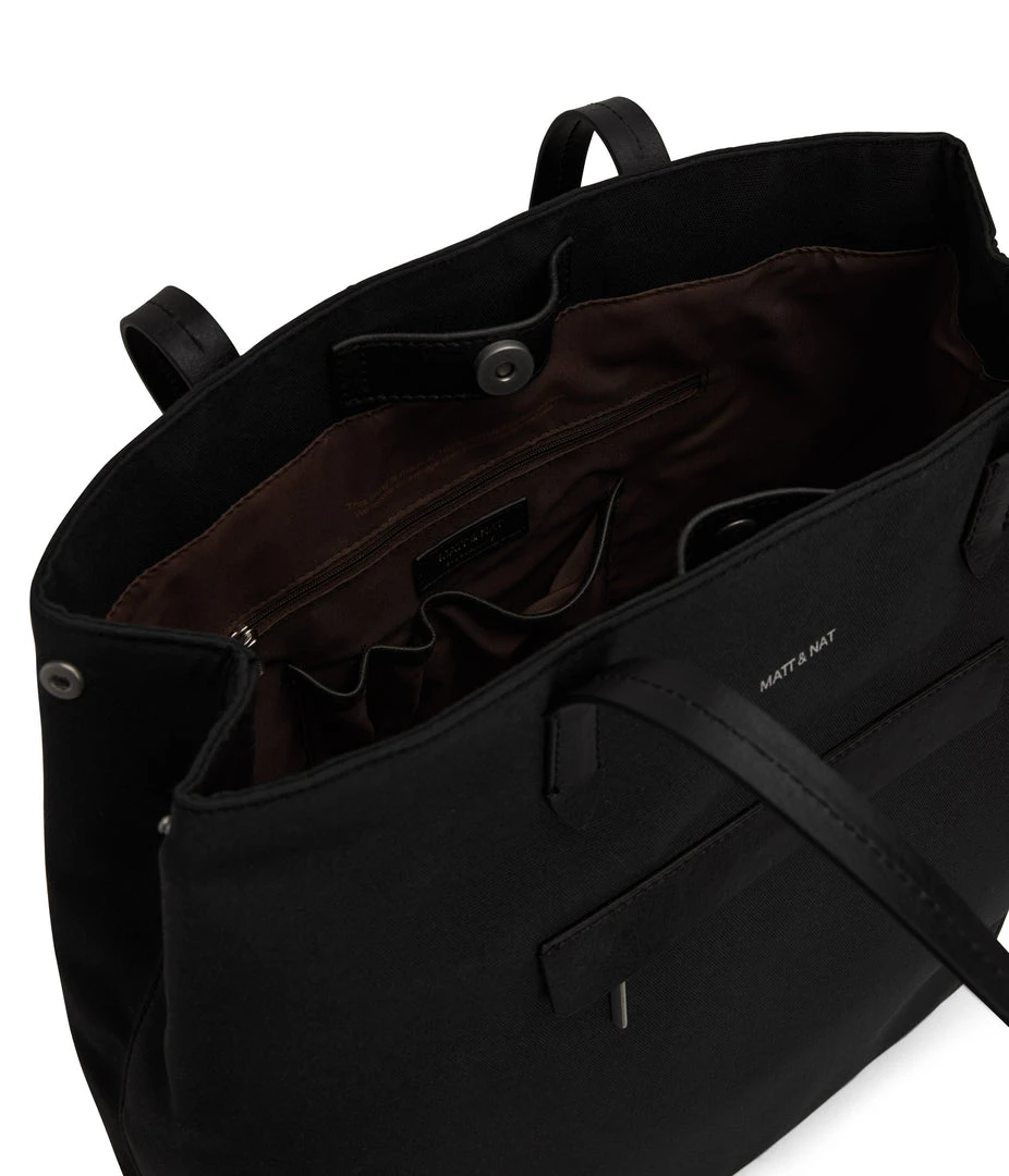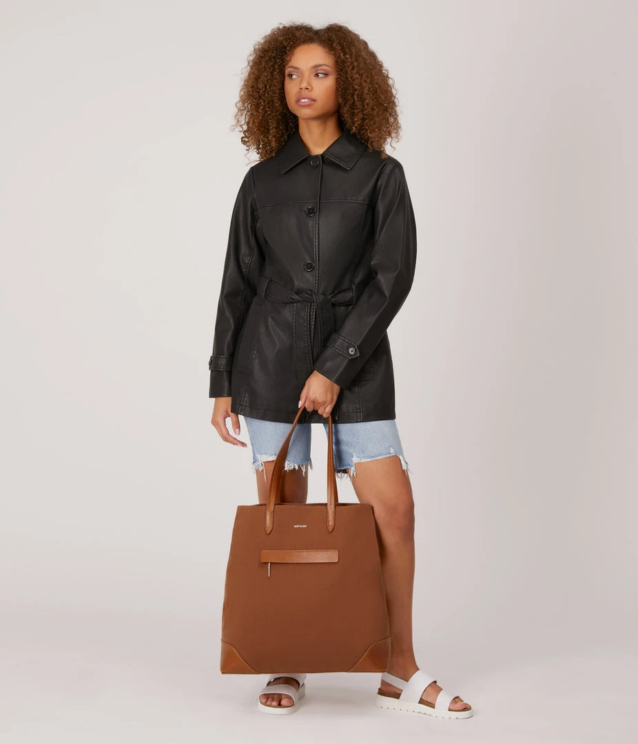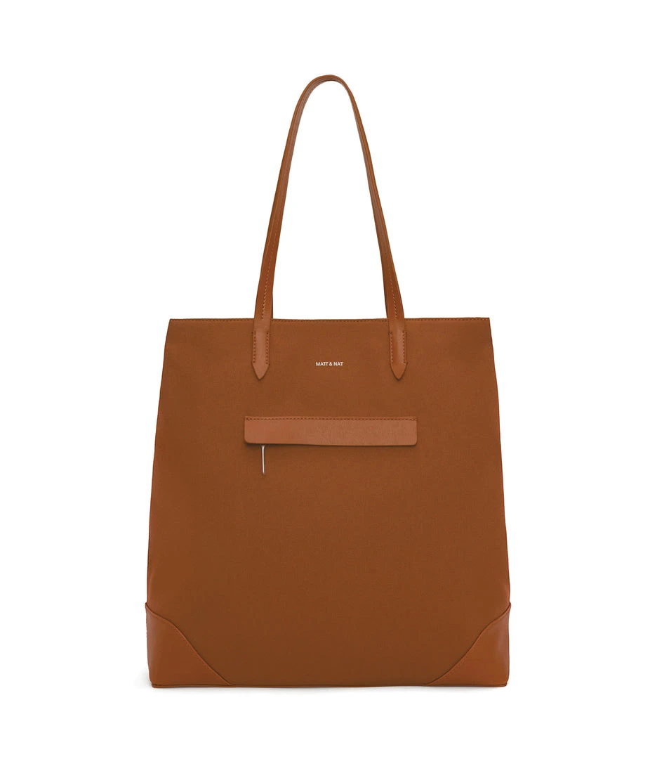 Large tote with magnetic snap closure, side upper snaps and a front covered zip pocket. Fits a 13″ laptop.
