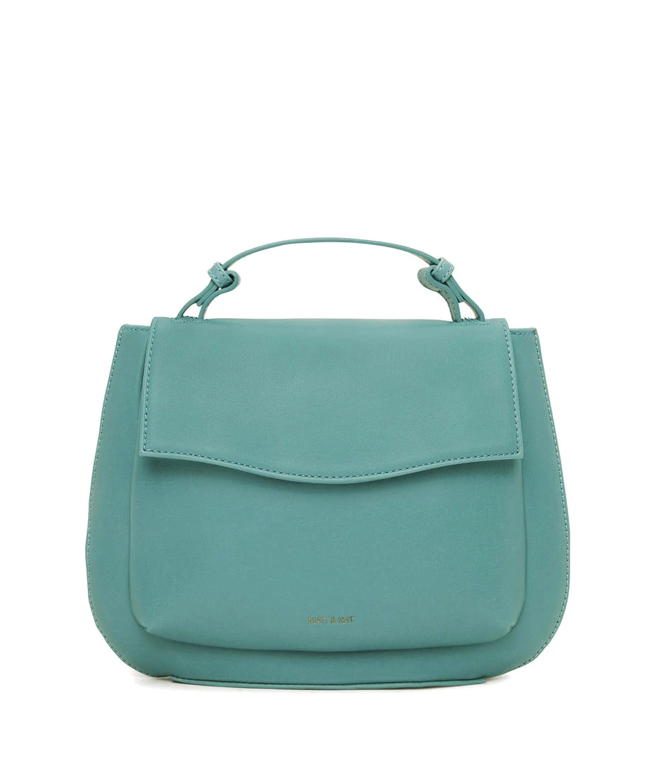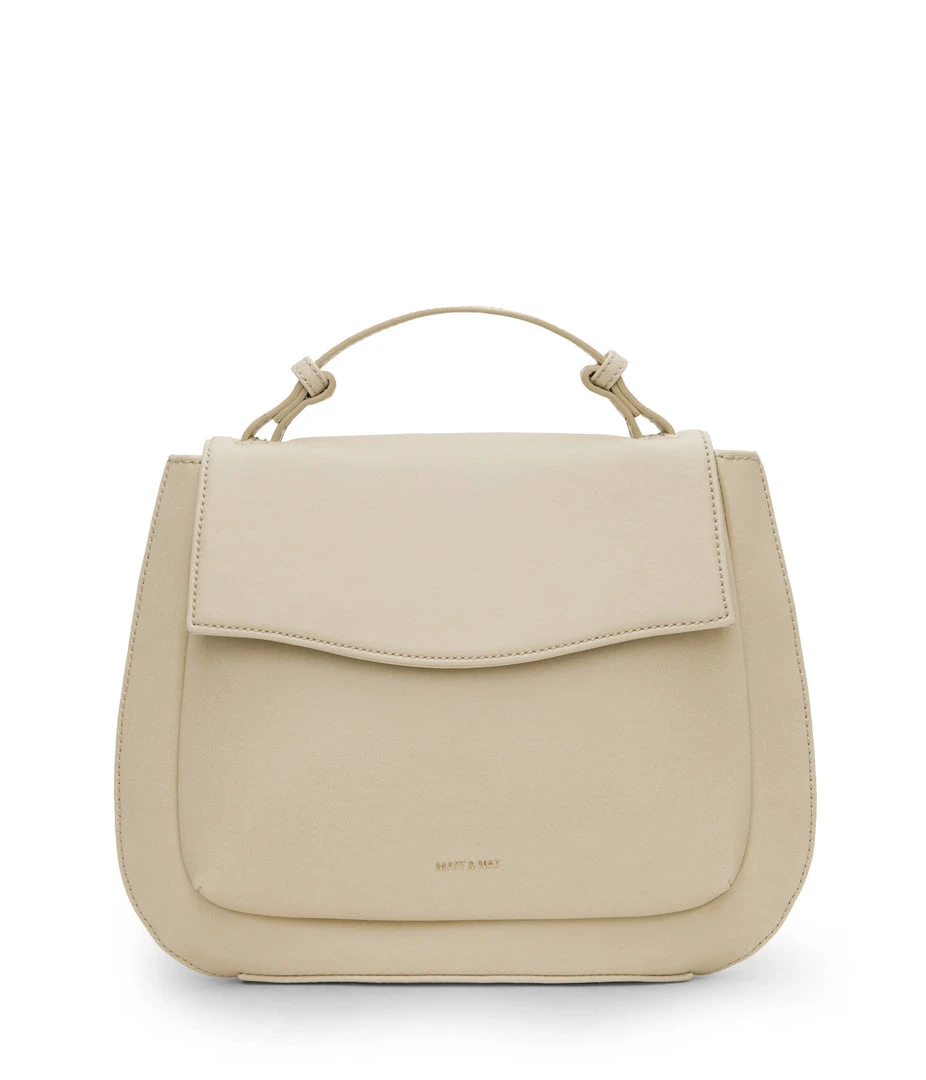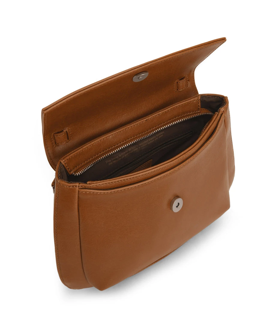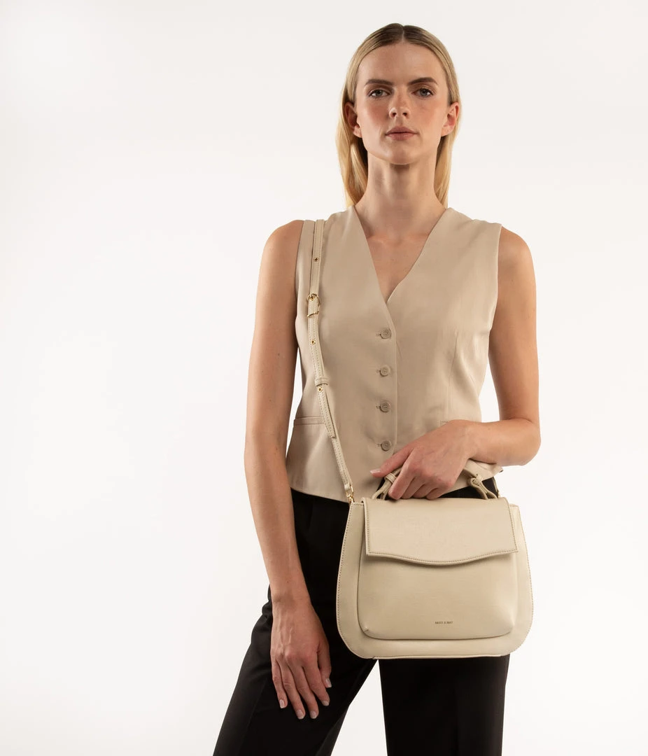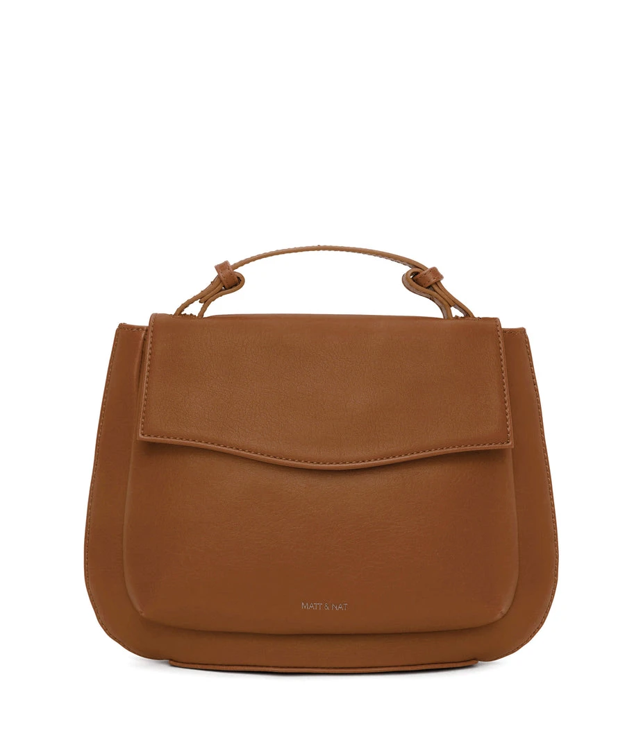 Crossbody bag with a top handle, flap closure with a zippered main compartment, and a front pocket. Comes with a detachable and adjustable strap.