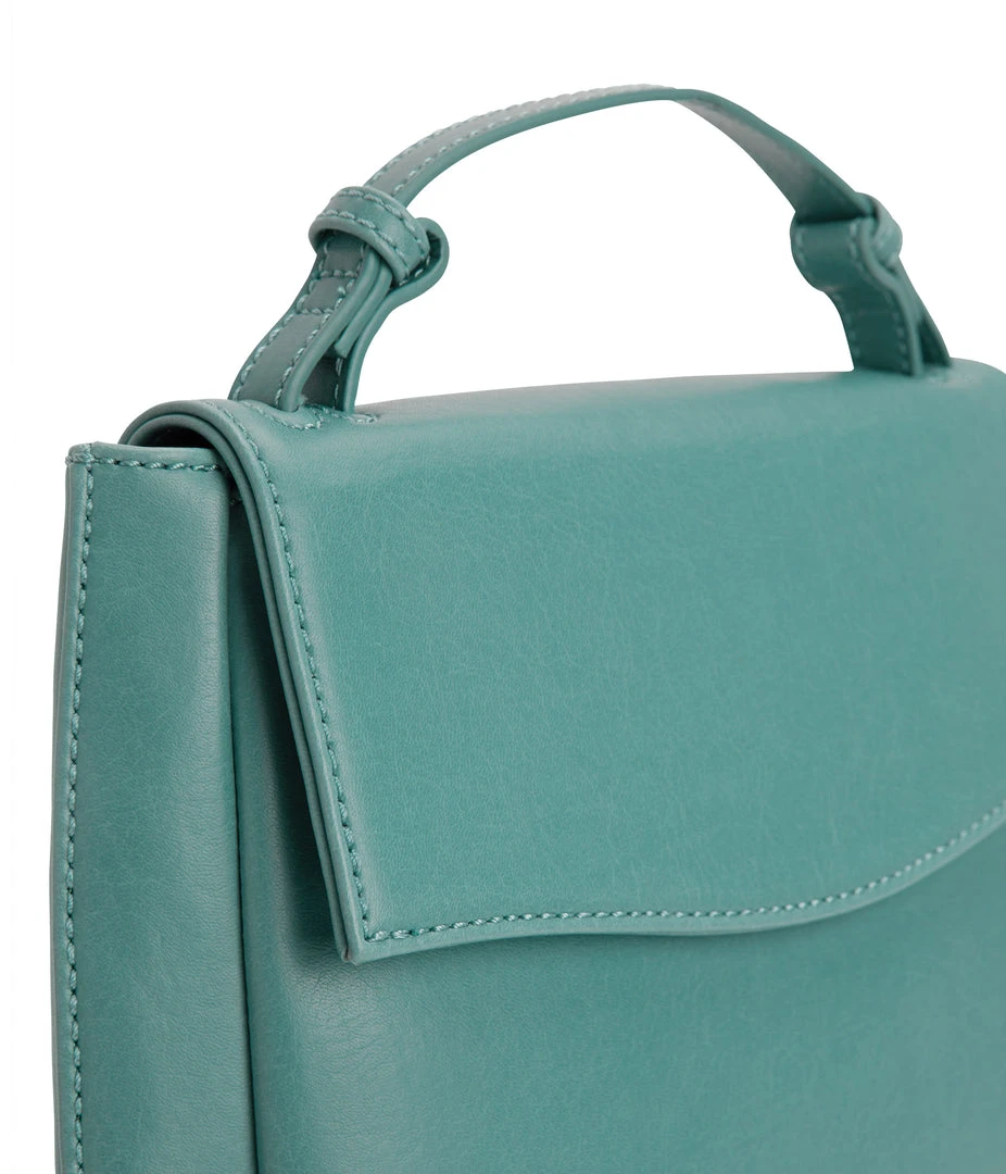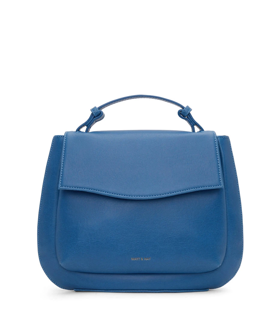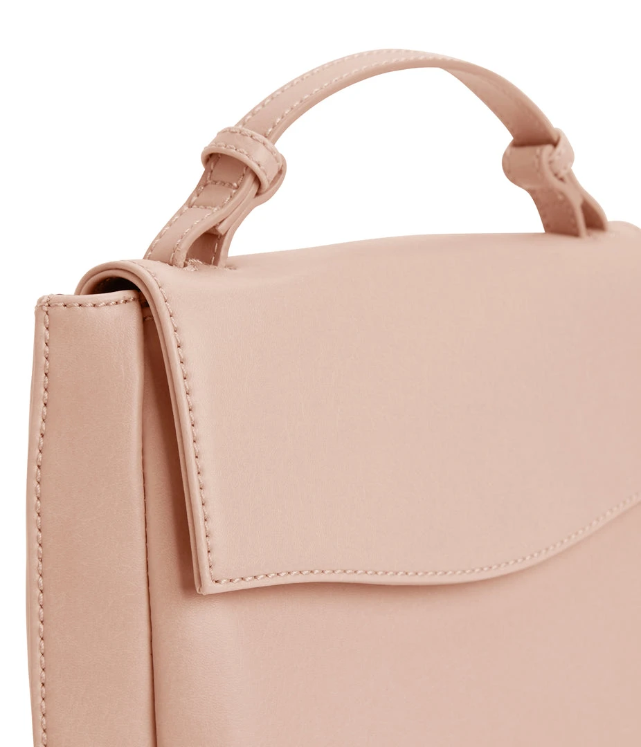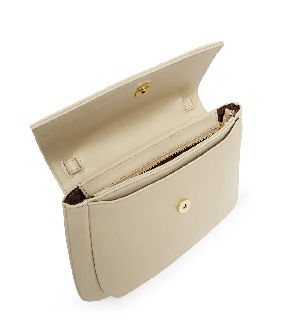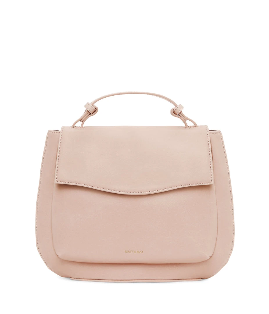 Crossbody bag with a top handle, flap closure with a zippered main compartment, and a front pocket. Comes with a detachable and adjustable strap.
