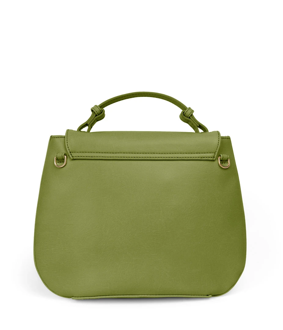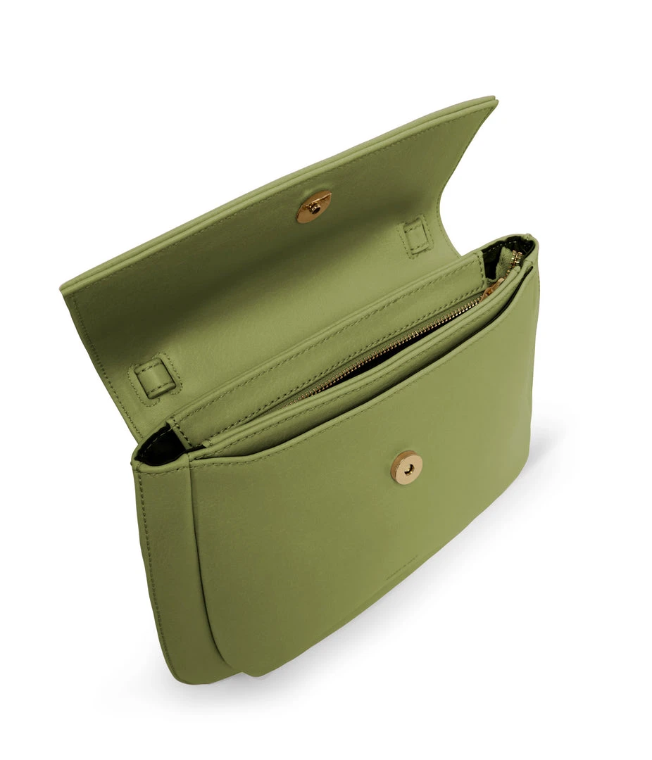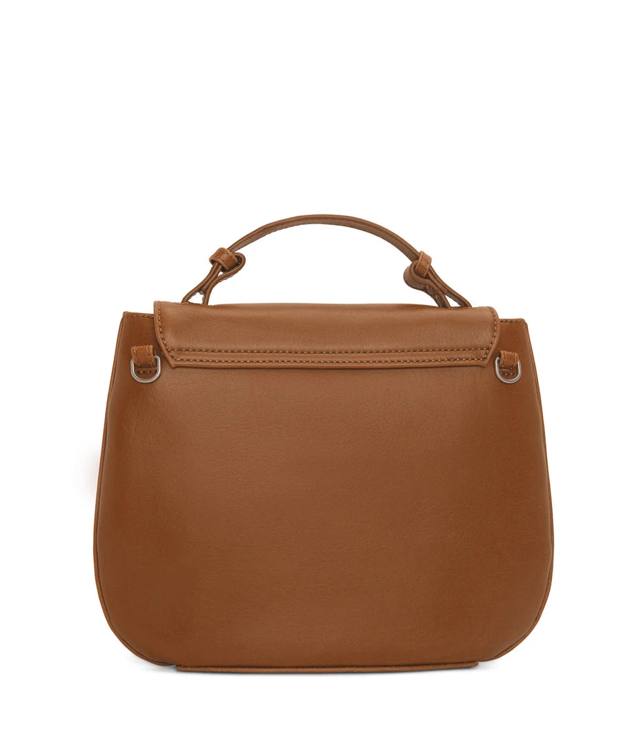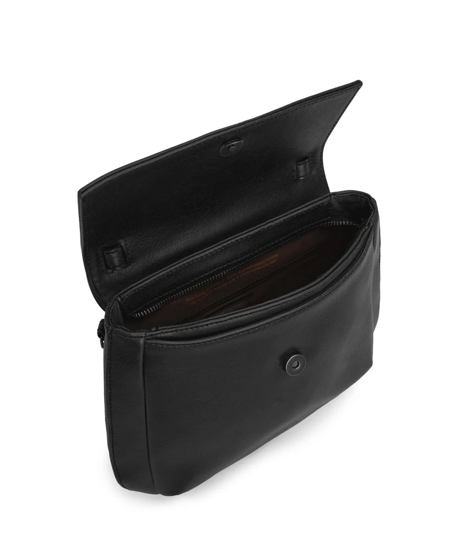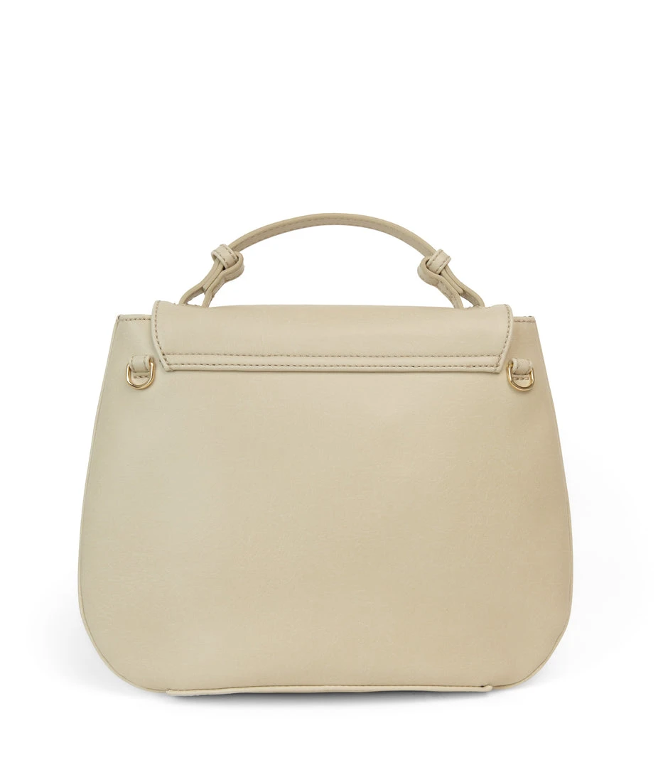 Crossbody bag with a top handle, flap closure with a zippered main compartment, and a front pocket. Comes with a detachable and adjustable strap.