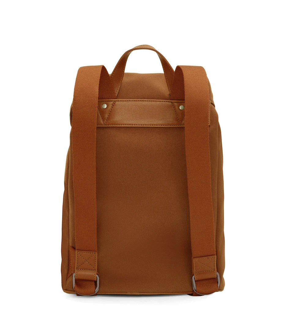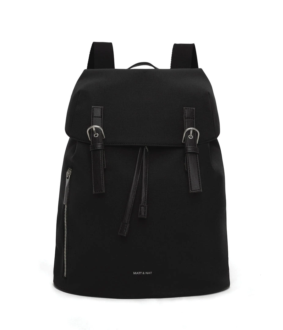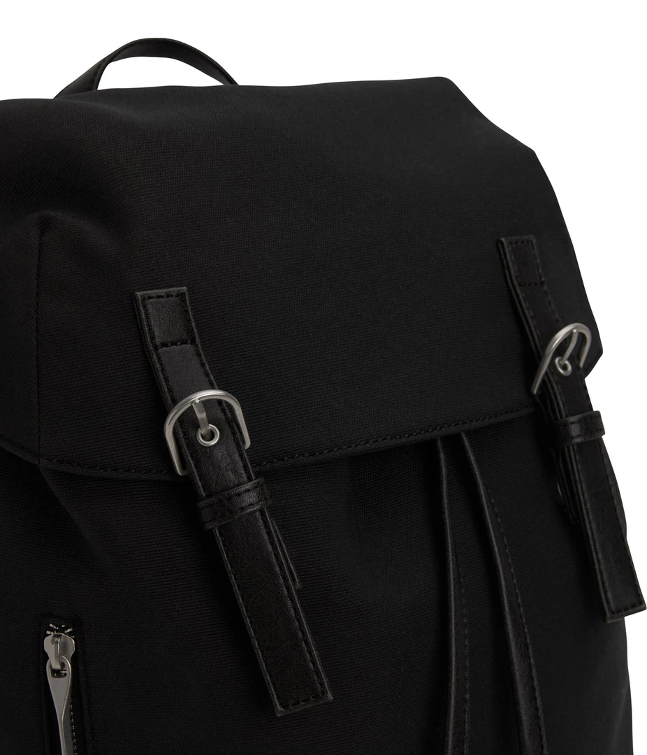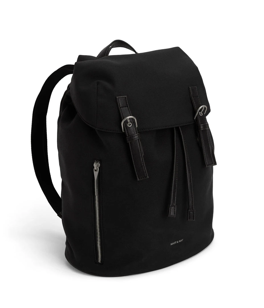 Backpack with drawstring and double magnetic snap flap closure, adjustable webbing straps, top handle, and a front zippered pocket. Fits an 11″ iPad.