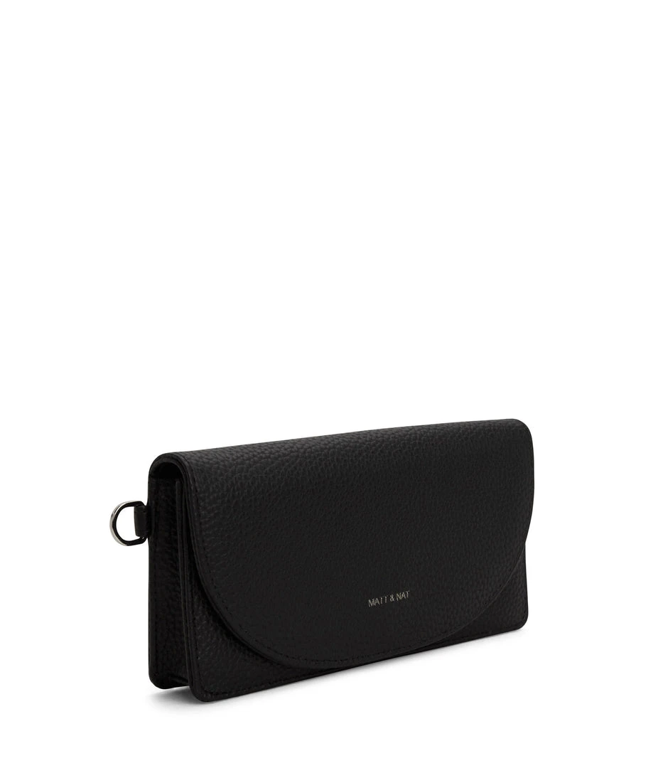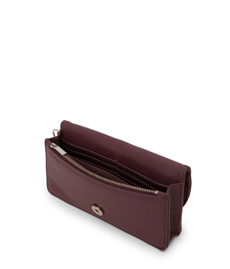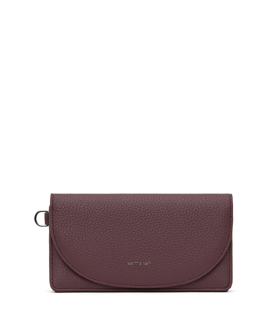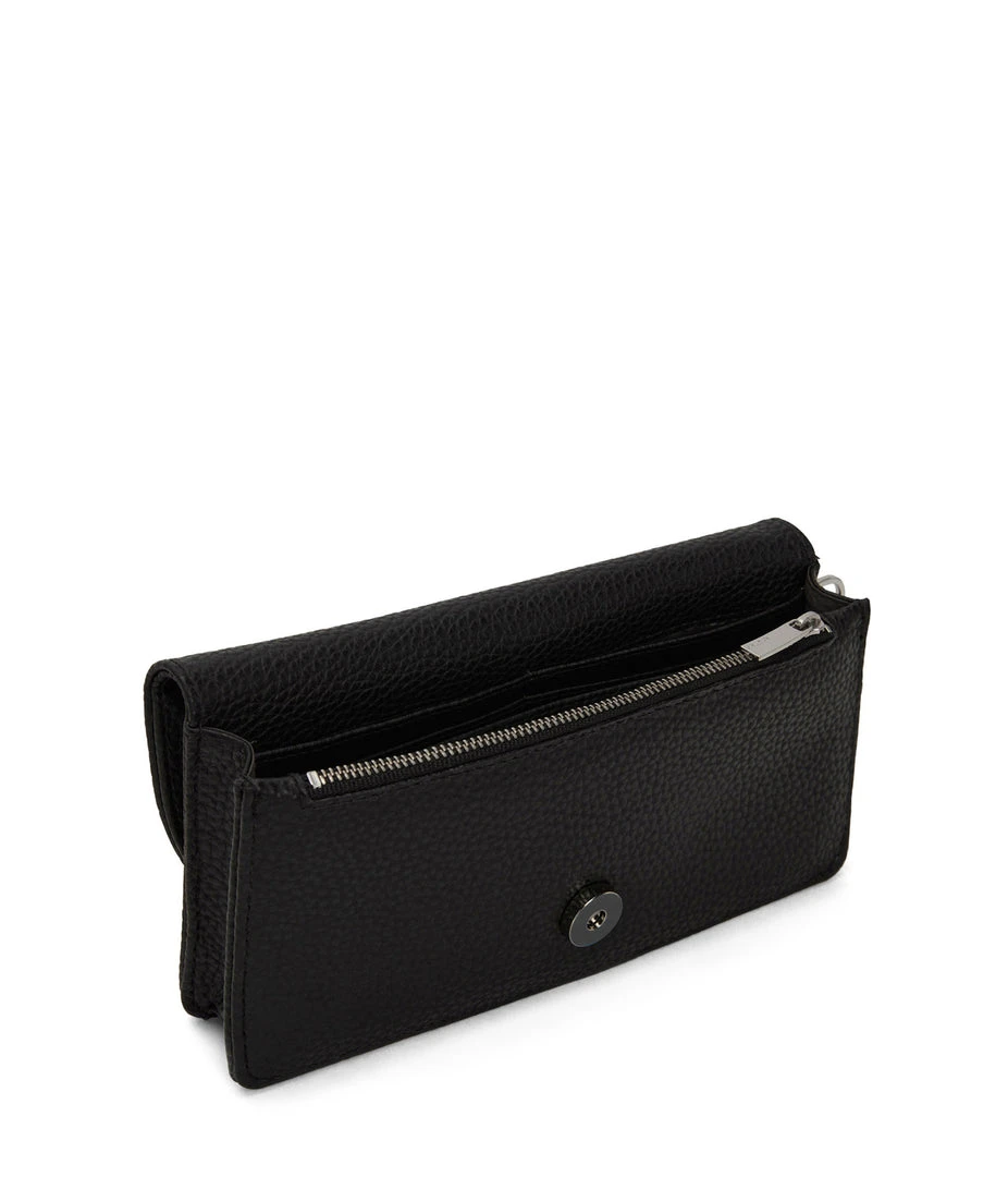 Wallet with a removable wristlet, flap closure, and zippered pocket at the front panel top. Fits an iPhone 11 Pro Max.