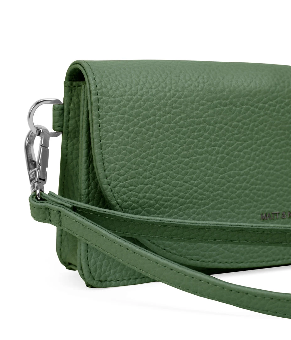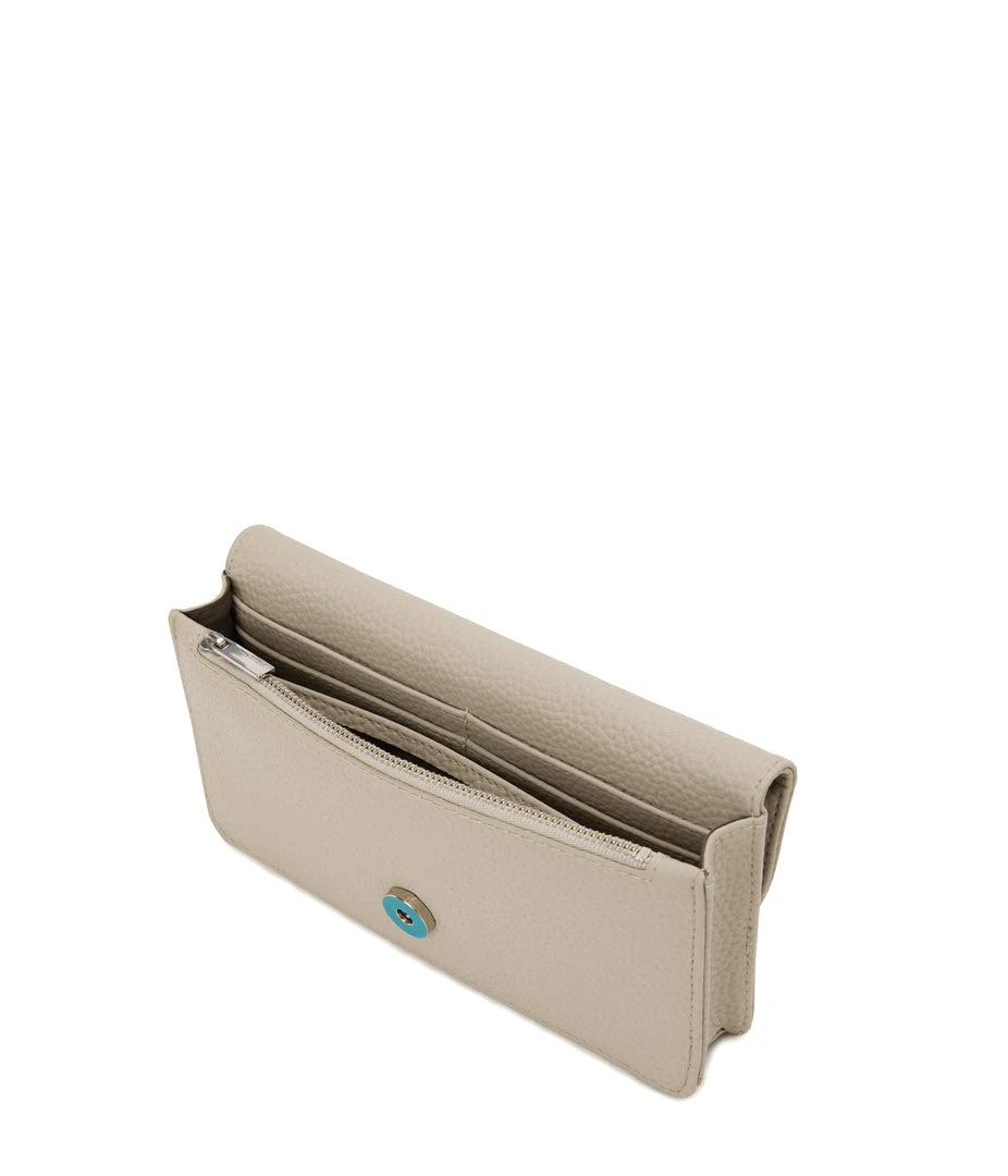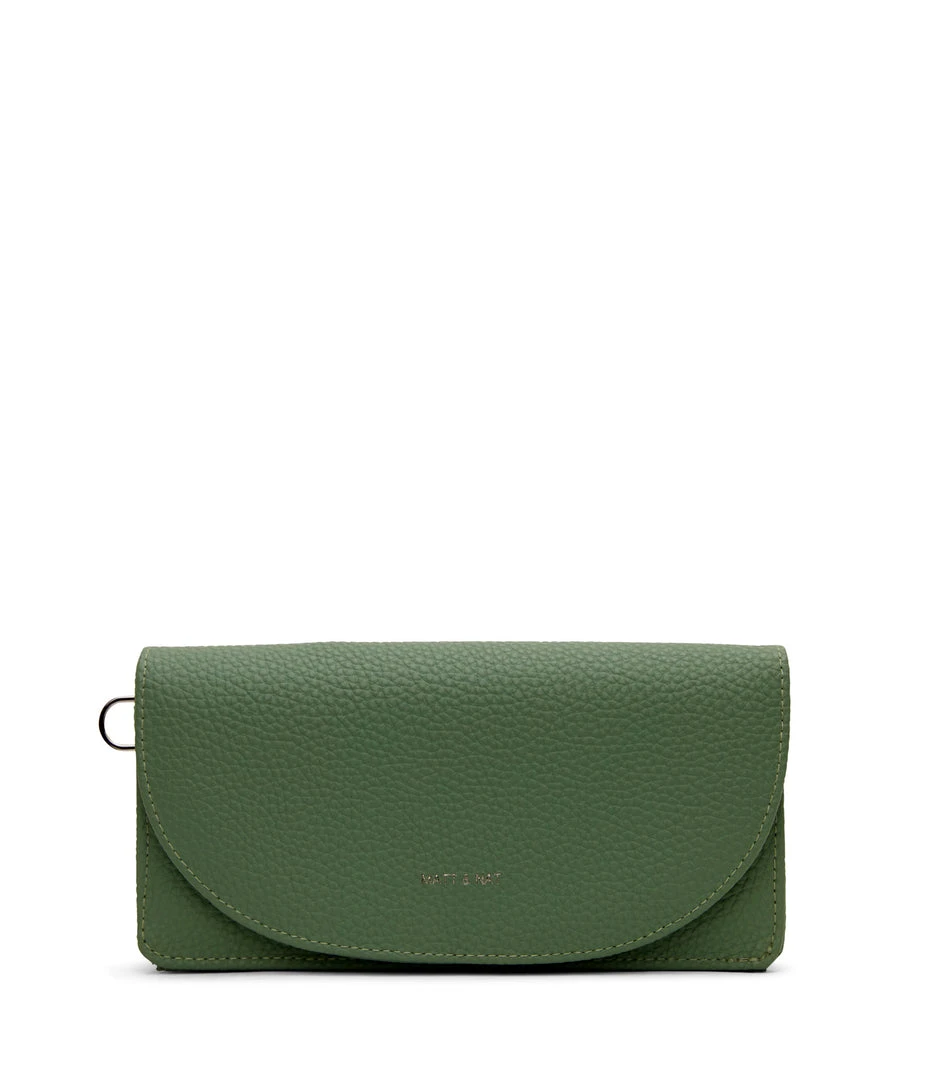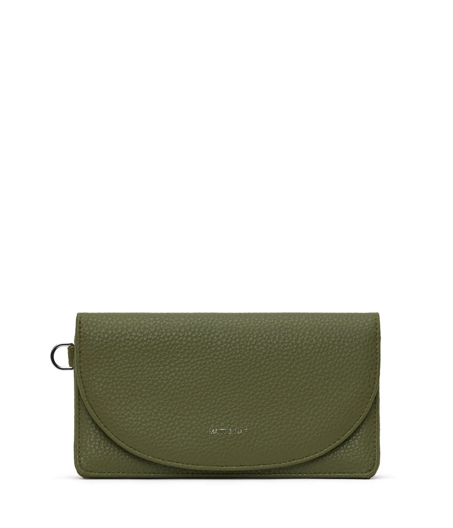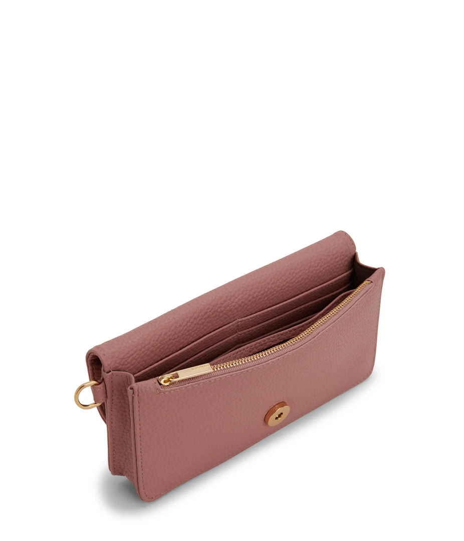 Wallet with a removable wristlet, flap closure, and zippered pocket at the front panel top. Fits an iPhone 11 Pro Max.