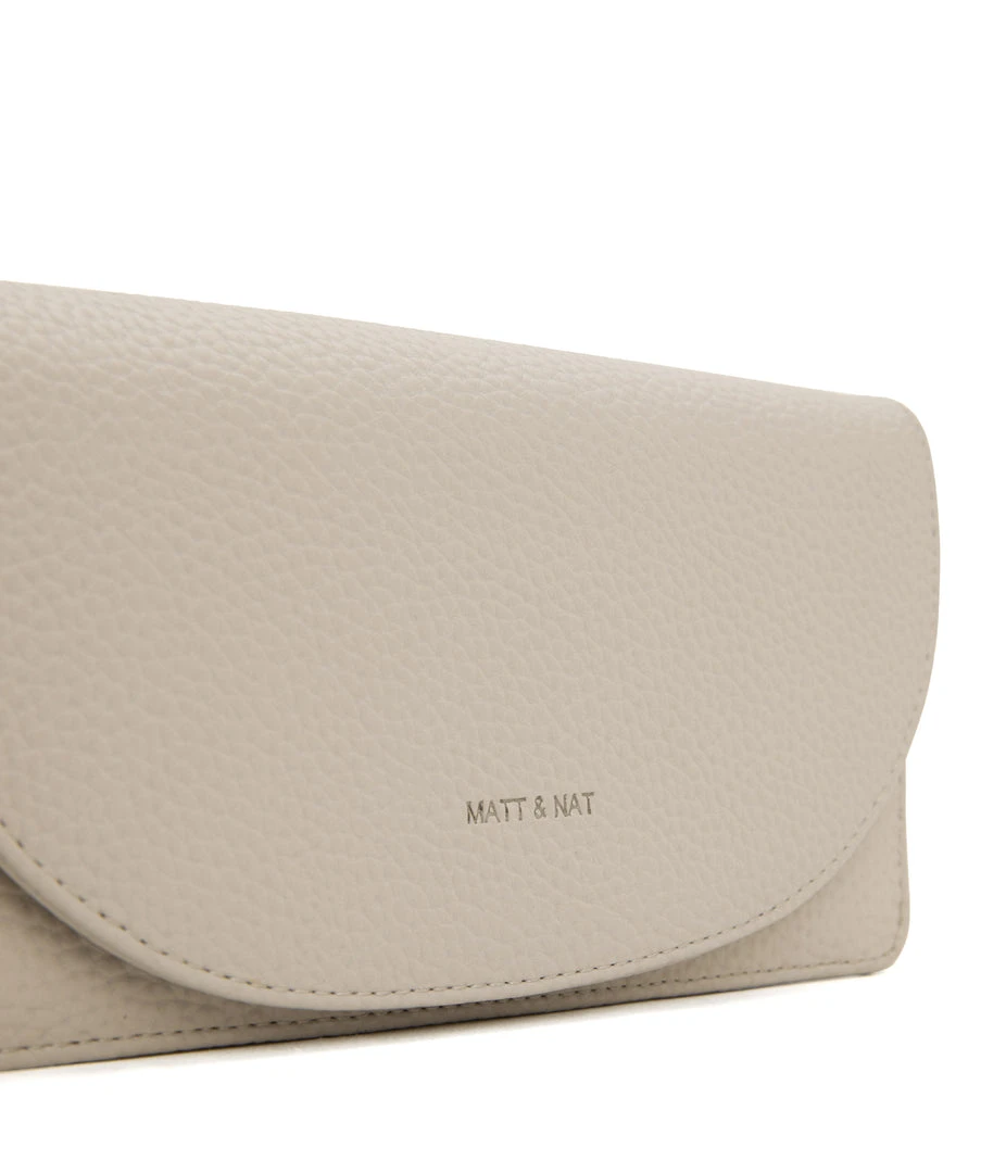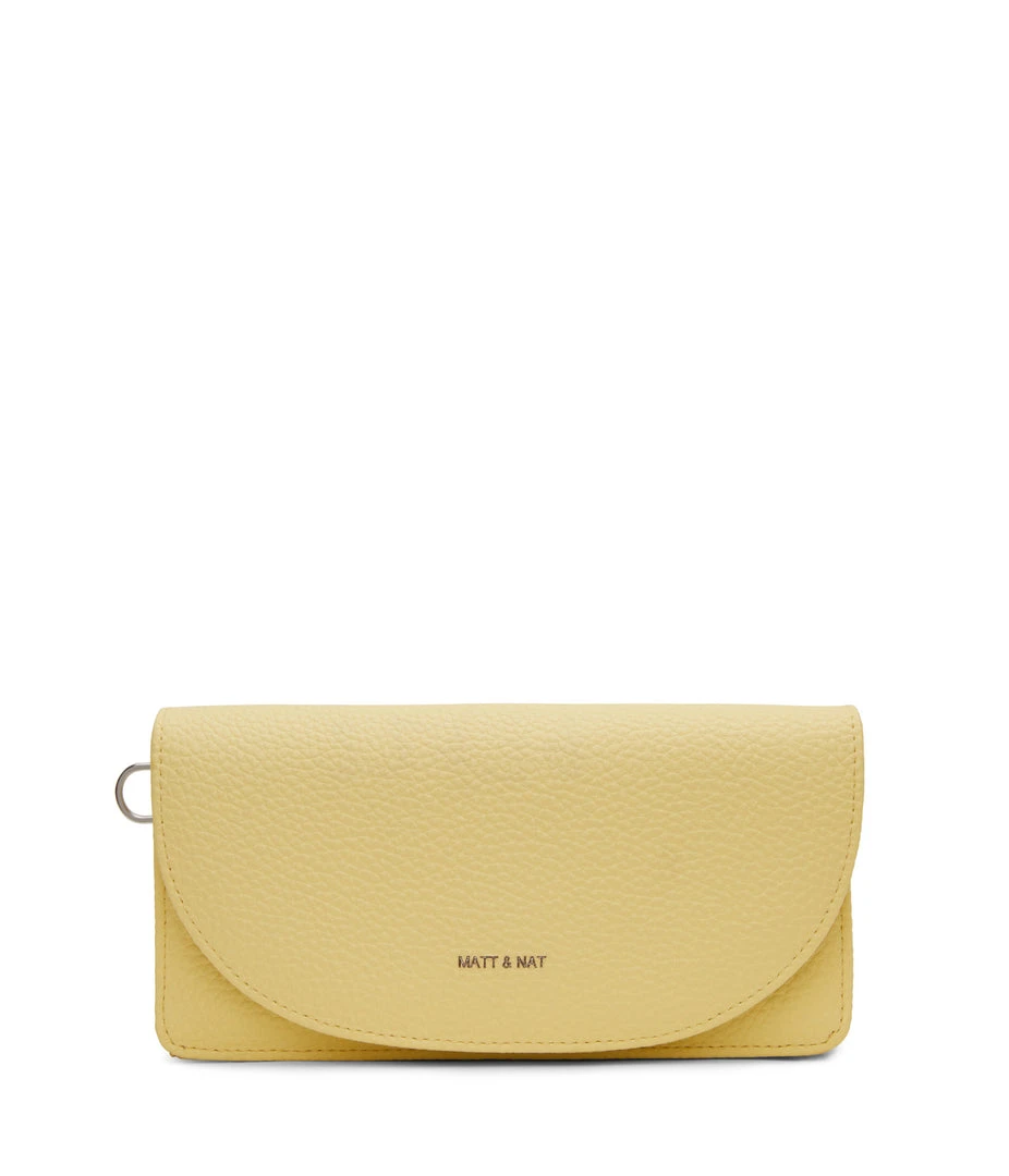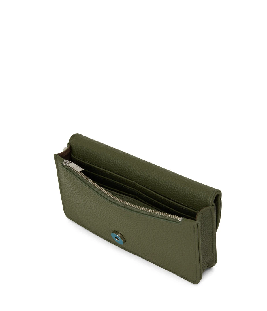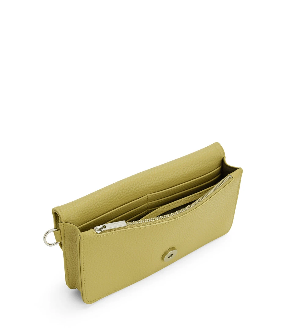 Wallet with a removable wristlet, flap closure, and zippered pocket at the front panel top. Fits an iPhone 11 Pro Max.