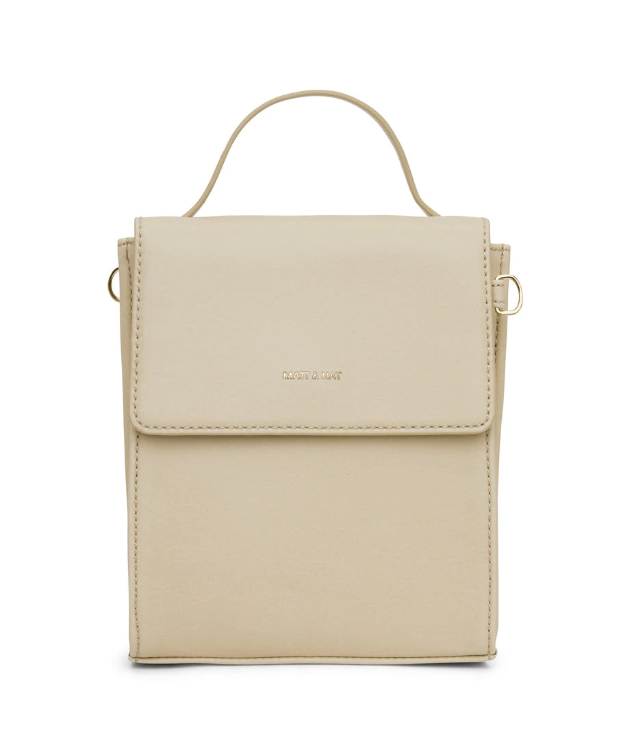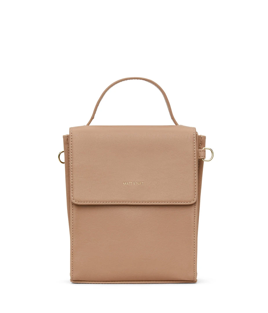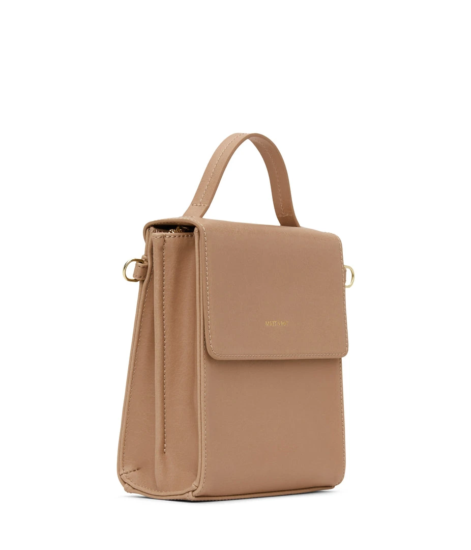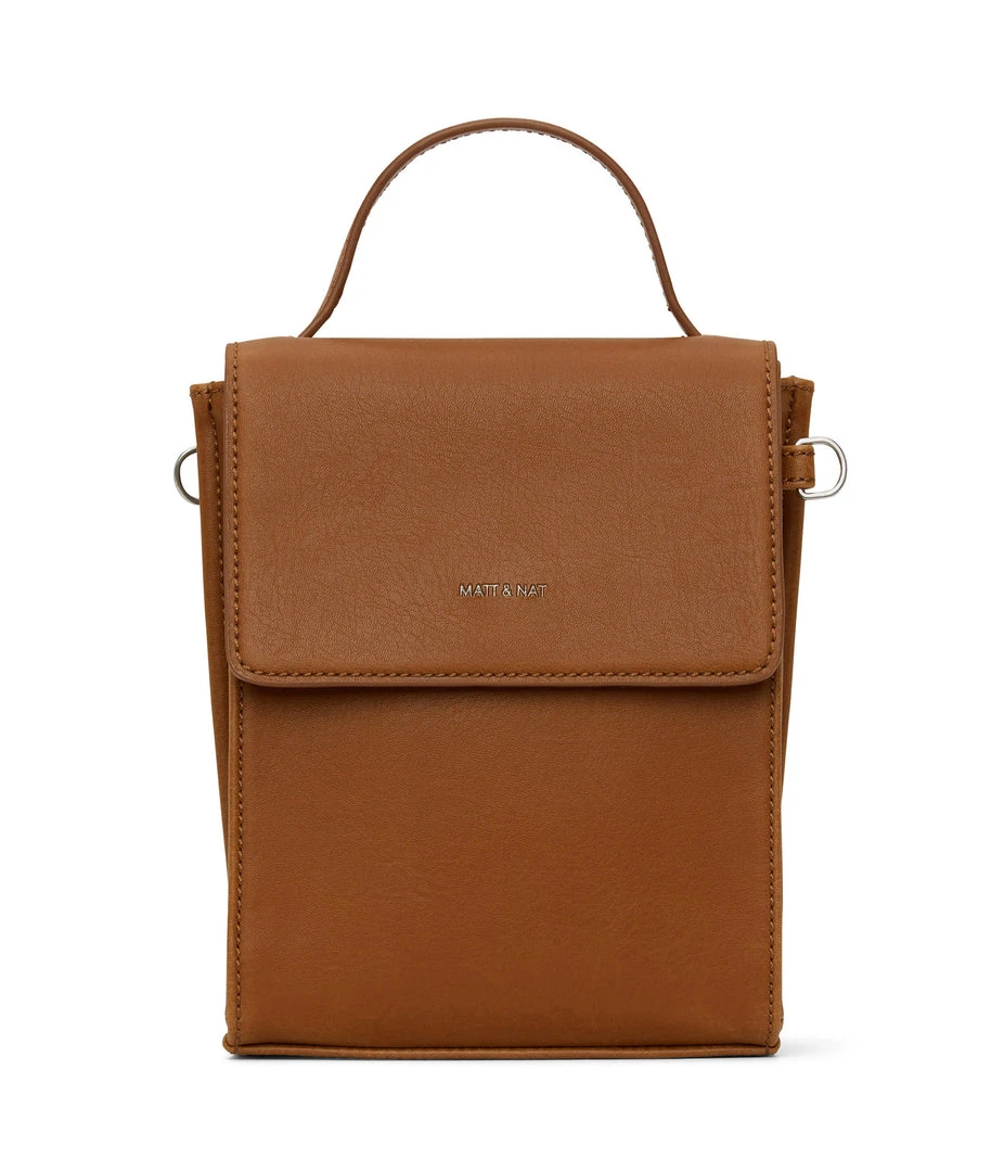 Crossbody bag with triple compartment interior, flap closure with magnetic snap, and top handle to hand-carry. The crossbody strap is adjustable and detachable.